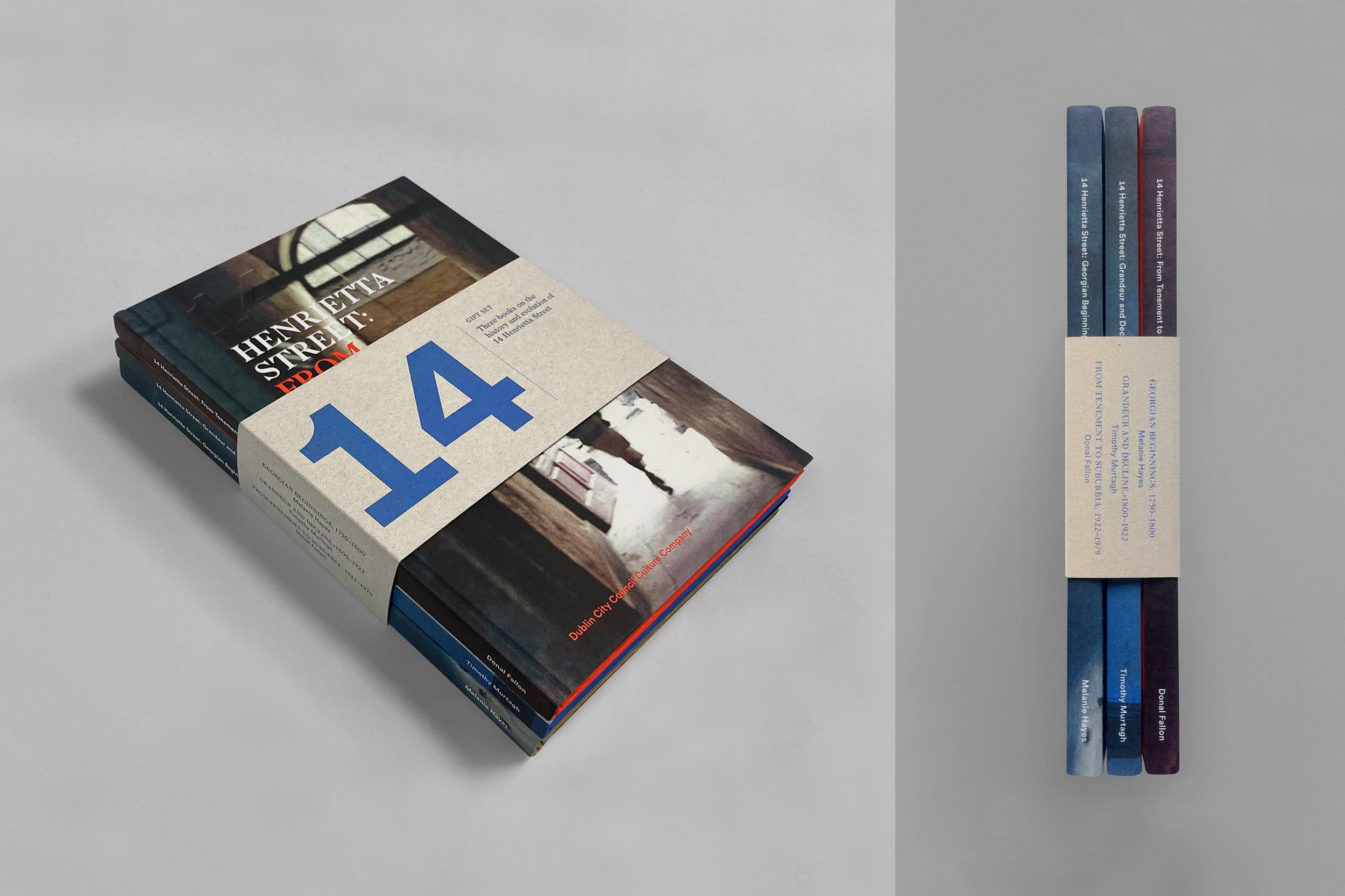 An abundance of visual character is etched into the walls and surfaces at 14 Henrietta Street. The deep relief deboss of the title on the covers subtly references the endurance of these physical interventions. Similarly, the vibrant accent colours, used throughout each volume, reference the decorative palettes that define the distinct periods of the building’s history – grandeur, decline and new beginnings.
