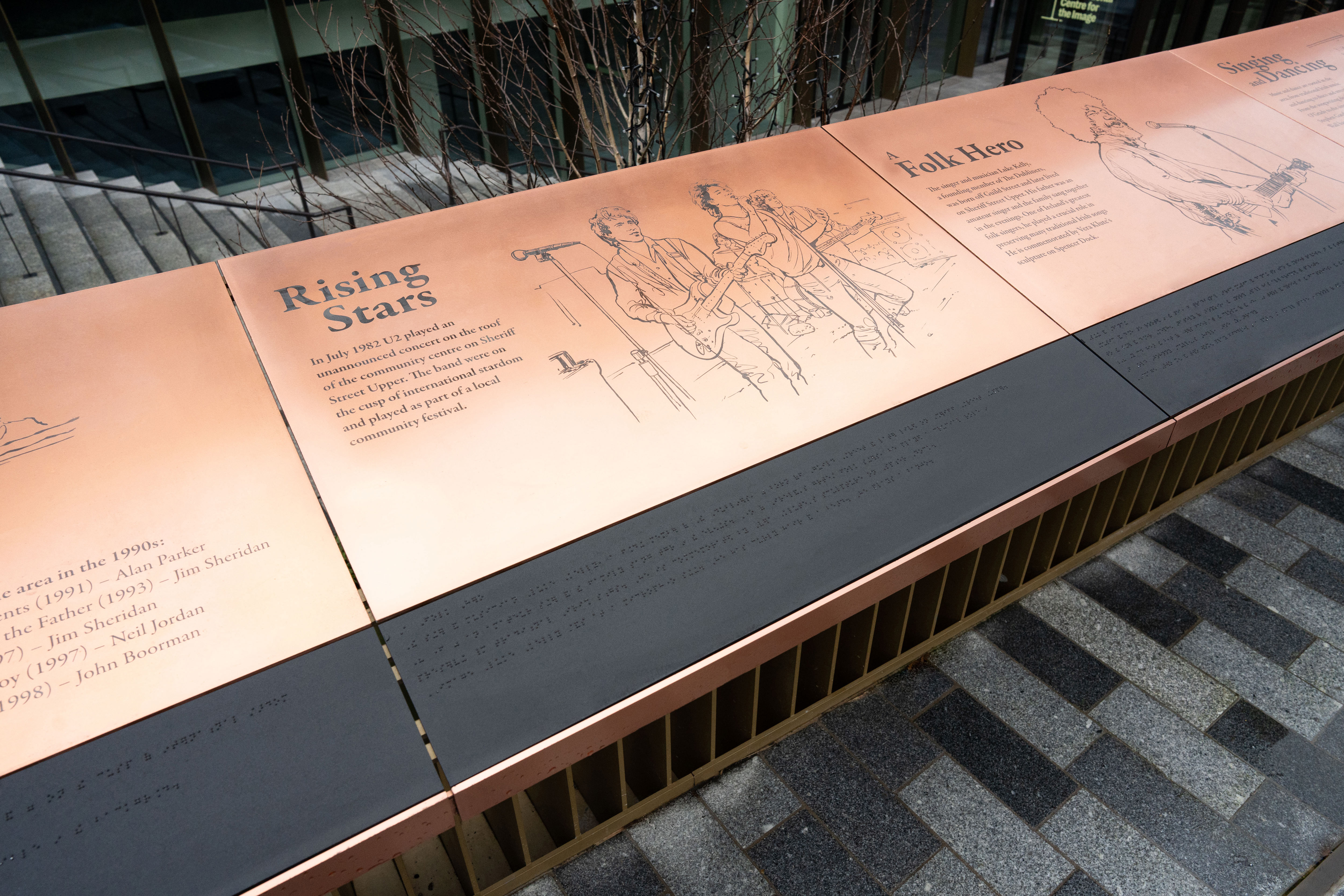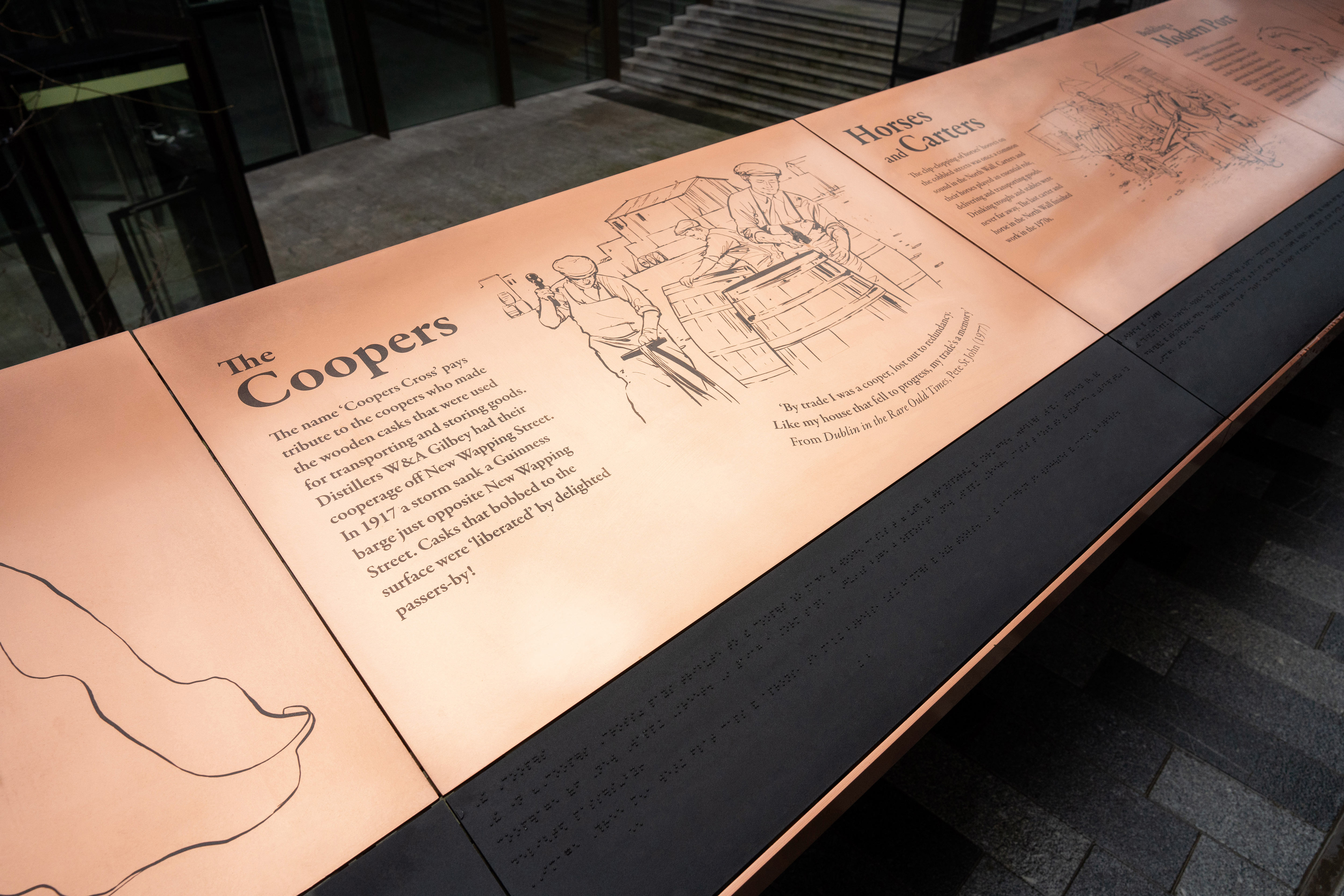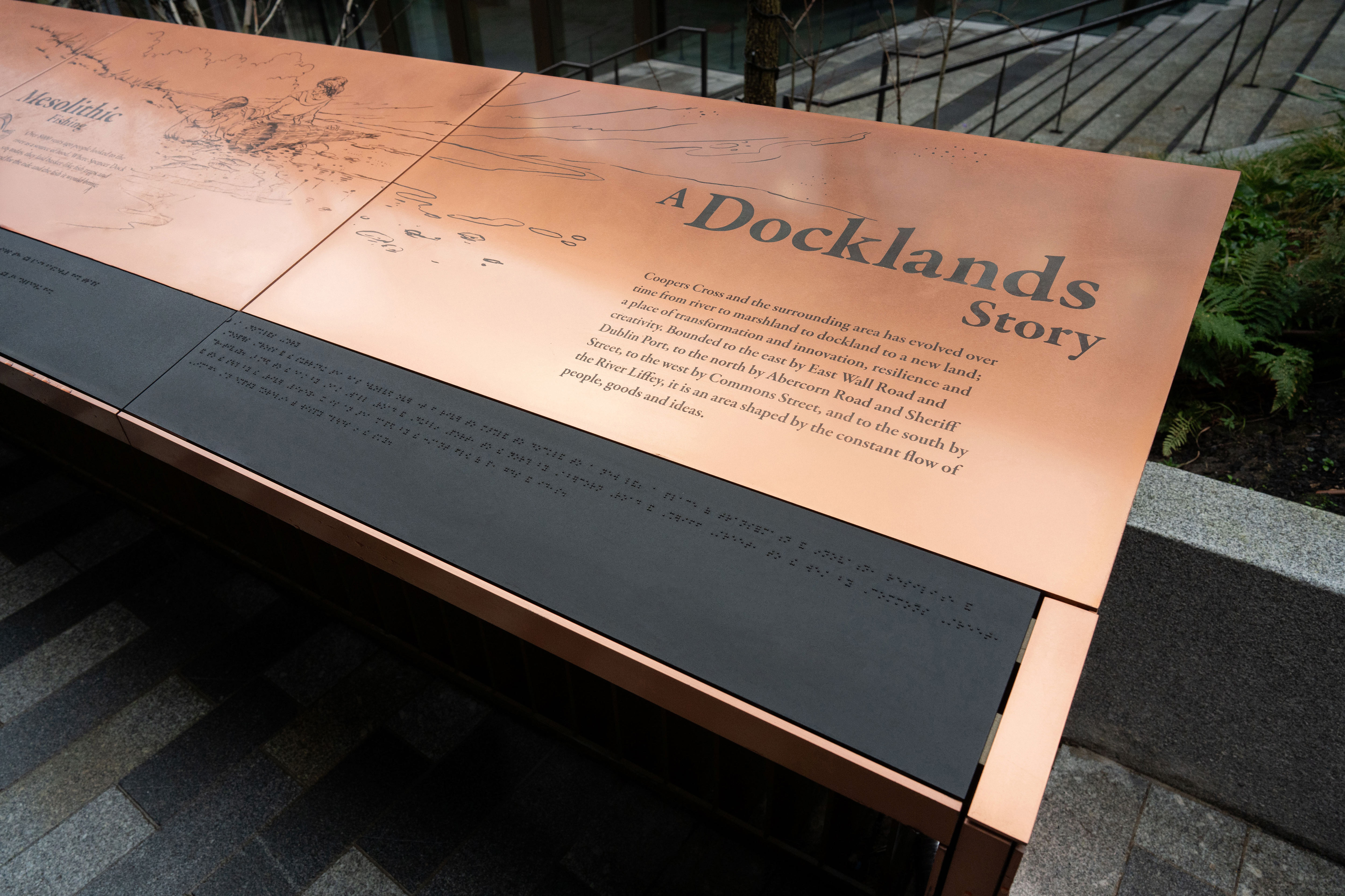 A Docklands Story is a permanent public art installation forming an interpretive pathway through Coopers Cross in Dublin’s North Docklands. Conceived as a 60-metre illustrated copper timeline, the project traces the evolution of the site from Mesolithic fishing place to the present day, translating a layered social, cultural and environmental history into an accessible outdoor experience for audiences of all ages. At its core is a simple message: this place has always been shaped by its relationship with the river, and by the industries and communities that grew around it. Key to the brief was the installation's role in connecting key public spaces across the development, drawing visitors into the site through a sequence of micro-stories rooted in place identity, cultural memory and everyday life.