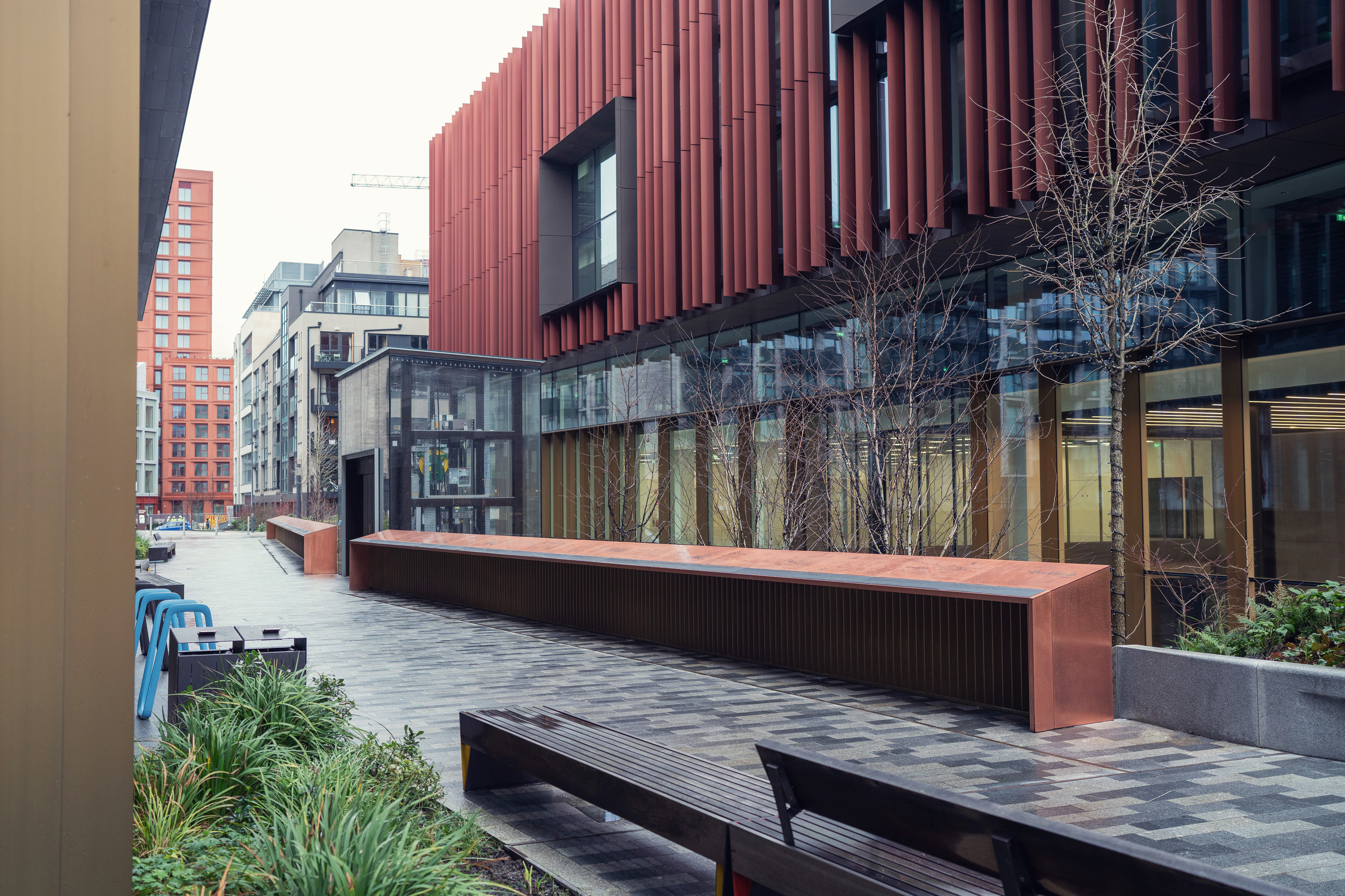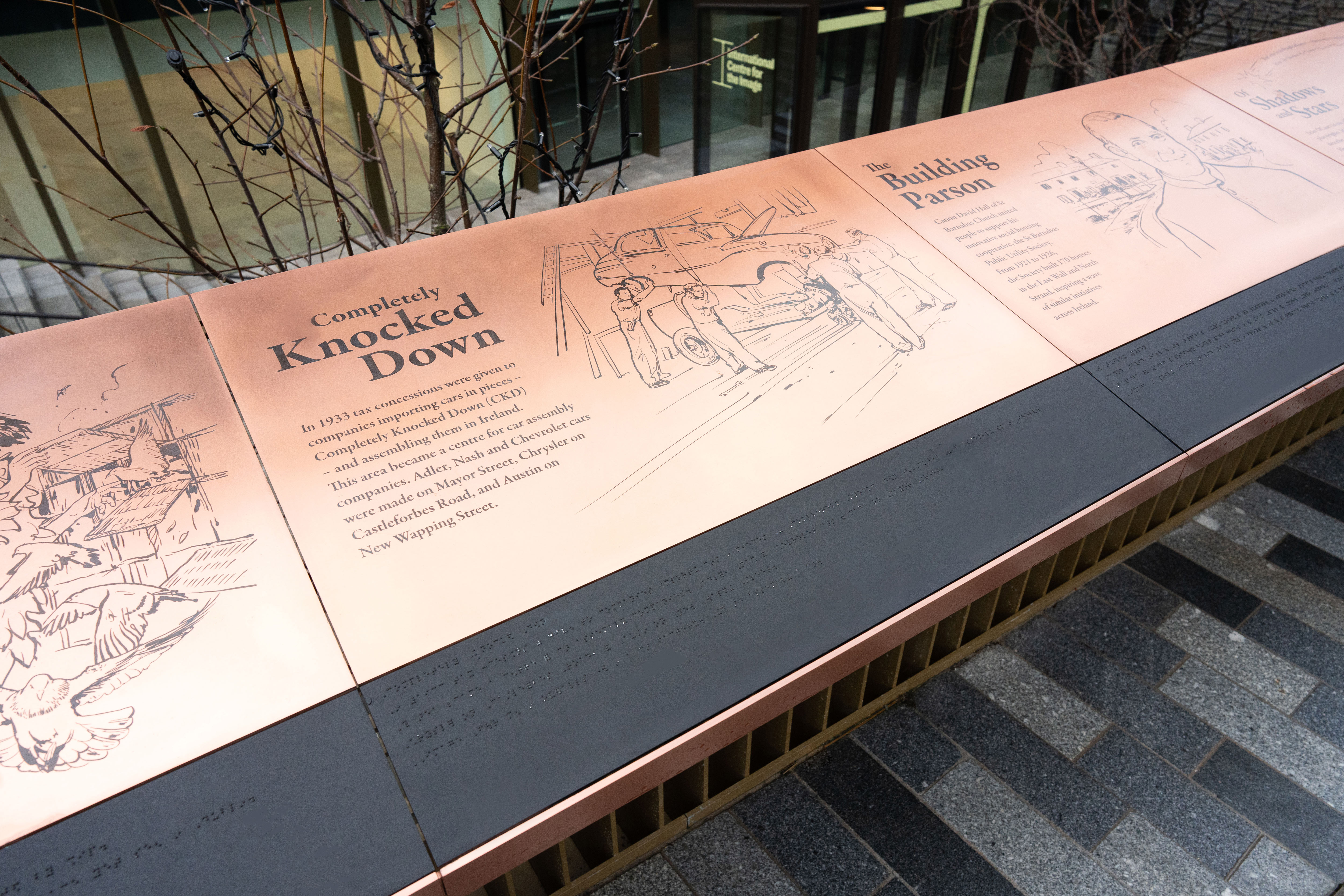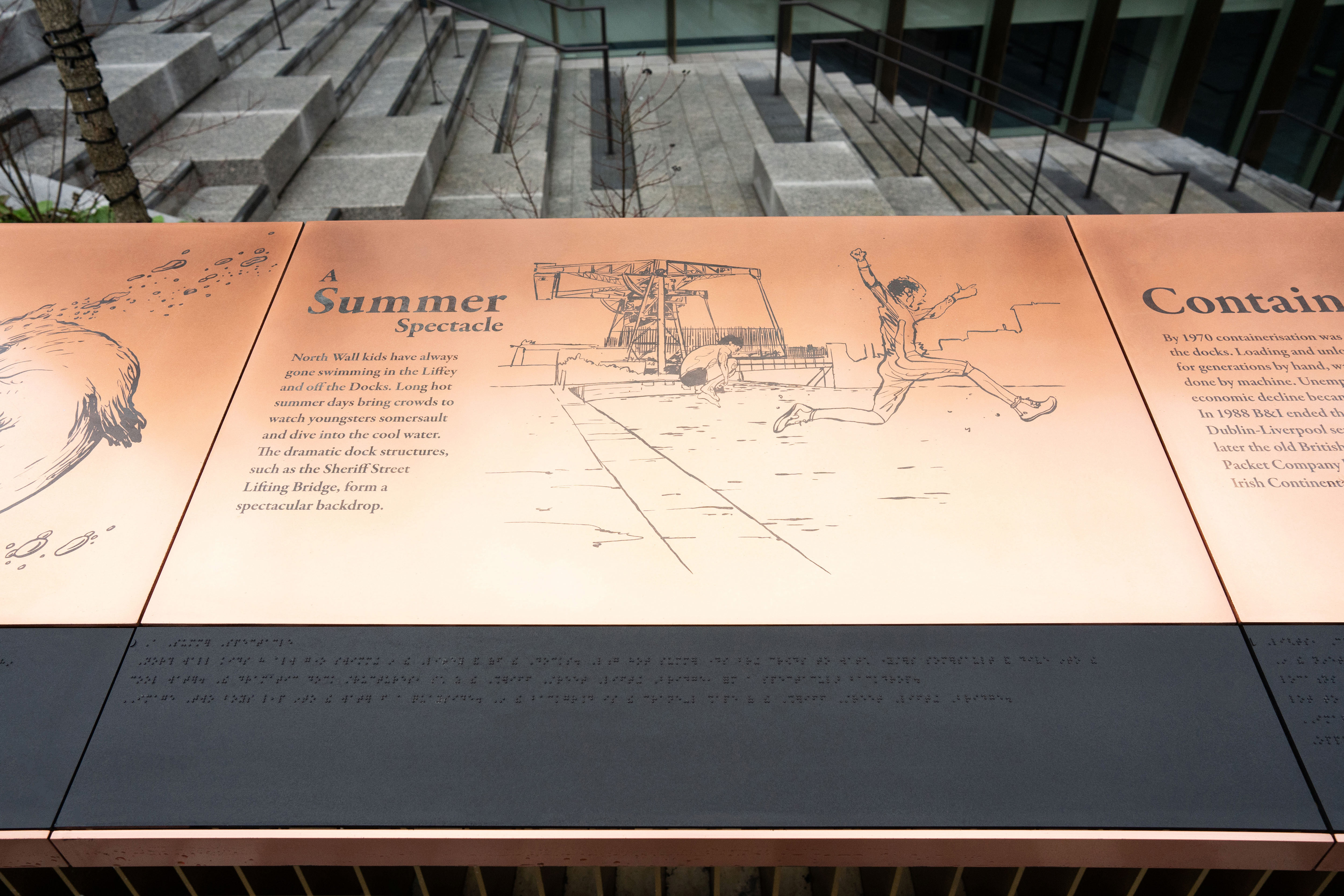 The project was developed through a multidisciplinary collaboration involving graphic design, illustration, writing and curatorial research, supported by local groups such as the East Wall History Group. Design development focused on balancing the design of the narrative and integrating storytelling across image and text, using the power of illustration to tell a story ‘with a thousand words’ when the word count was fifty per story. The copper balustrade and interpretive elements were conceived as durable, tactile components embedded within the public realm, creating a rhythmic sequence of information and pause points that encourage exploration and reflection. The pathway operates as both a connective route and a cultural layer, linking the development to its surrounding neighbourhood while embedding the histories of the Docklands into the everyday visitor experience of the place.