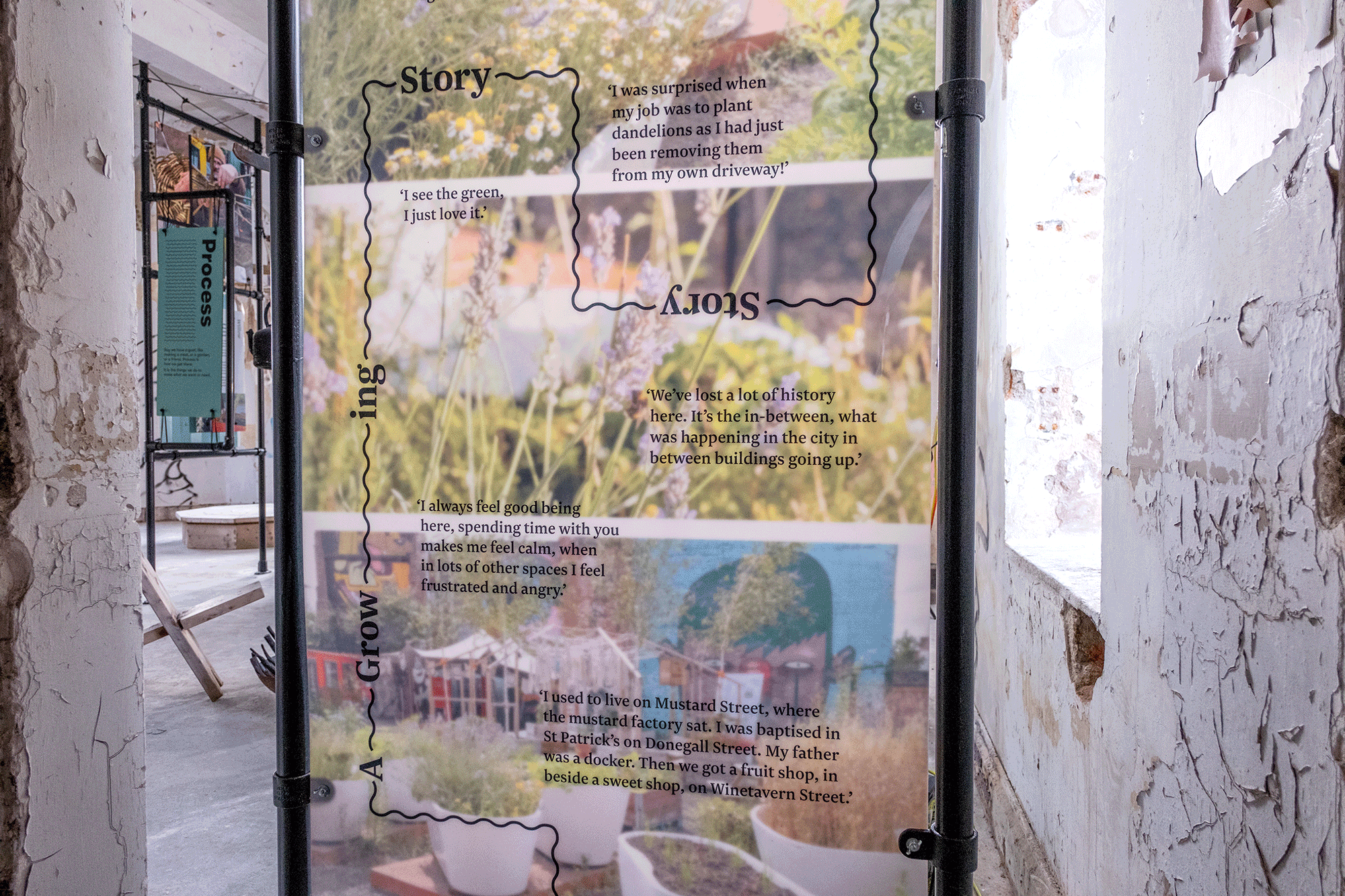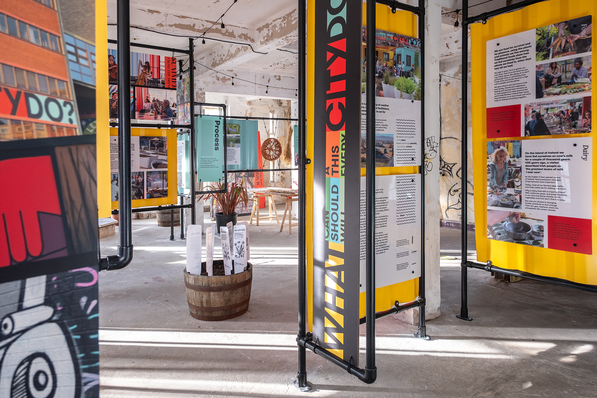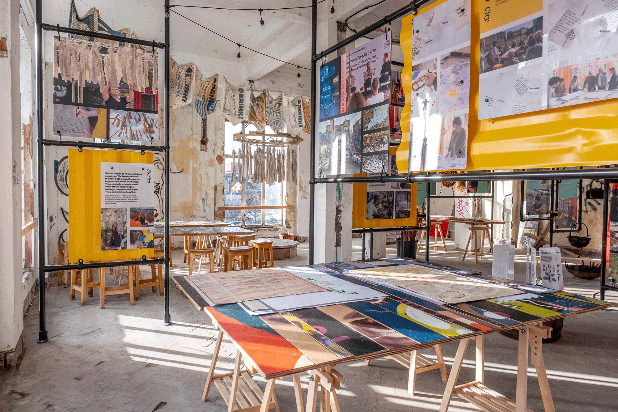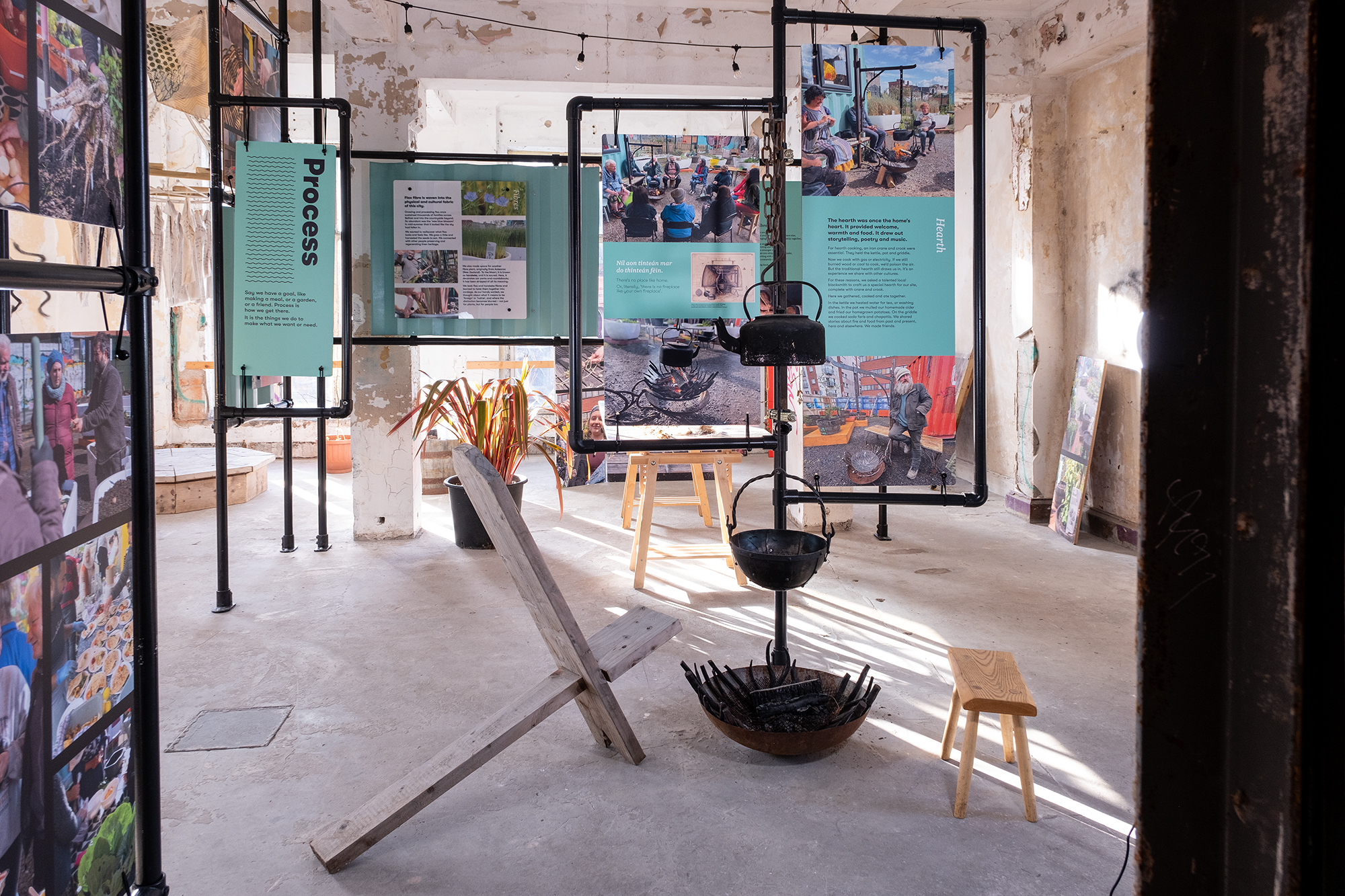 Brink!, quarto, and Grow NI, co-created A Growing Story as a place for meeting, listening, talking, learning and acting together. In this space – limited by dereliction, listed status, and pending plans for redevelopment – we reworked our project materials and concepts to adapt and build a sustainably focused simulacrum of the 18 month project. Scaffold poles became our free-standing framework, industrial container sheets (cut from our onsite project workshops to make windows and doors) became our information panels, street art hoarding became work tables, our cooking hearth became the metaphorical centre of our exhibition and allowed us to retell the stories of how we build community around food. The project and this exhibition is a rejection of dereliction and a challenge to rethink how we can make cities that work for people.