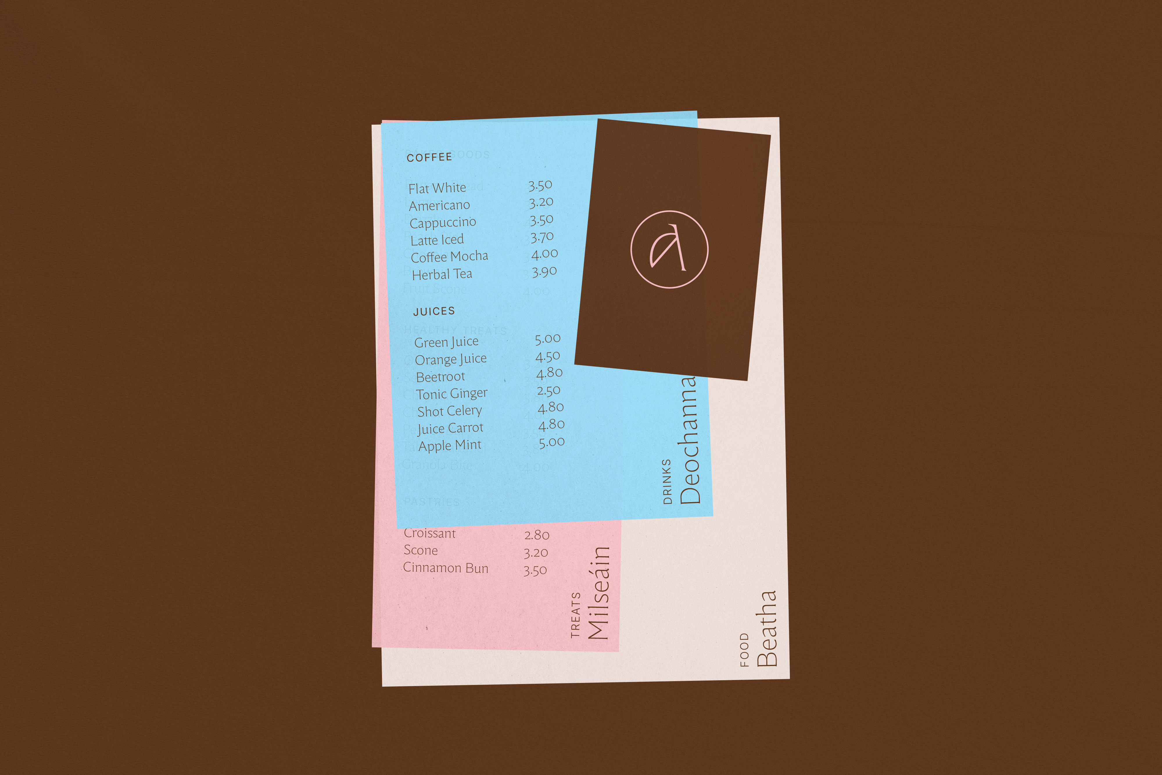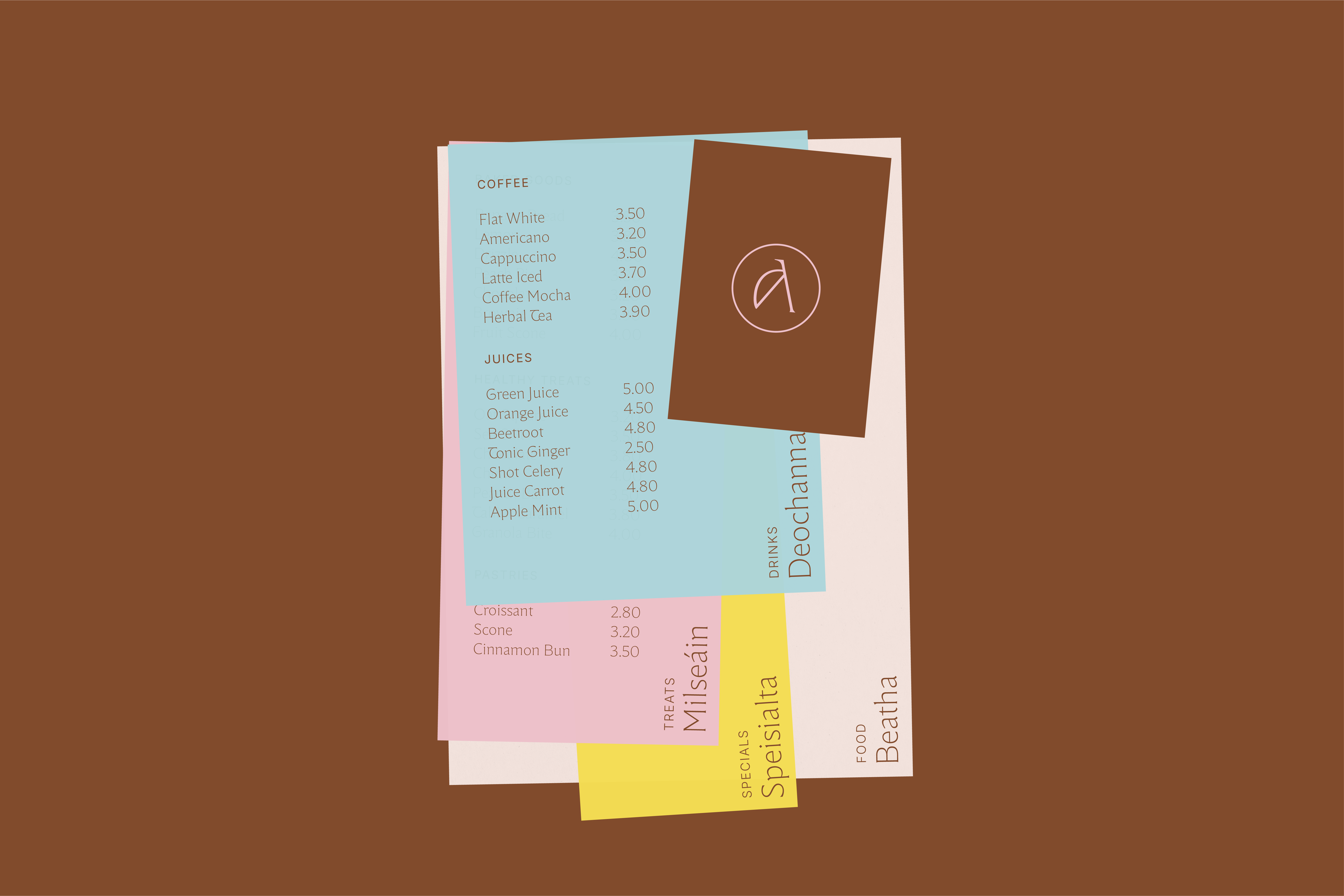 We looked at the landscape and wondered how we would catch peoples eye when passing by. Ireland has never been afraid of colour, and its usually used as a protest from the dull often dreary landscape. Flowers do it, popping up in bright yellow, pinks and blues, to stand out for punters against the brown and green. Traditional pubs and shops do it in contrast to the concrete streets. From this, we developed a colourful palette, all grounded in a rich brown.