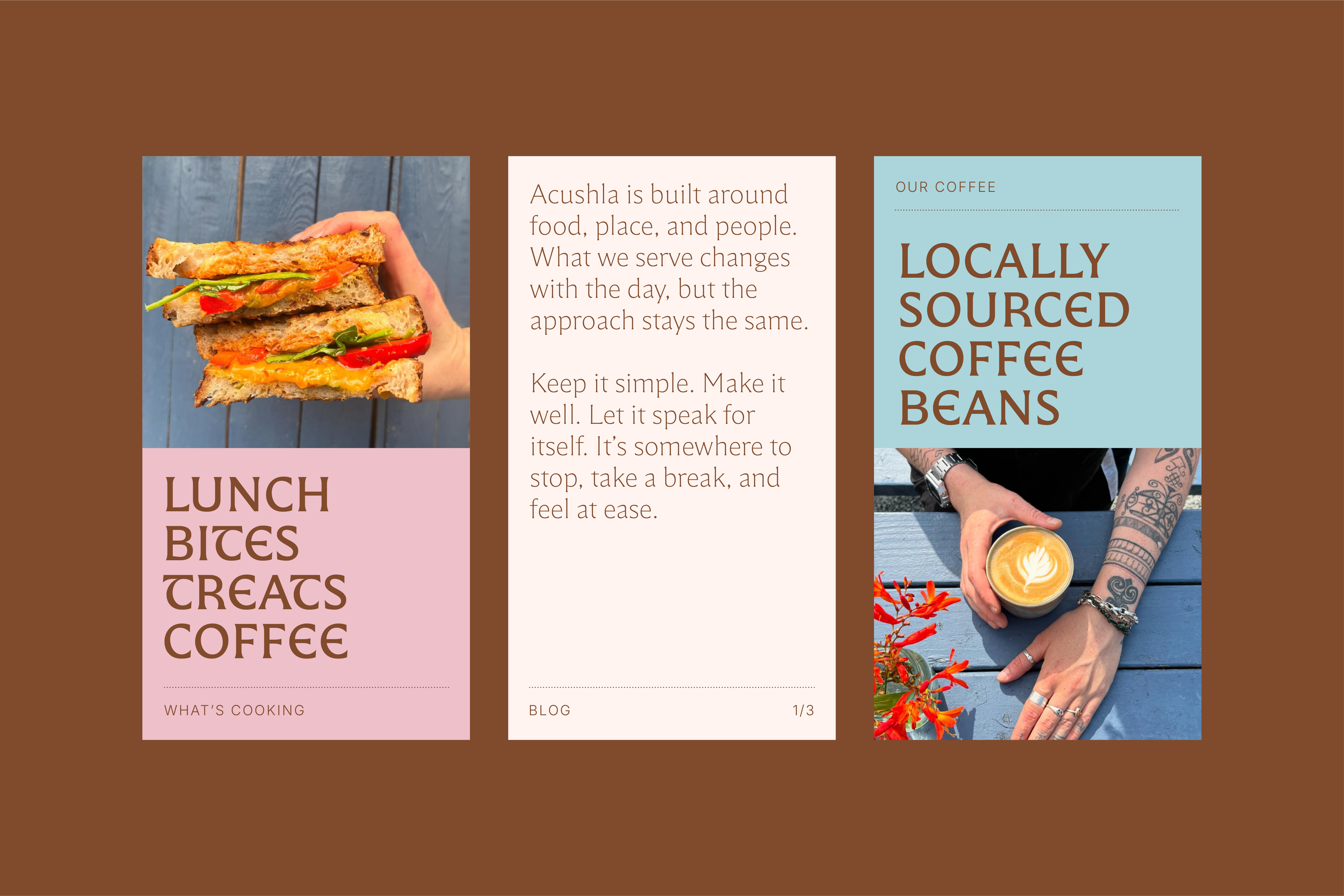 Ciara and Adara have created an incredibly welcoming place that feels true to who they are, with a strong sense of where it sits. Our aim was to create a brand that matched that feeling. To do this we looked at the name (Acushla), what it meant (my love), to them and to everyone who visits. The space is honest, warm, and friendly. People fresh off a hike tend to linger for a chat, and locals often gather when theres not much else to do.