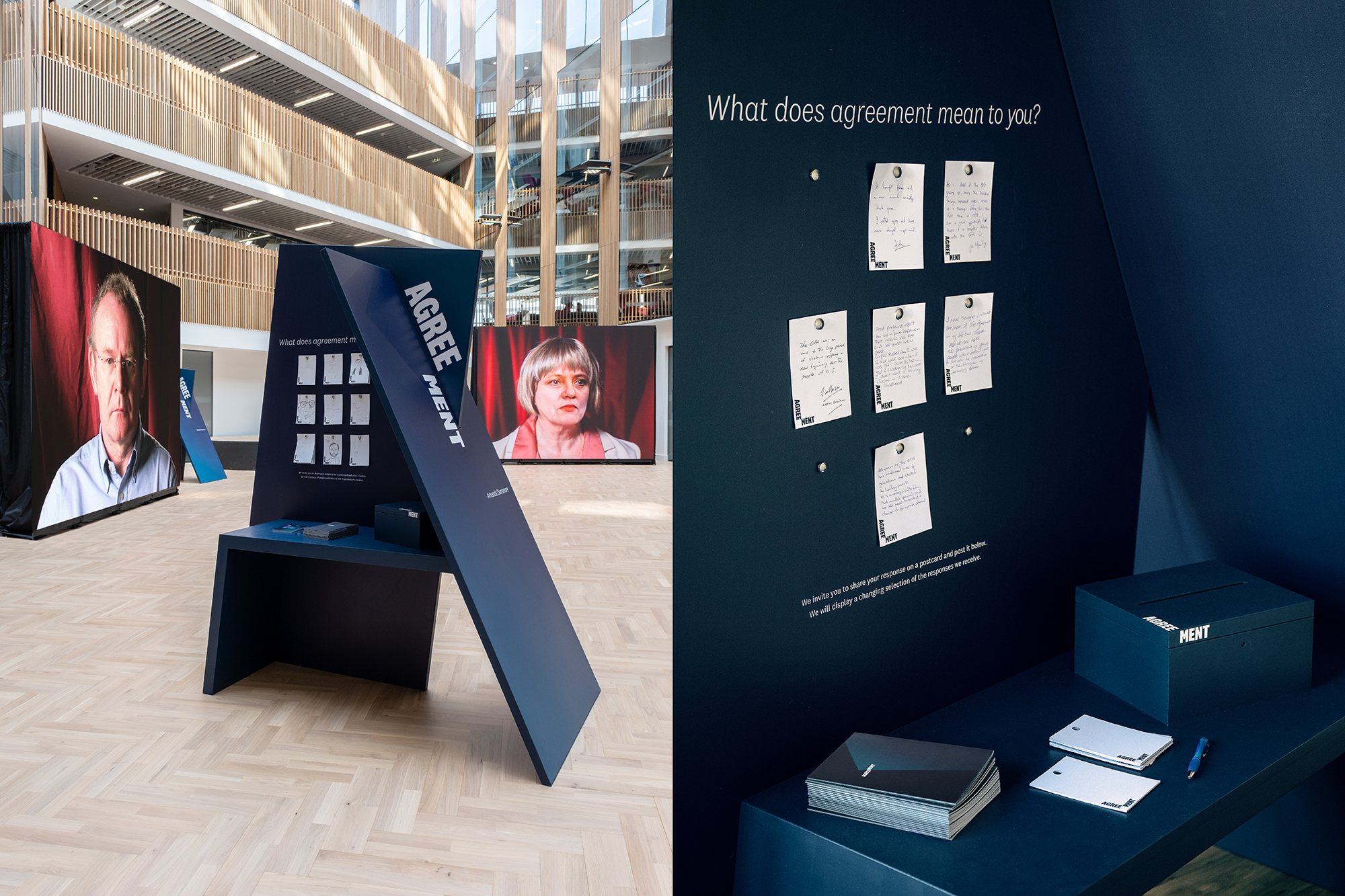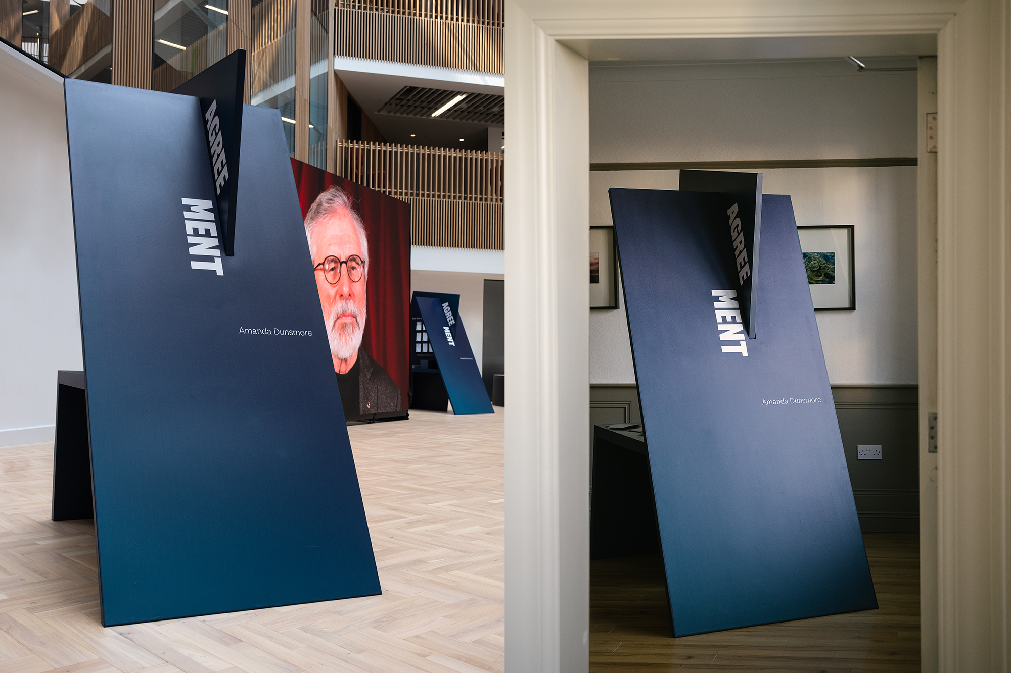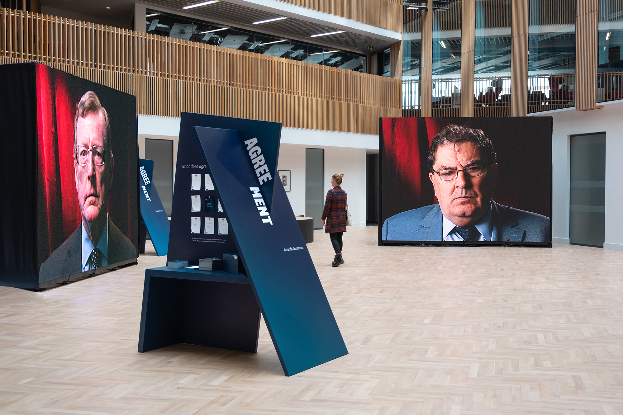 A unique artwork by Amanda Dunsmore, commissioned by Ulster Presents at Ulster University and made possible by the National Lottery Heritage Fund for the anniversary. Showing 14 silent video portraits of people involved in negotiating the Agreement, it is presented as a series – portraits alternating in relationship to each other, on three large screens.