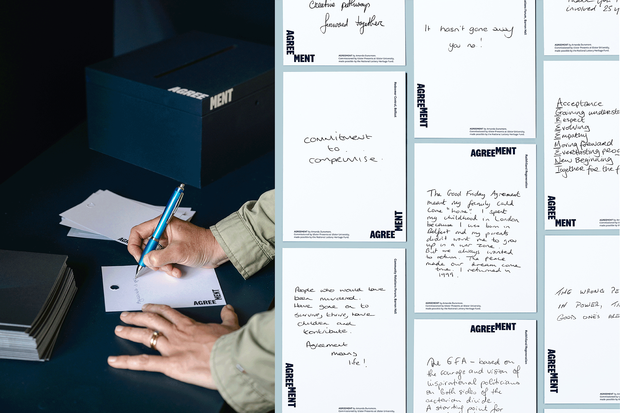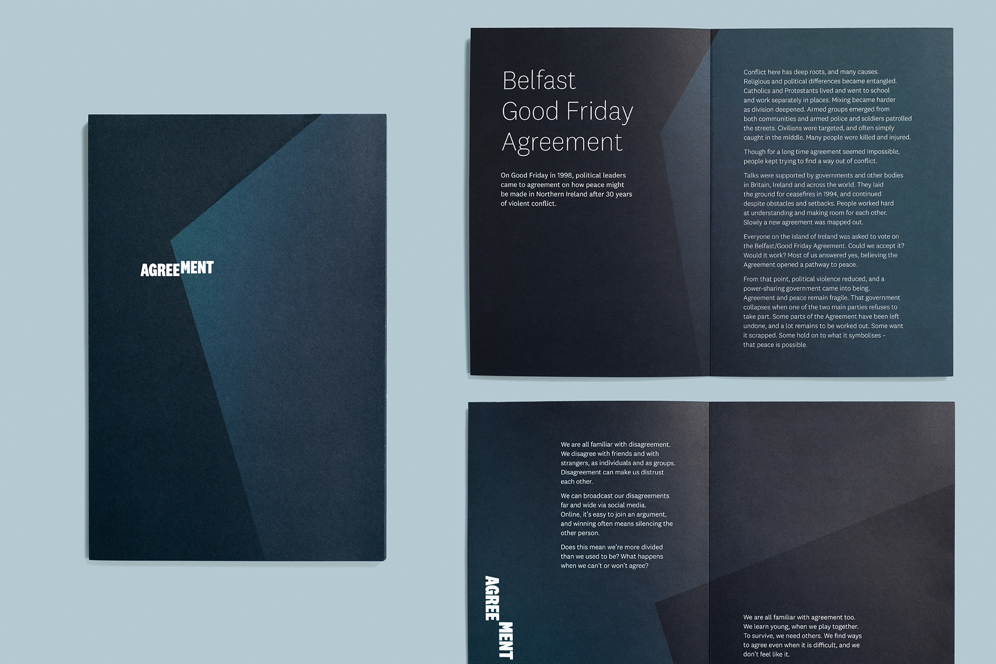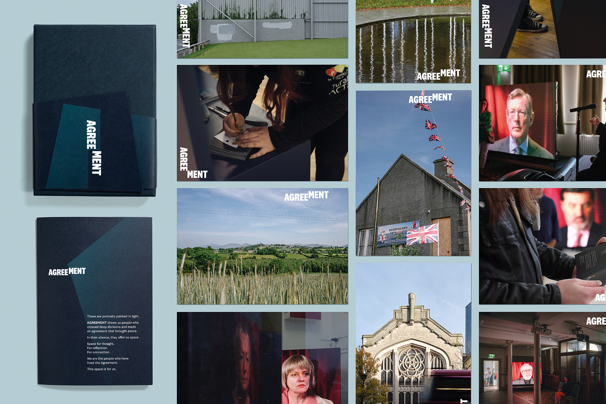 AGREEMENT journeyed across Northern Ireland, hosted by communities in Belfast, Derry/Londonderry, Rathfriland, Omagh and Glengormley. The artwork invited people into conversation, about what ‘agreement’ means to them. To facilitate this we created visual and physical structure that reflected the concept of an imperfect but pragmatic compromise. Security force colours bleed into new tones of identity, lines are both distinct and shifting. The word mark is fractured but held together in adaptive ways.