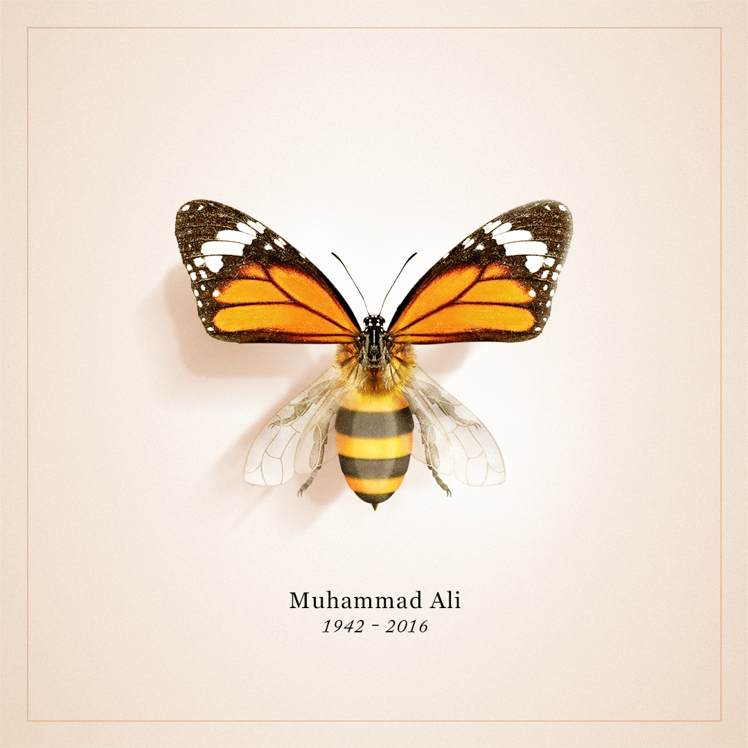 We wanted to create a piece that would sum up his incredible character and amazing ability. The solution was to take his inspirational quote "float like a butterfly sting like a bee", and visualise it in a way that was instantaneous to the viewer, while paying respect to Ali.