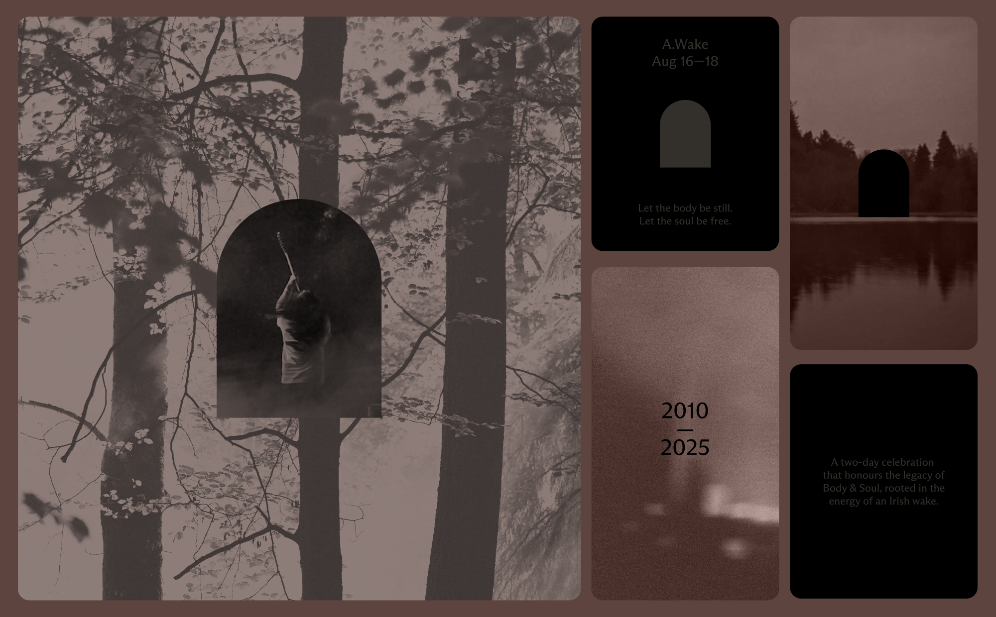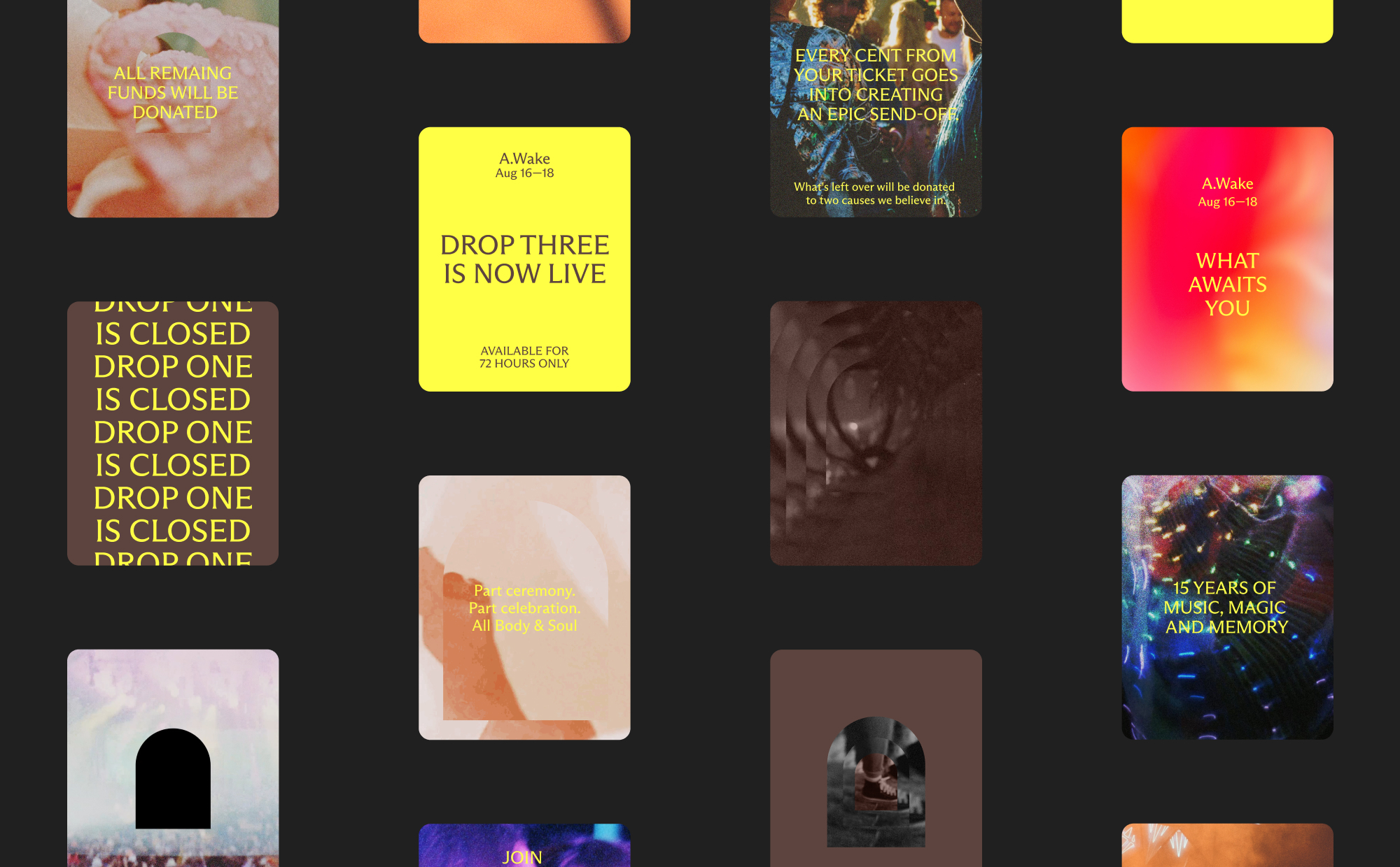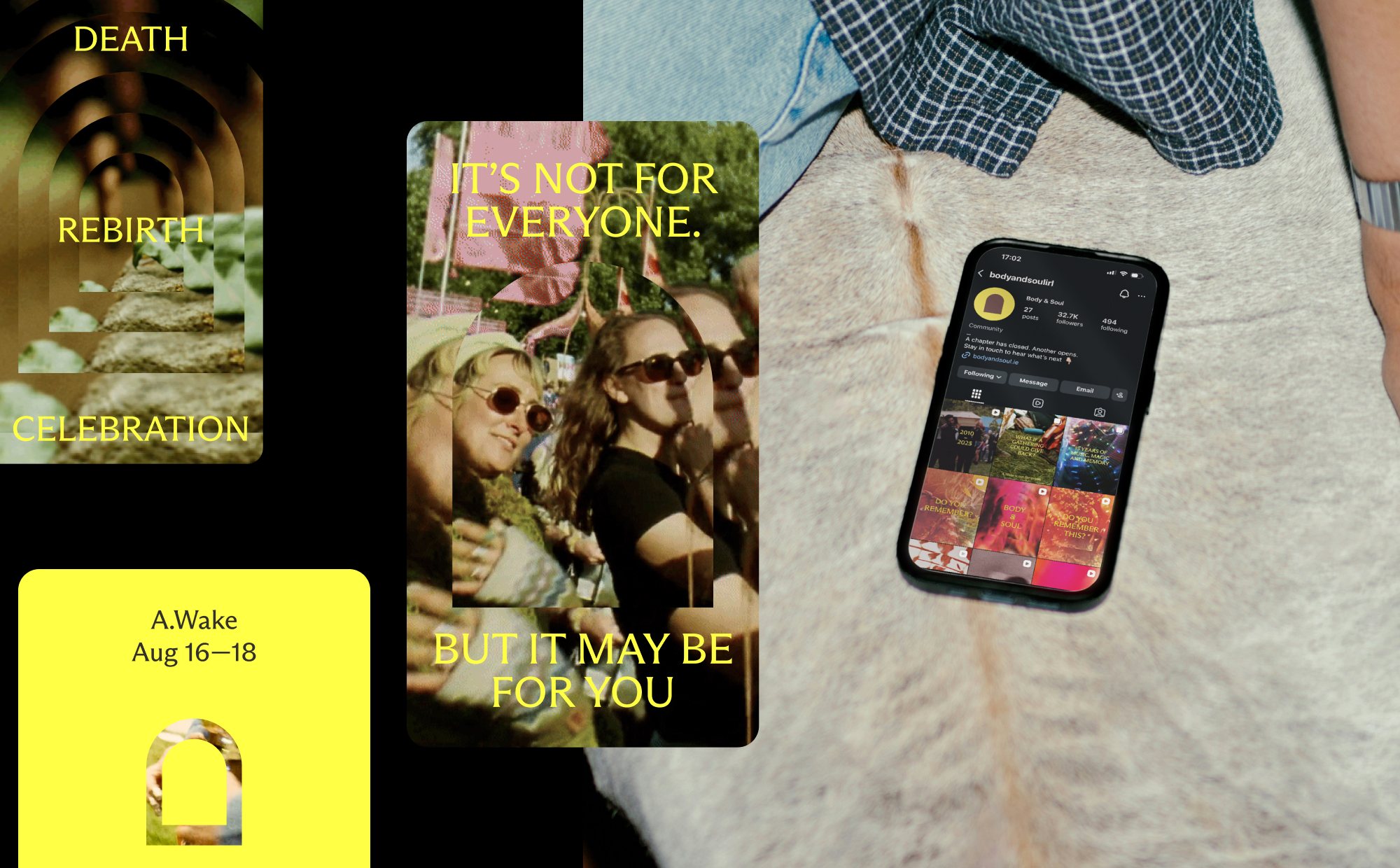 The visual identity used film and photography from previous festivals, playing with fragments of memory so people could see themselves reflected in the work. A portal device held everything together—beginning with sombre tones and static compositions, then gradually becoming more colourful, dynamic and layered as the campaign evolved toward the event itself. The approach divided opinion—some questioned a festival with no headliners, while others understood it immediately. That tension reflected a central question: what makes a festival matter? The line-up or the people and community who gather? A.Wake sold out, the stories were burned and Body & Soul ended on its own terms (for now).