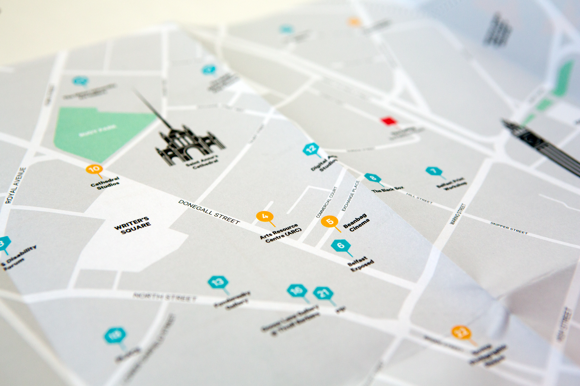 I worked closely with Belfast Visual Arts Forum to create an identity for the map that would appeal to tourists and local people who might not be as familiar with the art scene in Belfast, as well as those in the visual arts community who are eager to explore the scene further. I created a system for the map which would show central Belfast, with a more condensed grouping of places on one side, as well showing greater Belfast on the reverse, covering all other places to be included. We established a marker system and a key to differentiate between galleries with regular hours, places accessible by appointment only and public art that is accessible round the clock. I also illustrated a number of landmarks around the city, with the intention of providing easily recognisable points of reference on the map, helping to make the map as clear and easy to navigate as possible.