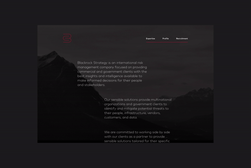 Identity and website for Blackrock Strategy, a Chicago based risk management firm who provide intelligence to multinational organisations and government clients in order to identify and mitigate potential threats to their people, infrastructure, vendors, customers, and data.