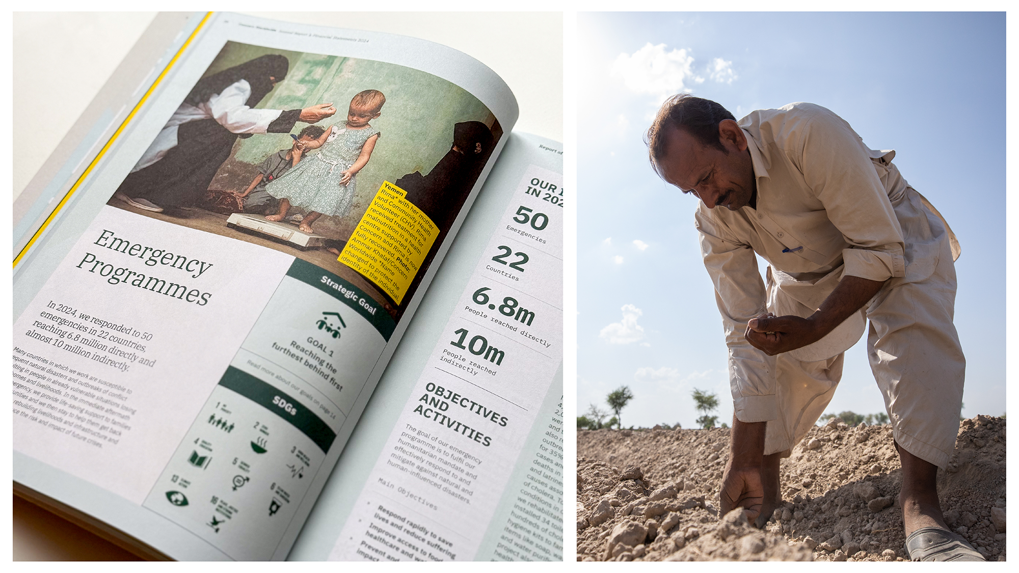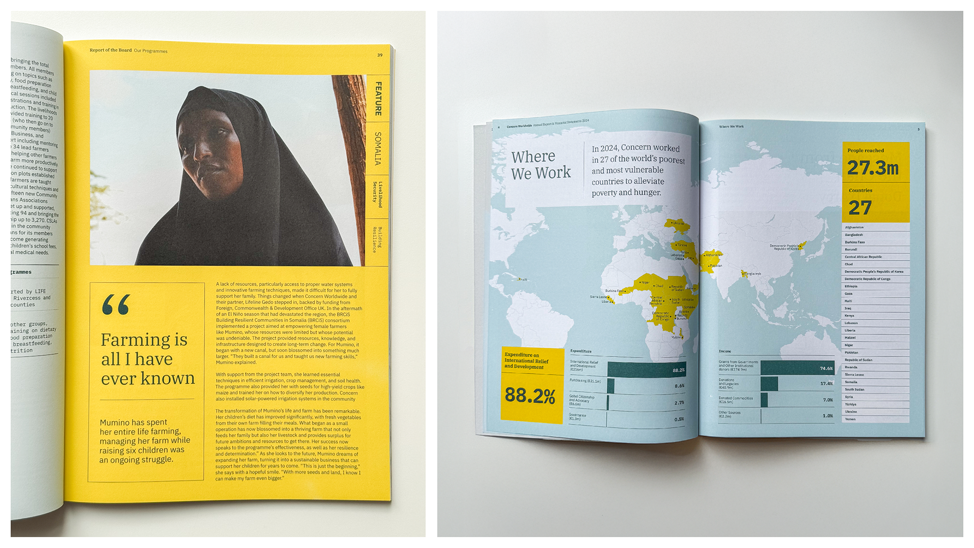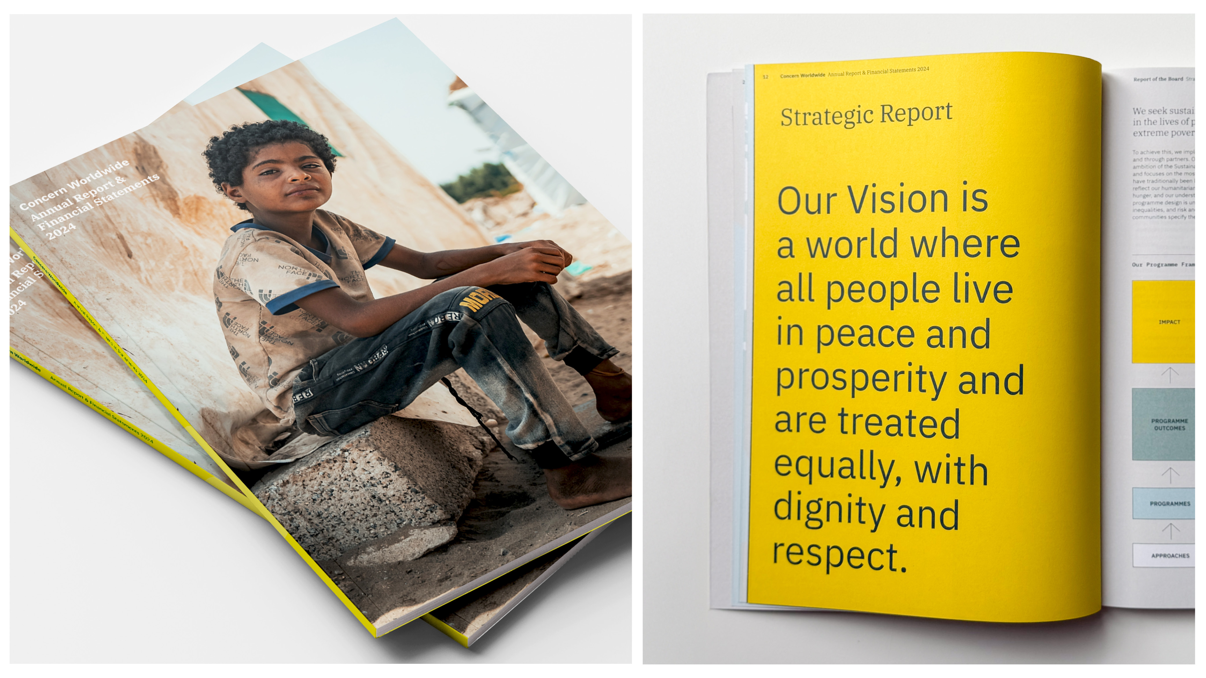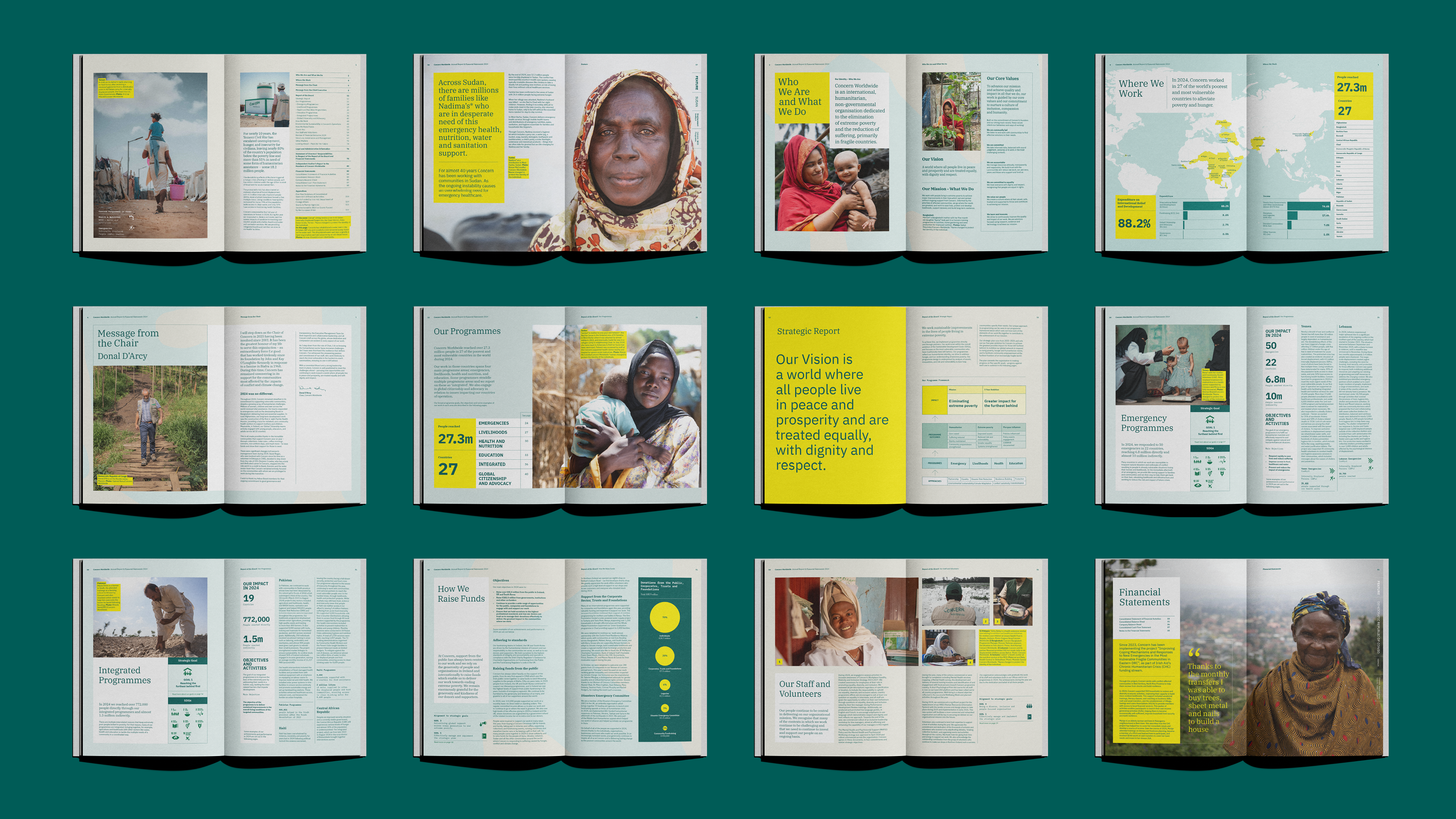 The report needed to reflect this complexity while remaining readable, navigable and grounded. Working within established brand parameters, the challenge was to create a clear editorial journey that could accommodate governance, financial reporting and detailed programme information, while also making space for the human stories that sit at the centre of Concern’s work.