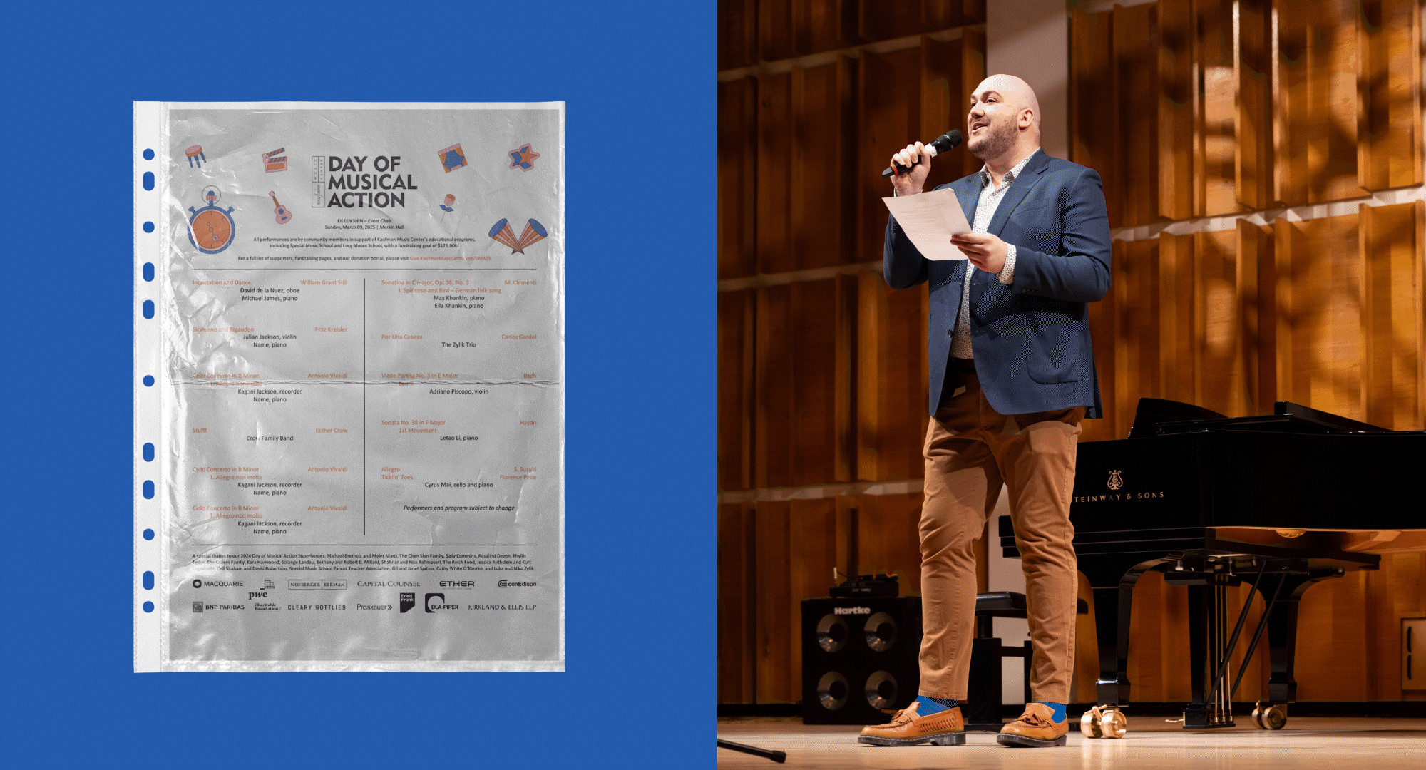 Kaufman Music Center is a non-profit organisation in New York City operating at the intersection of education, performance, and public service. The Day of Musical Action is its annual musical marathon, an event that invites people of all ages and musical abilities to fundraise for the Lucy Moses School.
