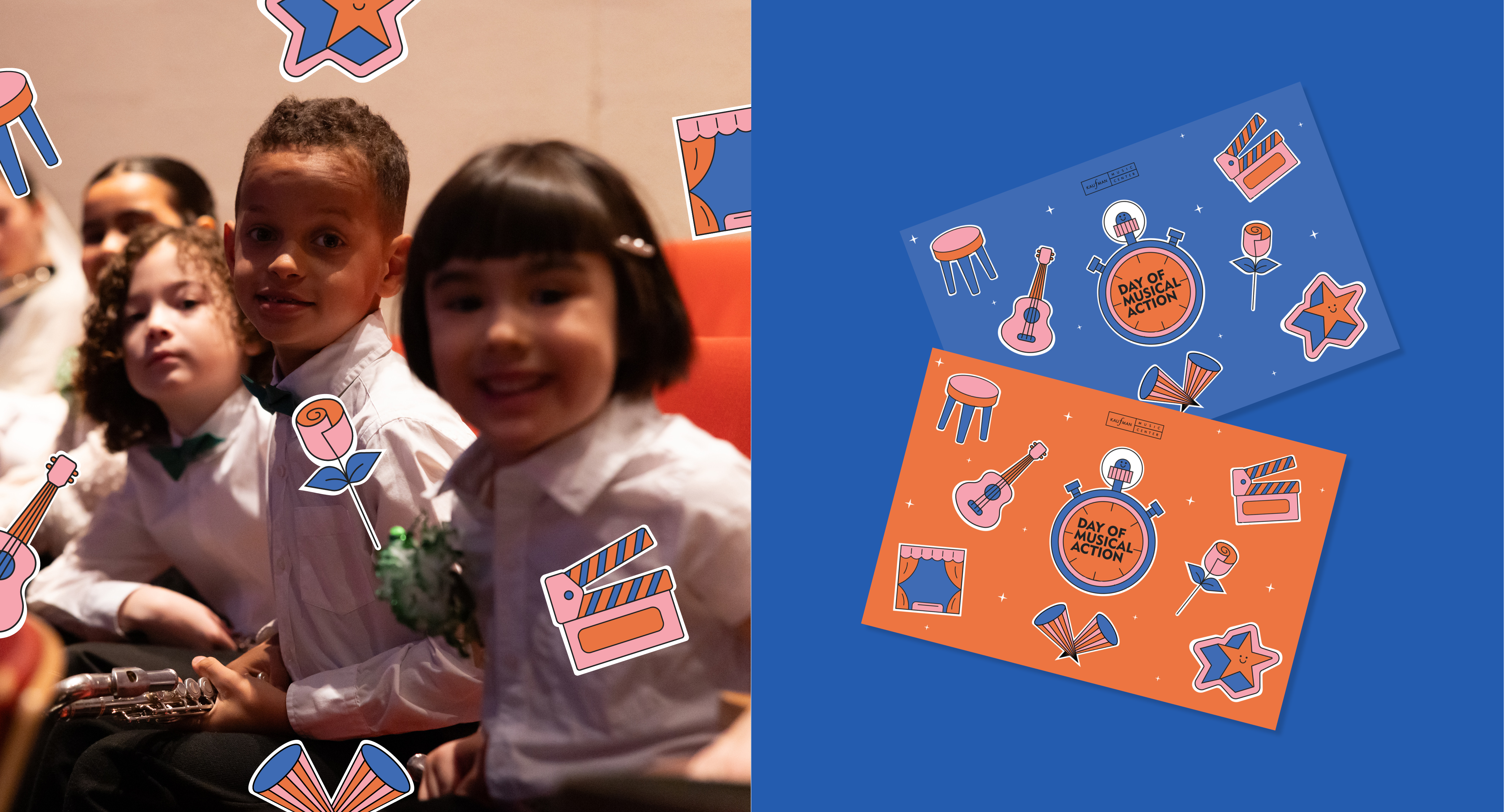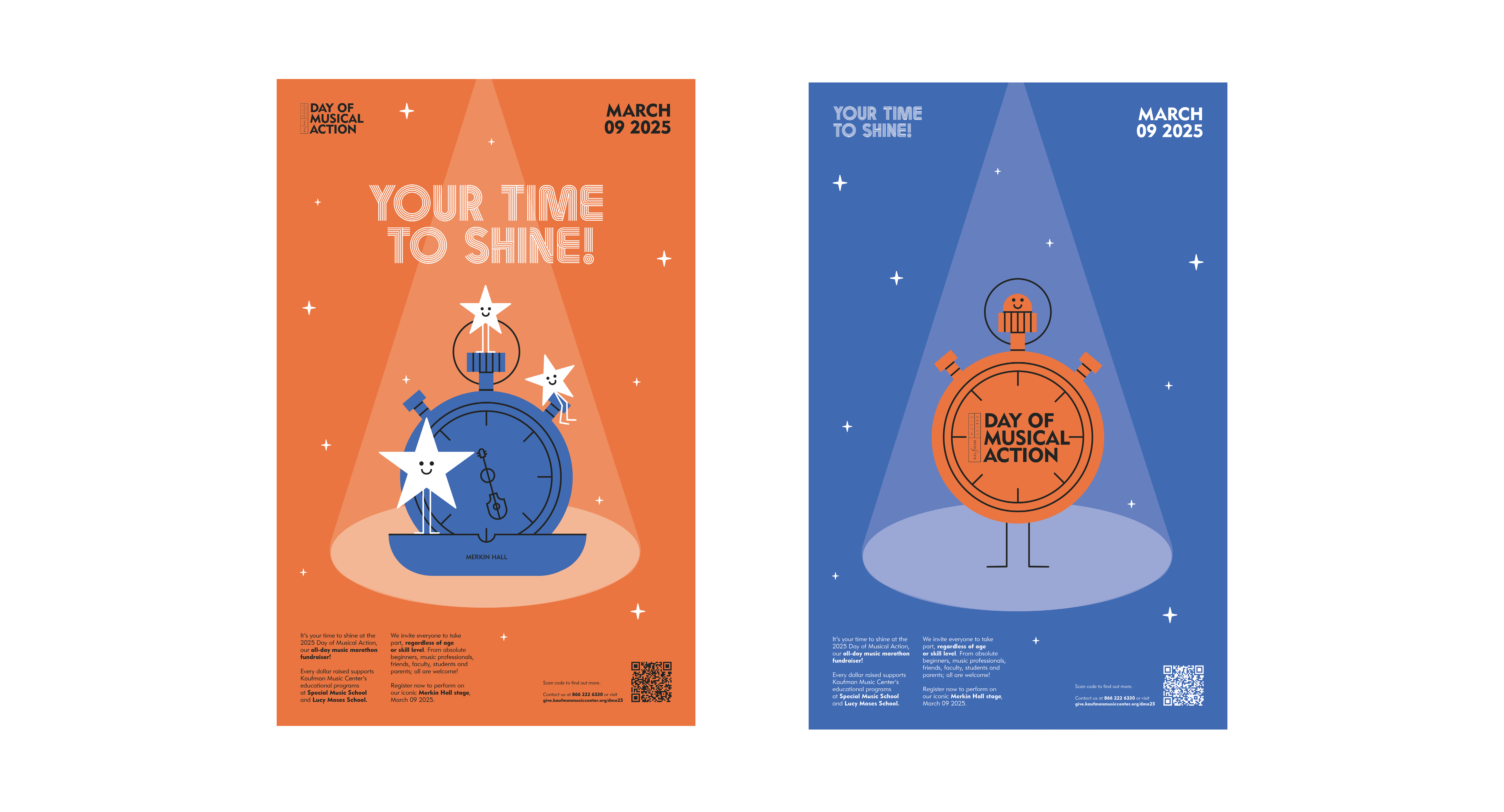 Working closely with the Development Team, the project involved designing a suite of promotional and day-of materials to support engagement across print and digital touchpoints. The central visual of a personified stopwatch celebrates each individual’s “time to shine” on the Merkin Hall stage, acknowledging the time-sensitive nature of the event in a way that feels fun and approachable. This hero image is supported by a wider suite of illustrations that reflect a day filled with music, movement, and activity.