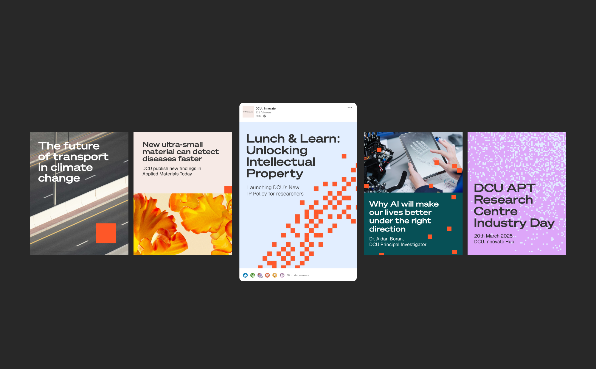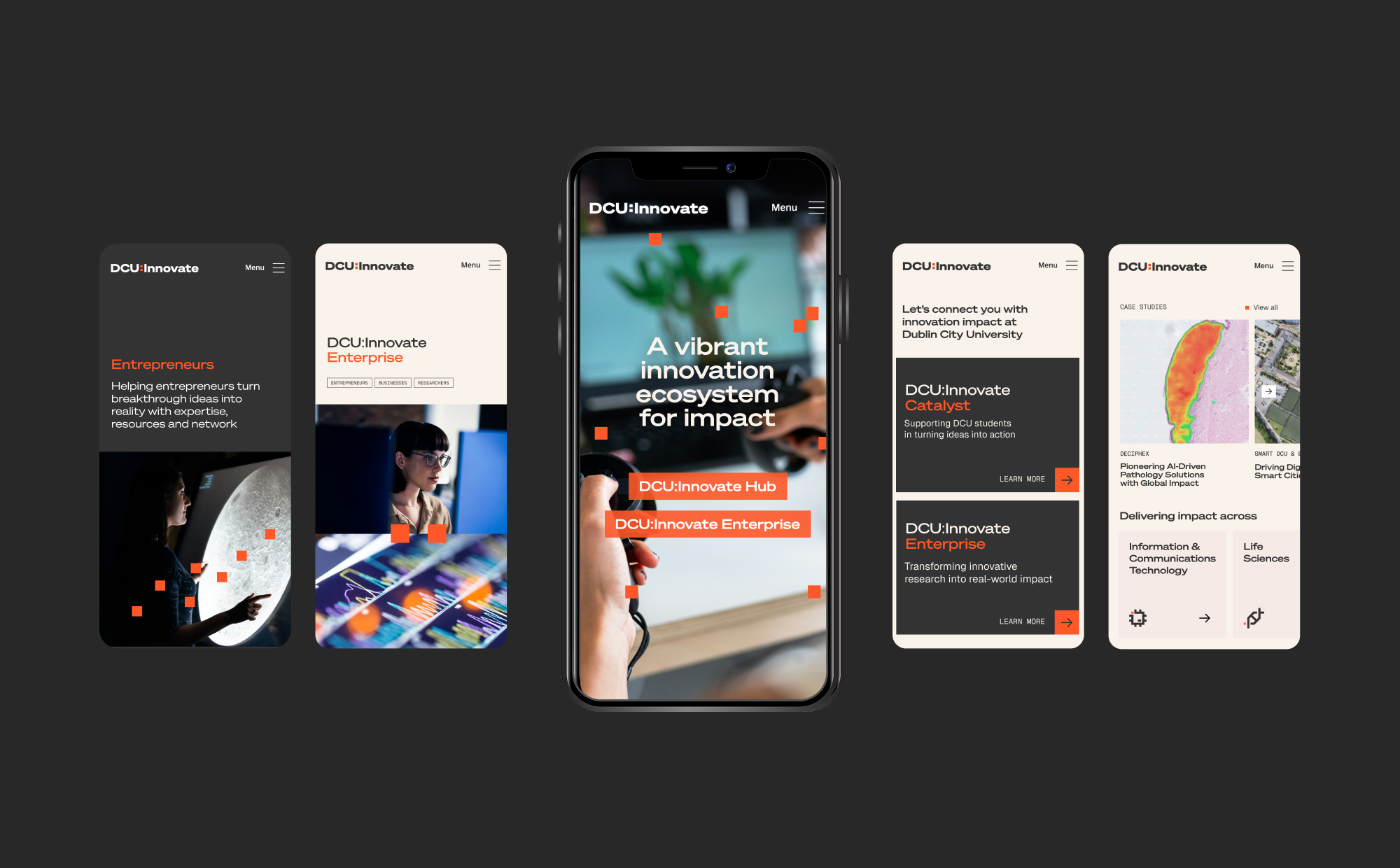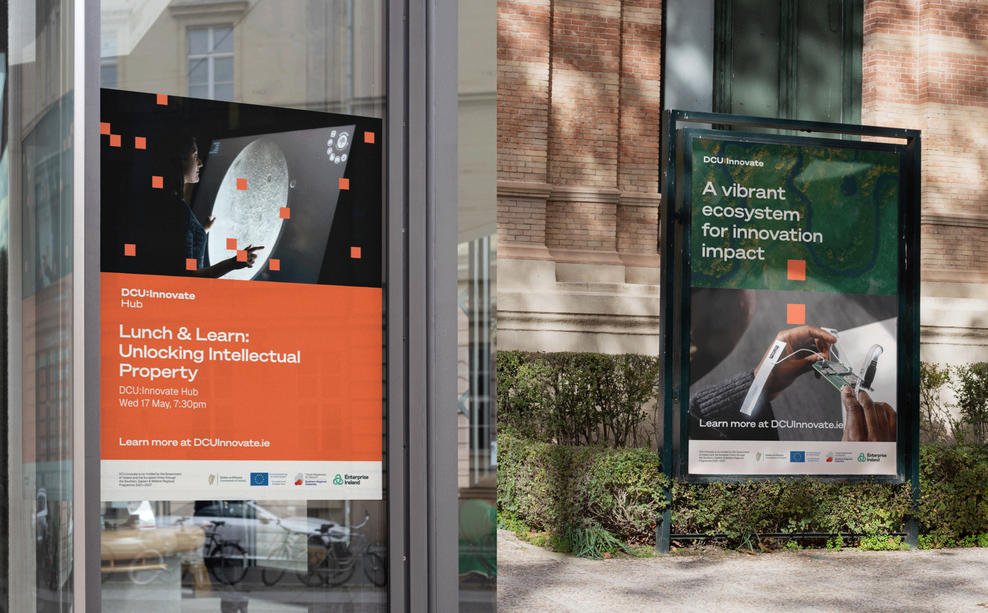 We introduced a bold, unifying colour palette to bring consistency across all activity, paired with a broad photography suite that focused on people—researchers, businesses, students—as the true instigators of innovation. To reduce costs, we blended new imagery with stock and an existing library. The new brand and digital platform positions DCU as a dynamic 'destination for innovation', creating ripples of positive impact across the university, industry, and society.