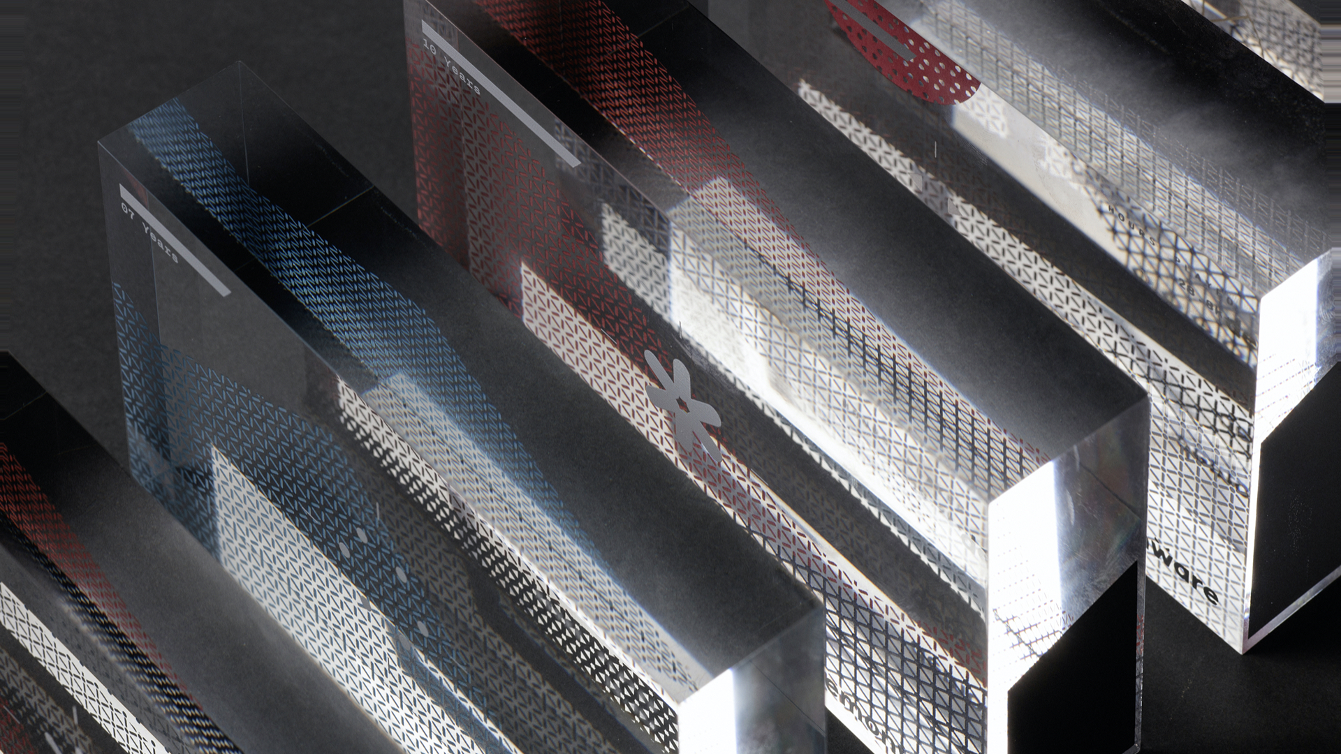 Demonware create, provide, and host the online services behind some of the world's biggest game titles. They recognise milestones in each team member's service at the company by giving physical awards. Working closely with the Demonware team, we devised an approach to those awards. Their layout is inspired by the familiar HUD from the world of gaming. As a team member's collection grows, the transparent awards stack to describe a 3D landscape.