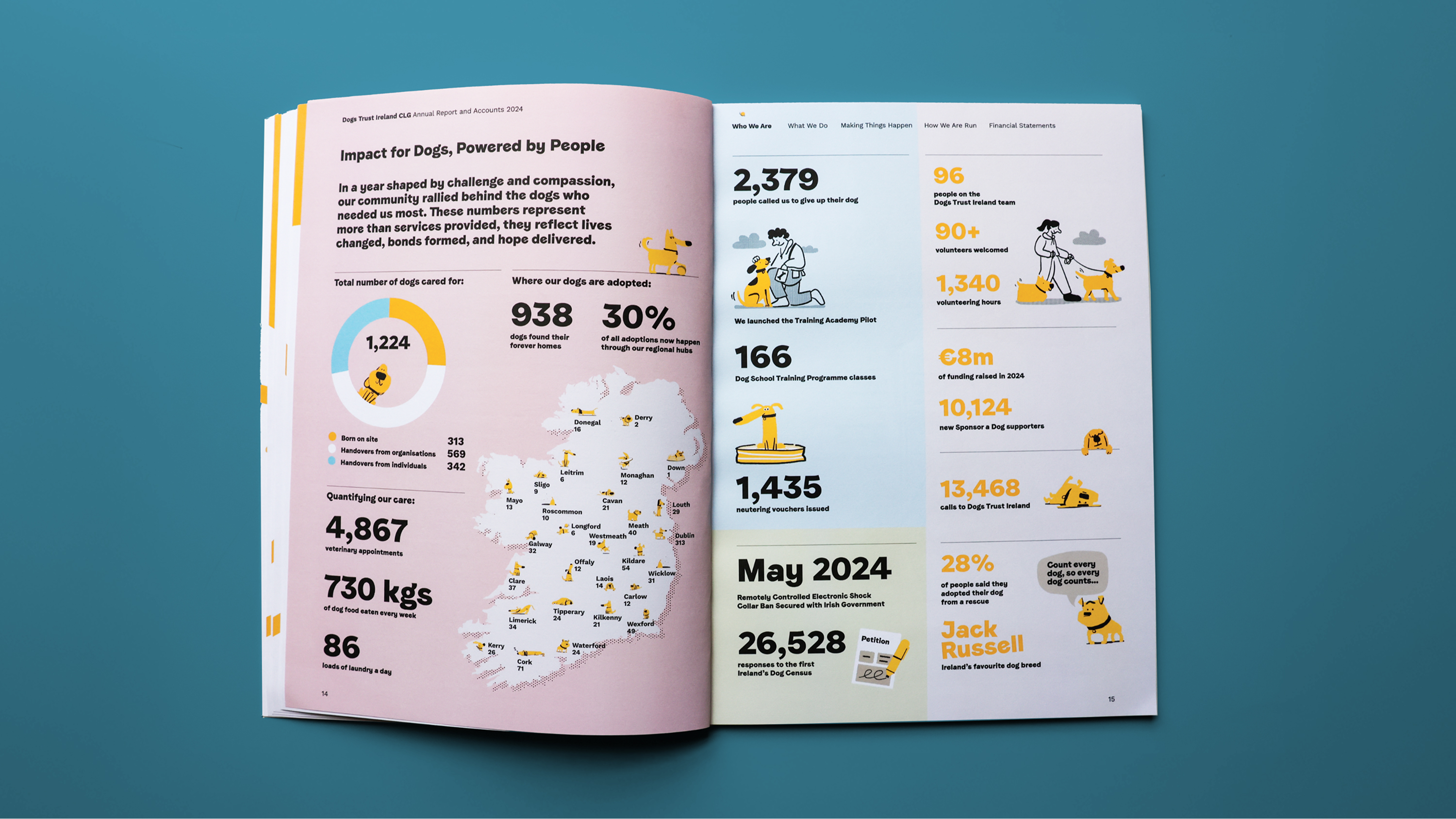 Together, illustration, photography and layout create an editorial rhythm that balances warmth with clarity. The report remains recognisably Dogs Trust Ireland, while subtly pushing the brand forward in a way that feels confident and future-facing. Copy support ensured strategy, data and storytelling worked together as a single, cohesive narrative.