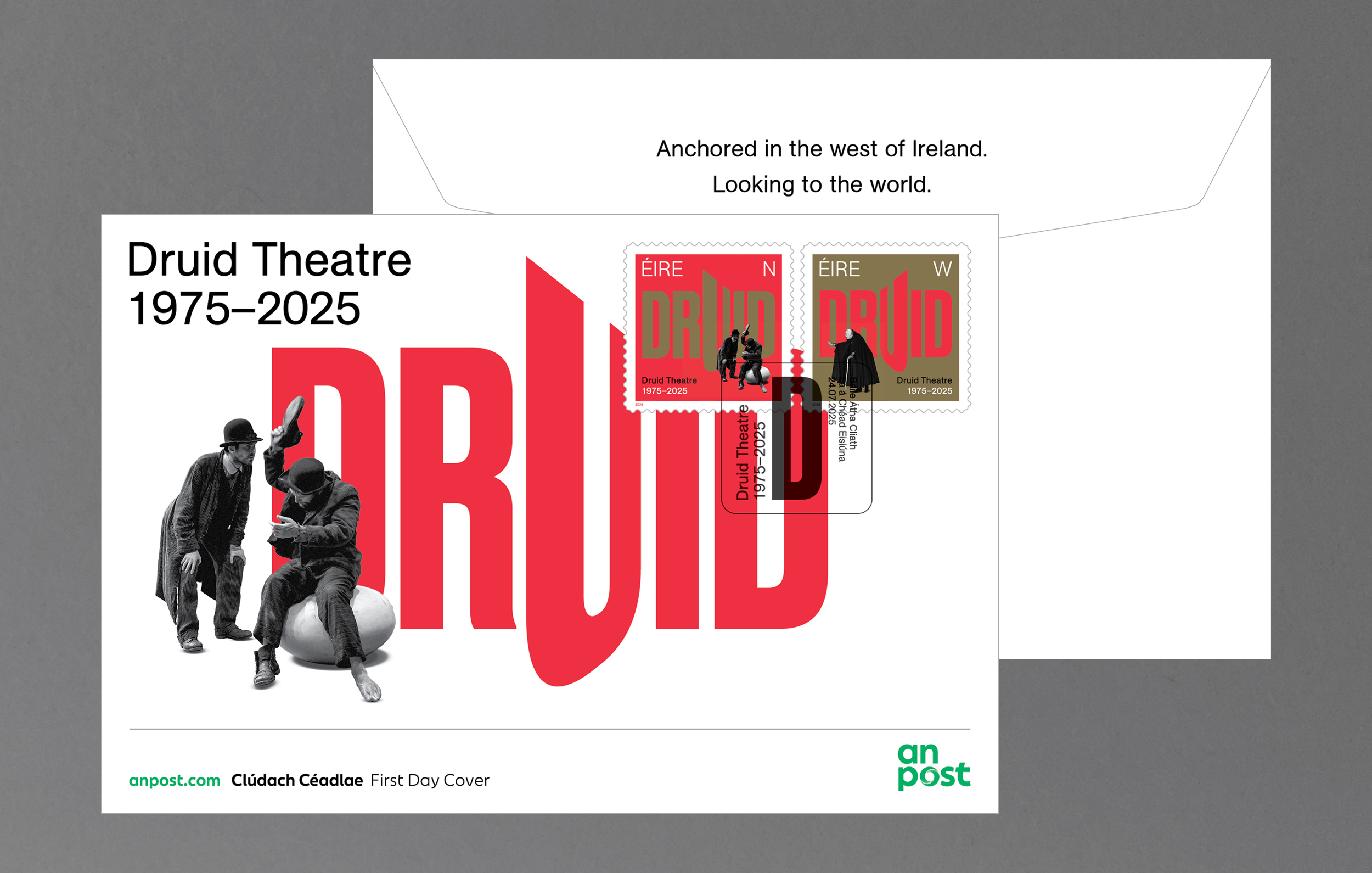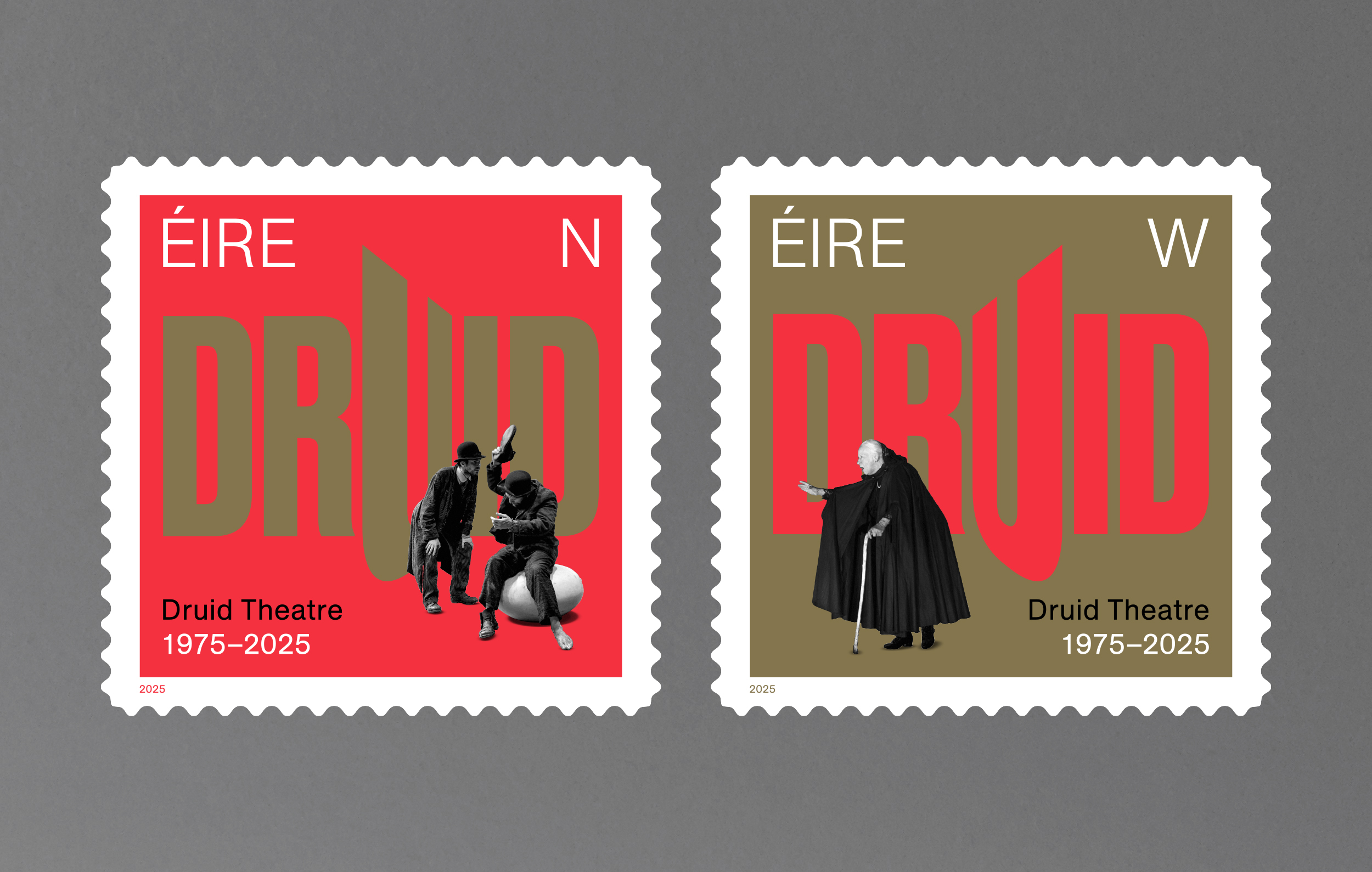 The stamp designs feature original photography by Matthew Thompson; National (N) – Marty Rea and Aaron Monaghan in Waiting for Godot, 2018 and World (W) – Marie Mullen in Druid Gregory, 2020.