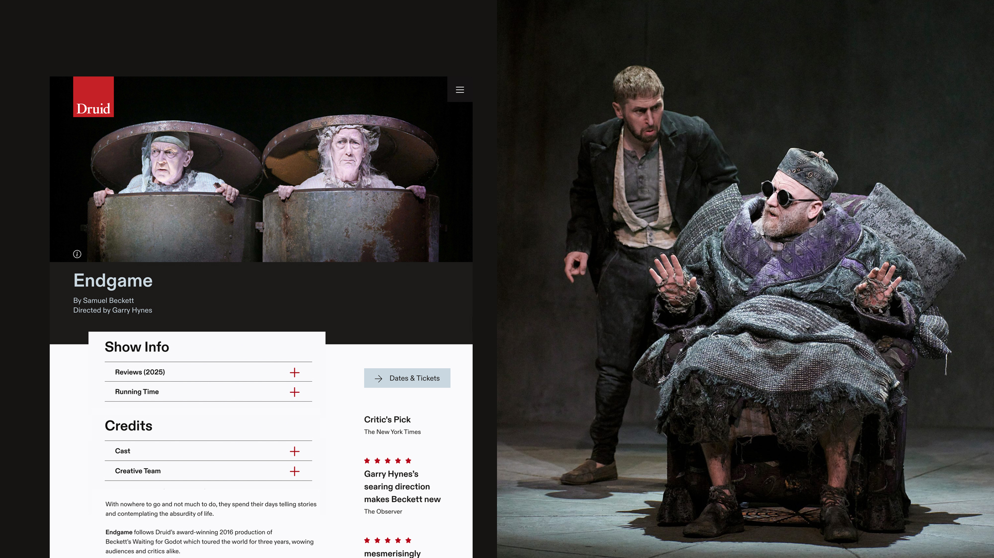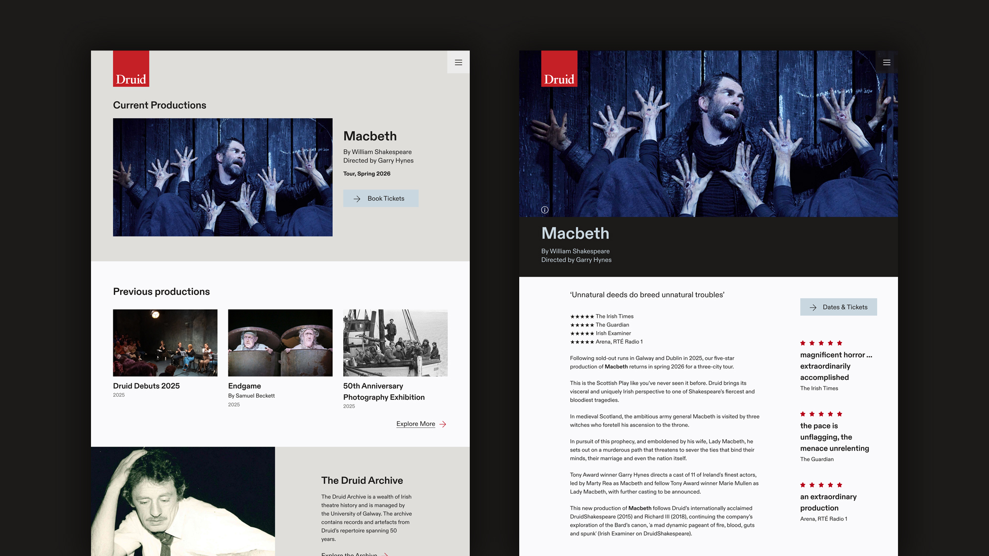The design supports both immediacy and depth: clear pathways to key production information and ticket booking sit alongside a carefully structured archive that celebrates fifty years of ambitious theatre. Fully responsive, the site delivers a seamless experience across devices, ensuring Druid’s story and work remain accessible wherever audiences encounter it.