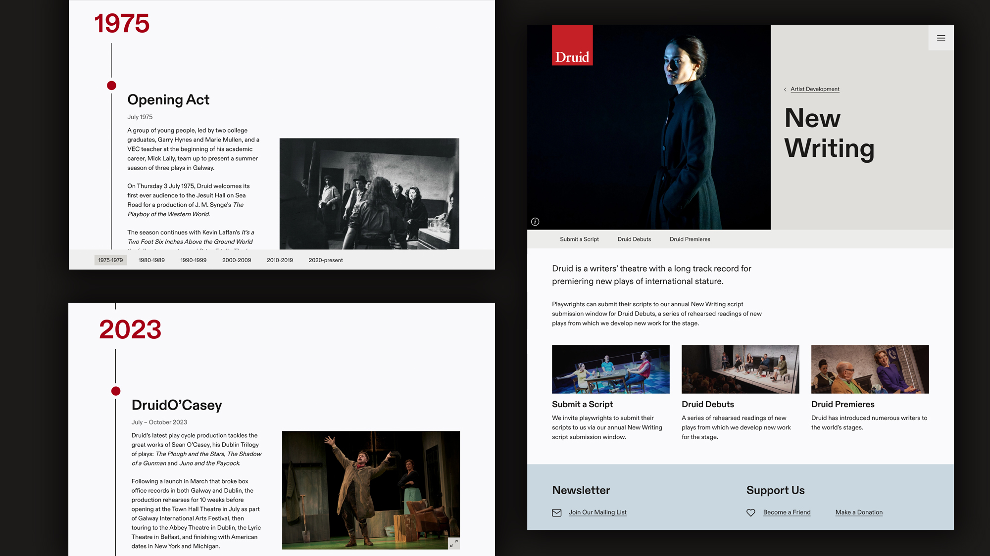 Commissioned to mark Druid’s 50th anniversary, the new website needed to do more than promote productions. It needed to articulate the identity of a world-class touring theatre company that remains deeply rooted in Galway.