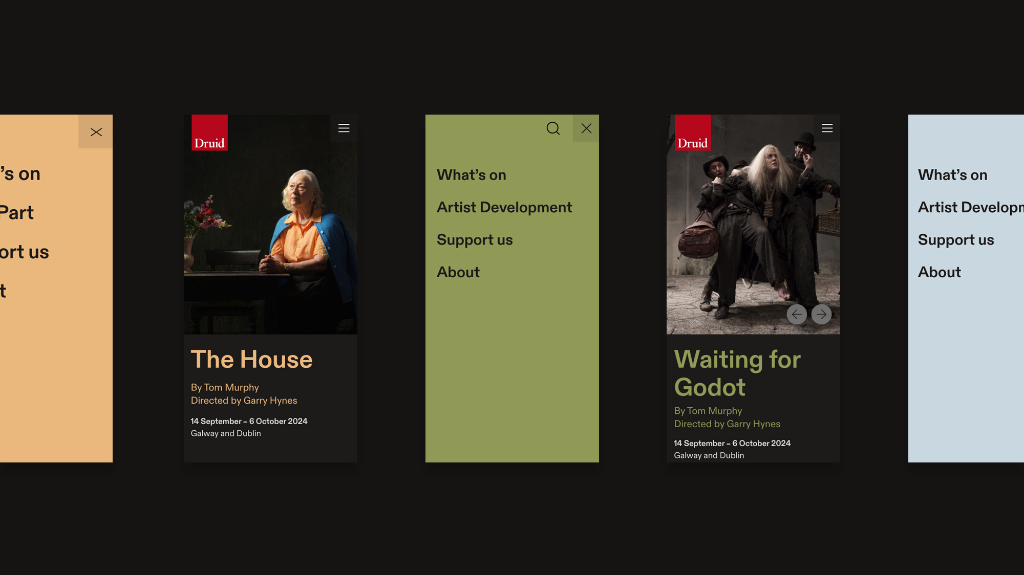 Visually, the site balances confidence with restraint. An earthy colour palette, drawn from Connemara landscapes and familiar theatre textures, grounds the experience, while bold production photography gives each show the presence it deserves. Clean, assured typography reflects Druid’s writers’ theatre ethos and provides clarity across a complex body of work.