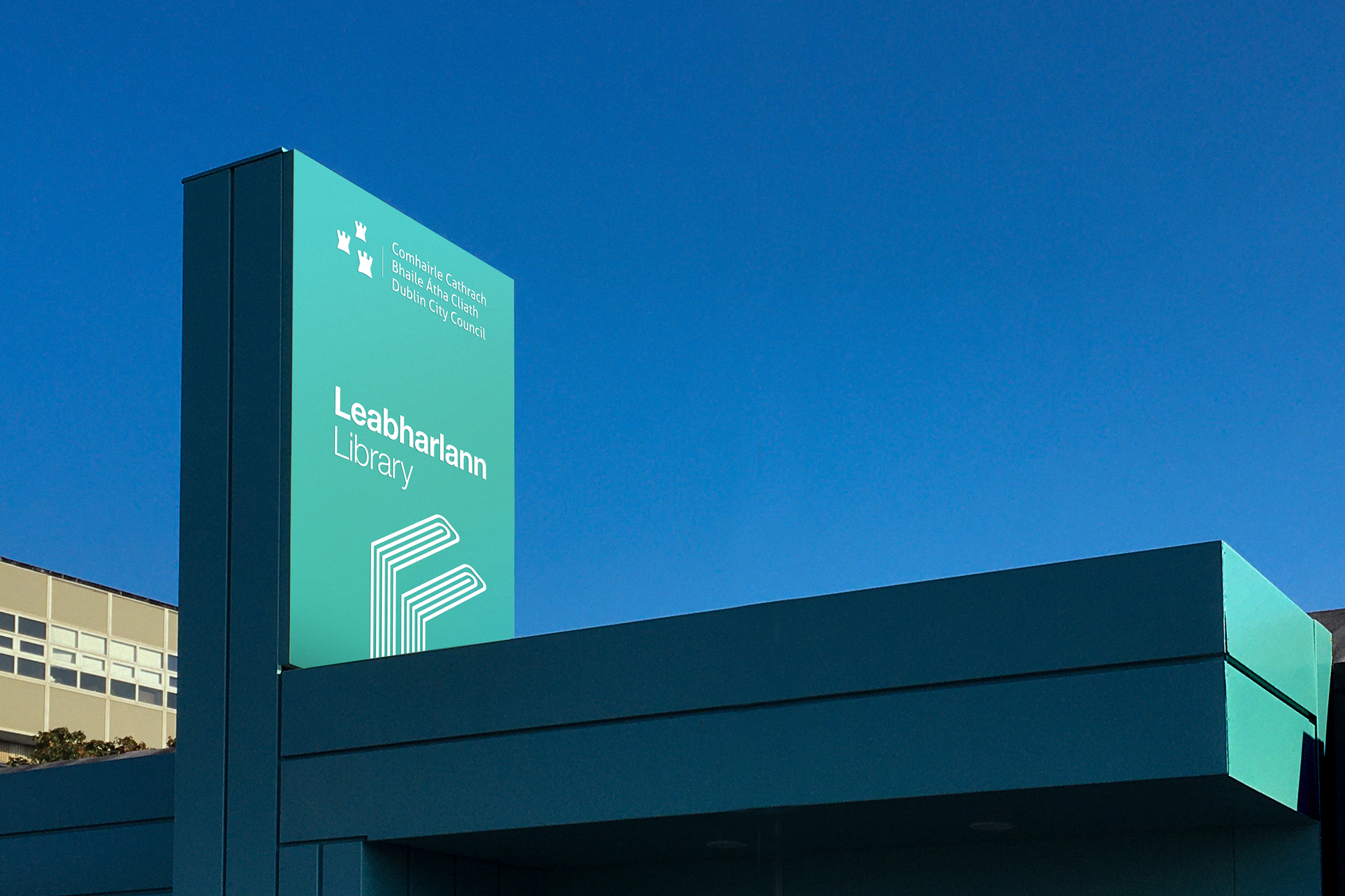 Dublin City Libraries is the largest library authority in the Republic of Ireland, serving over half a million people through a network of 21 branch libraries, a number of specialist services and Mobile Library stops. Up until recently, while a distinct entity in its own right, it operated under the umbrella of the Dublin City Council identity, often without any indication that the building was in fact a public library. Emerging from an exploration of signage to overcome this challenge, the new dual language Leabhann/Library identity has now established a versatile visual signature that can be universally applied to all library buildings, ranging from listed to contemporary across the city and can appear either independently or as part of a controlled lock-up with the Dublin City Library logo, depending on its application requirements. An extensive identity application guidelines manual has been produced, with the physical rollout of the signage system for both internal and external application now completed for 3 of the libraries in 2020, with the remainder of the rollout continuing throughout 2021.