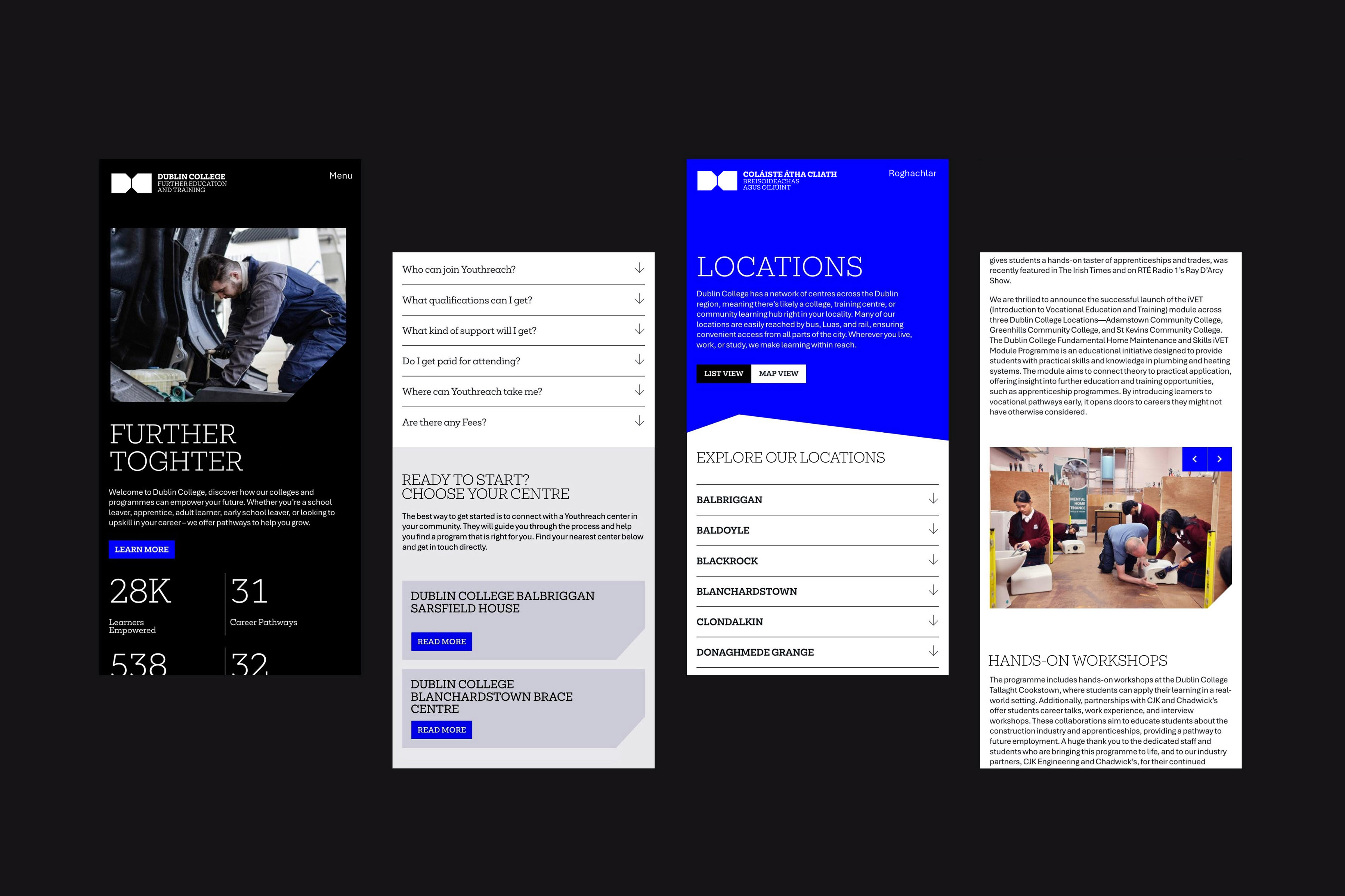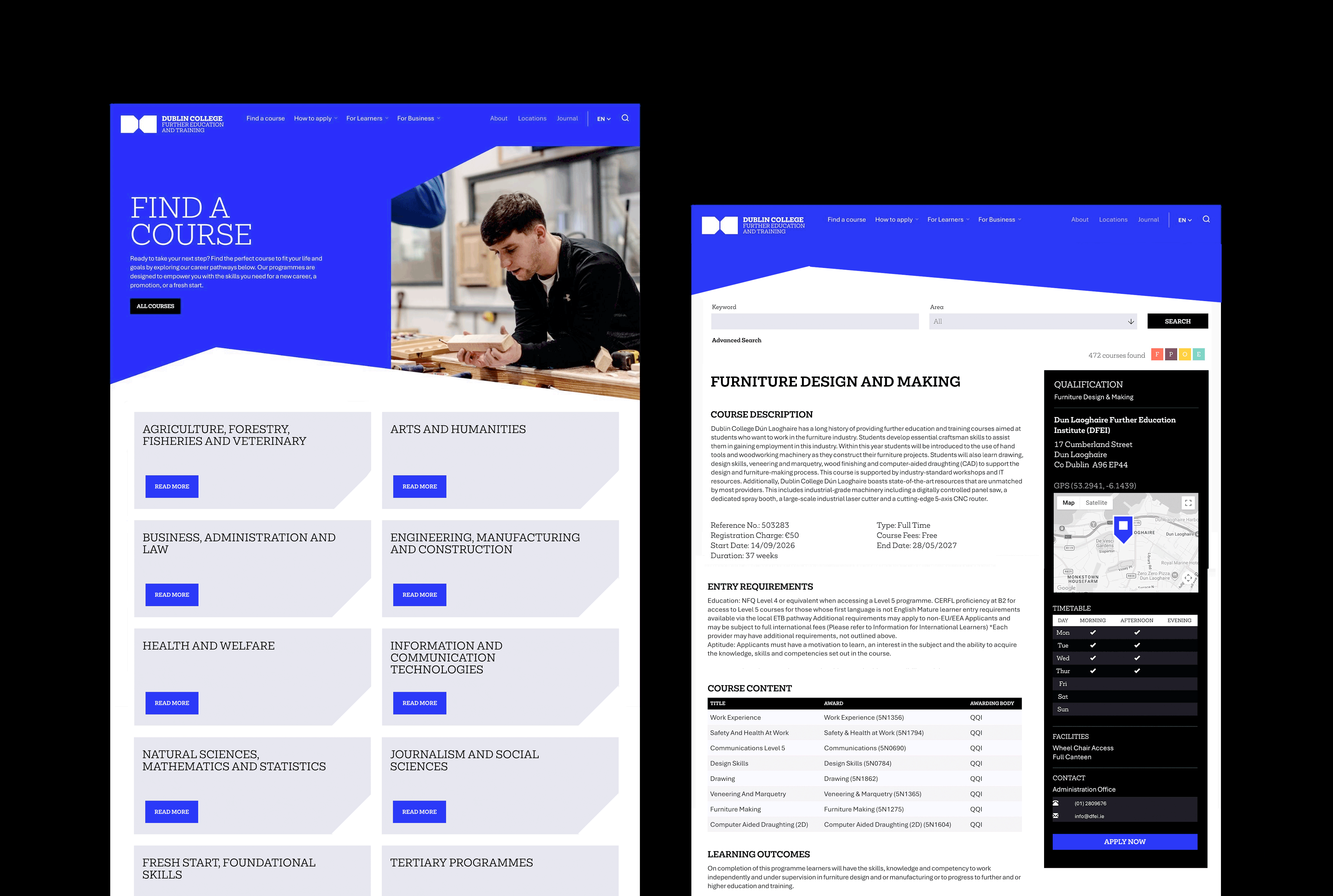 The website is fully integrated with the centrally managed government FetchCourses platform, ensuring consistency and accuracy of course information across all locations and programmes. We also built a flexible content management system that enables the Dublin College team to quickly create and update pages using a series of predefined layout blocks within a custom-developed page builder. This ensures brand integrity is maintained while allowing the team the autonomy to efficiently managing content as services and courses evolve.