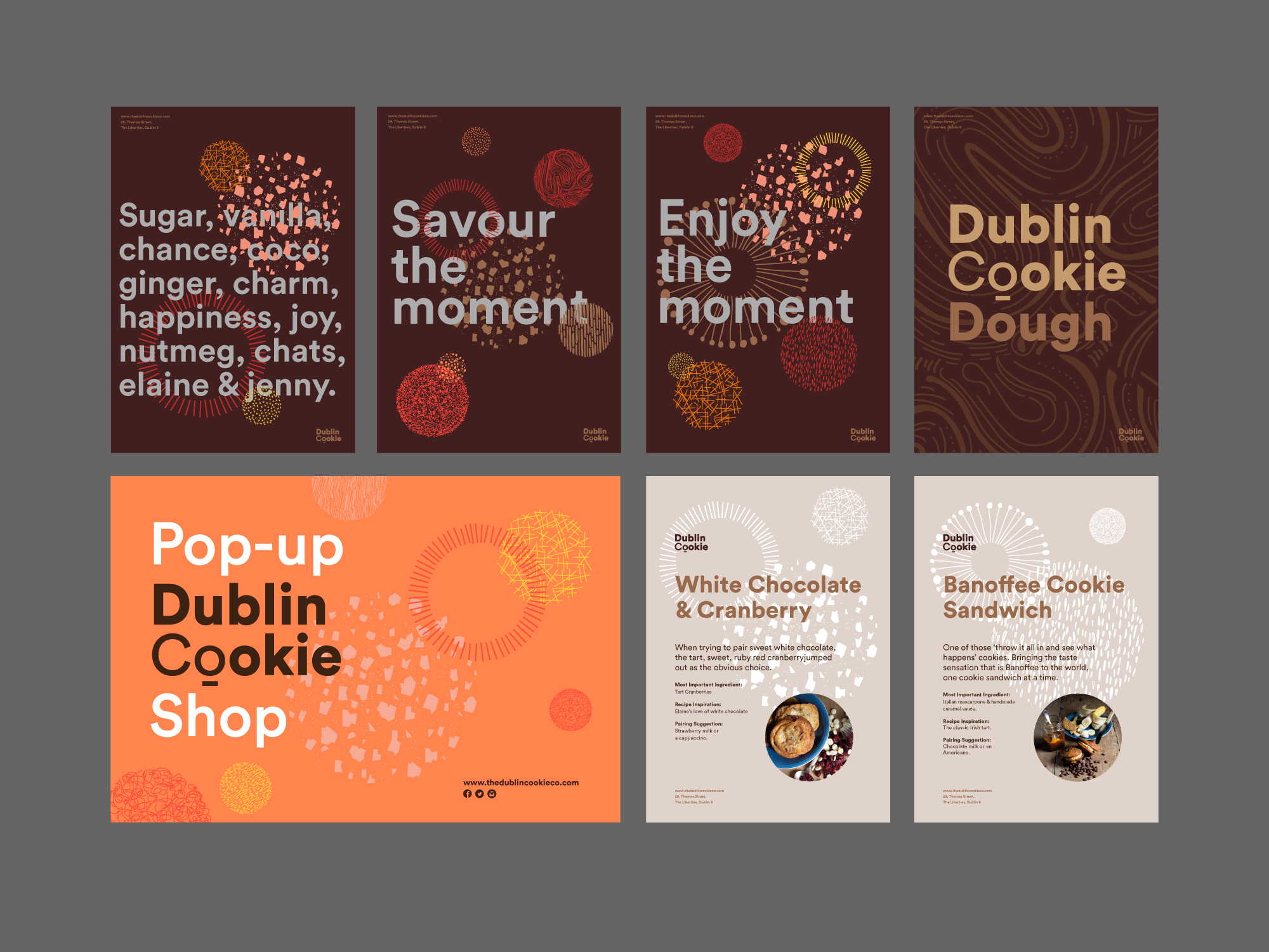 The design and concept of the identity evolves around illustrating moments and memories one can have when tasting various ingredients. The identity includes a language system broken into three parts: Dublin is the language of the city, Cookie is the essential ingredients and Company is the magical moments that arise from the company of others. G’wan Chewy Friendship!
