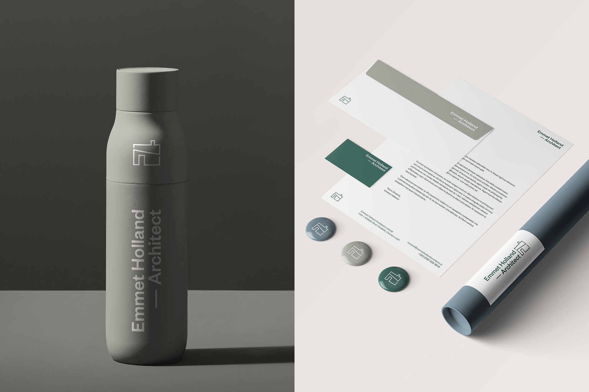 Brand identity re-design for Emmet Holland Architect. Based off Emmet's original hand-drawn house icon, we refined and redrew this, modernising it and creating a more solid logomark. Using a harmonious, muted colour palette, alongside a humanist typeface, Founders Grotesk by Klim Type Foundry, there is a solidity and warmth to this brand.