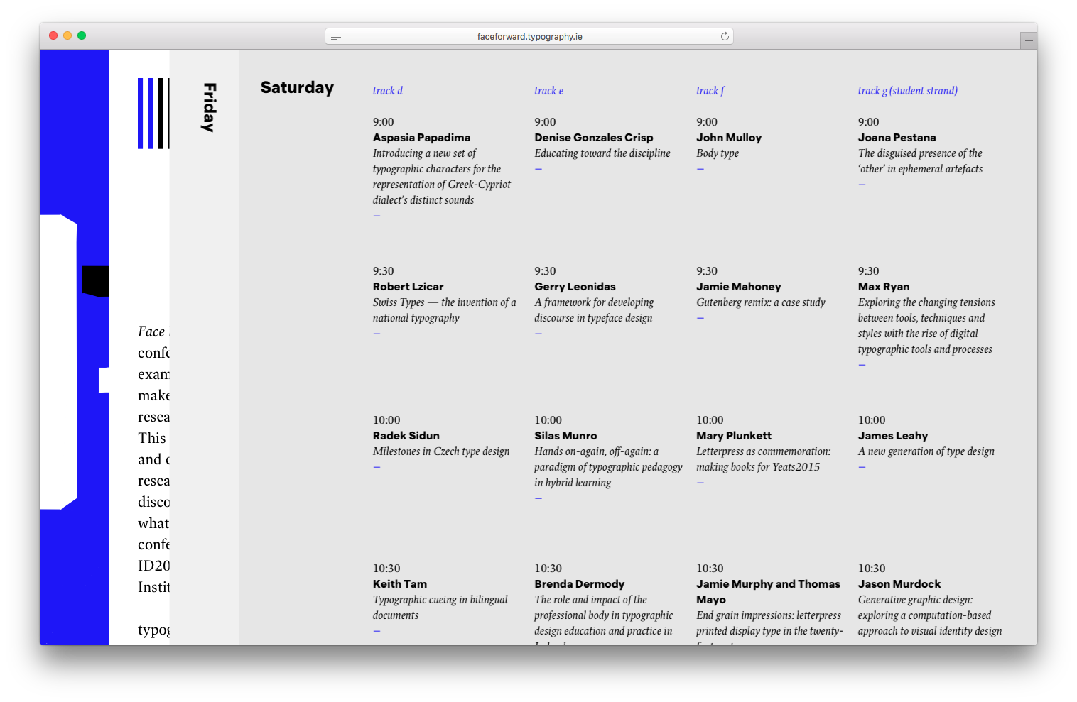 We were asked by Typography Ireland to produce a website for the inaugural International Typography Conference they were organising, Face Forward. The conference aimed to blur the lines between academic and professional practice within typography and present a range of speakers from both camps that explored and engaged in dialogue around the crossover between these areas.