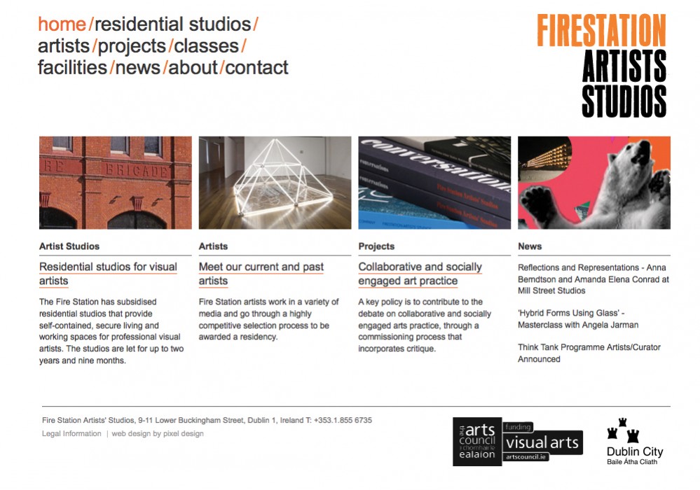 The Fire Station Artists’ Studios provide support for professional visual artists through subsidised combined living and working studios, sculpture workshop facilities and training. The purpose of this website is to enable Fire Station Artists’ Studios attract a high standard of artists to apply their residential studio programmes. Through the use of an online directory of current and previous artists, the website showcases the calibre of artists that have gone before. The design of the website is clean and uncluttered. It reflects the role of the studios as a blank space for artists to grow and evolve and provides a calm environment to view the visuals of the artist's work.