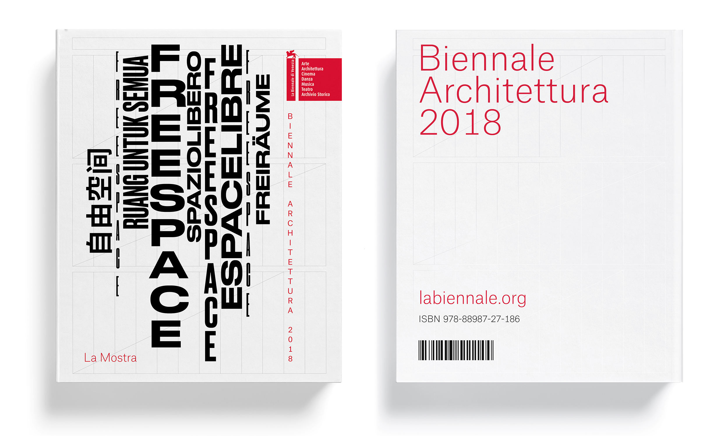 The book's typographic identity is consistent with the overall visual identity we created for Biennale Architettura 2018. The typographic identity and its communications was inspired by the sheer scale of the columns of the Corderie and Arsenale exhibition venues. The spaces themselves provided key visual and conceptual cues for our initial graphic studies and explorations of light & shade and rhythm & scale – constant and recurring elements in our conversations with the Curators. The coarse textures, contrasting rough and smooth of the columns’ surfaces, and the ever present environmental staining that cascades down every building in Venice is evident in the vertical bias of the ‘typographic stacks’ produced for each application and the book covers.