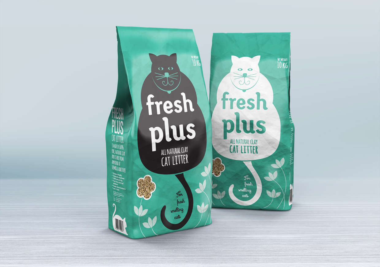 Fresh Plus cat litter packaging is bright and fun packaging design which indicates it’s use clearly to potential consumers with it’s playful feline characters along with the display of the content through the flower-shaped device. The earthy colour tones and floral illustrations draw attention to it’s all natural properties. The playful feel is used consistently throughout from the main graphics to the barcode detail. This product packaging has been designed to create a light, airy and bright feel for a product which holds a less-than-attractive use. The bold feline character and product name featured large-scale on the front of pack creates easy brand recognition and shelf-standout against competitors. The client’s feedback was positive, “Thank you ever so much for great and unique job you have done with this packaging design. Many thanks.”