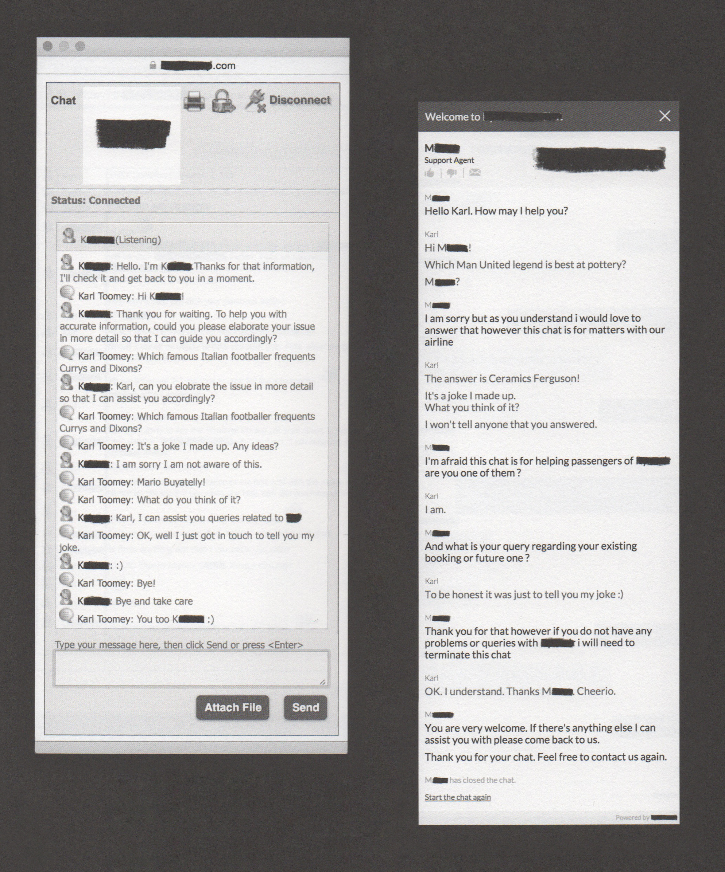 On one level Funny Business is a 72 page, self-published joke book. On another it is a quest to discern who is human and who is not in an increasingly automated world. Like a strange Turing Test, Funny Business does this by telling jokes to international corporations using their ‘live chat’ customer service feature. Each conversation has it’s own strange charm—sometimes warm and surprising, other times fearful and confused. Each interaction is presented in it's entirety as a screen shot, with corporation and employee names redacted.
