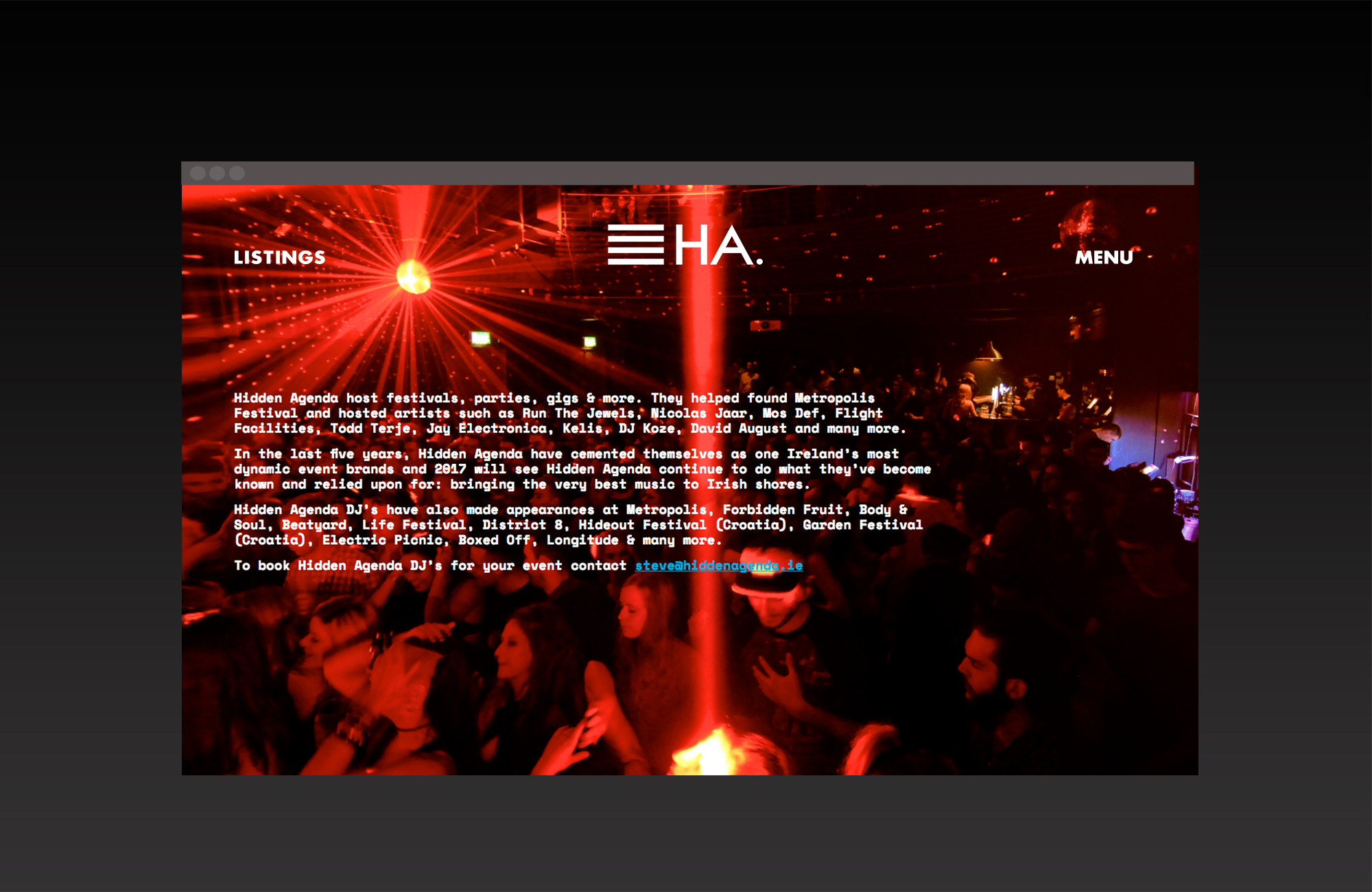 Based on the HA brand guidelines, using Black & White to contrast the event artwork, we designed the site using a pared back navigation to make it as simple as possible to see what events they have and how to book it simply.