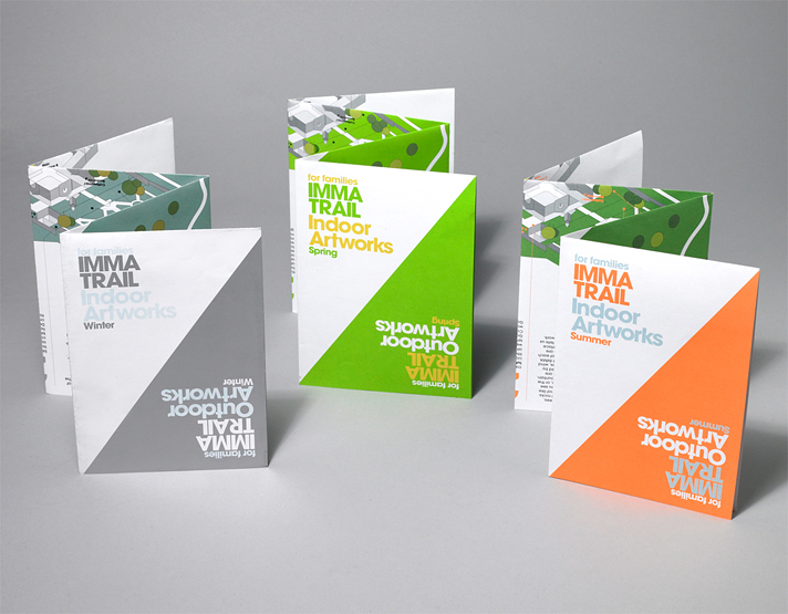 We created a series of maps for the Irish Museum of Modern Art called IMMA Trail. Themed by either season or material, the visitors could the maps to navigate through specified outdoor sculptures and works in the museum. Descriptive and historical information was coupled with questions, encouraging the visitor to contemplate the meaning of each work.