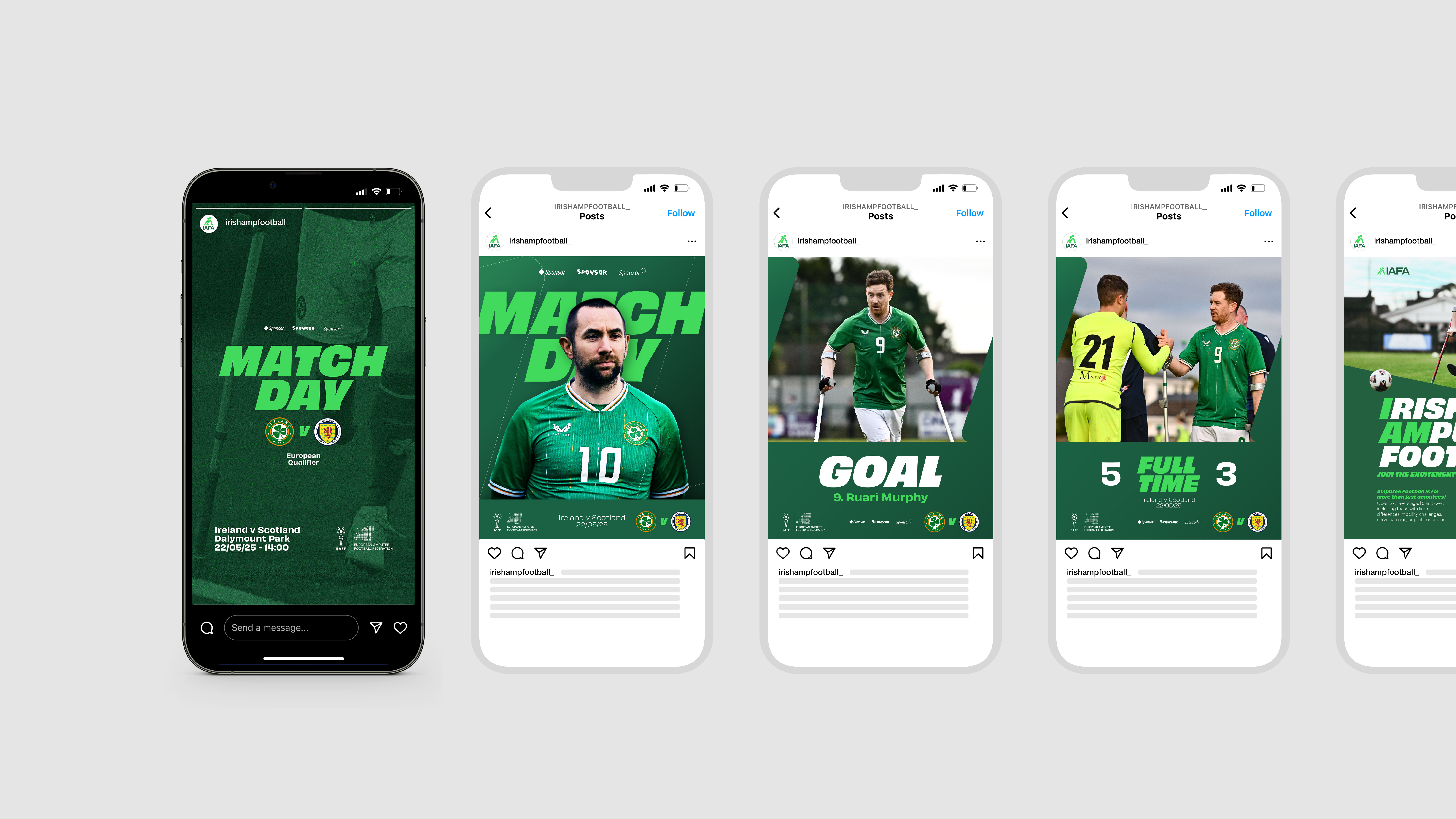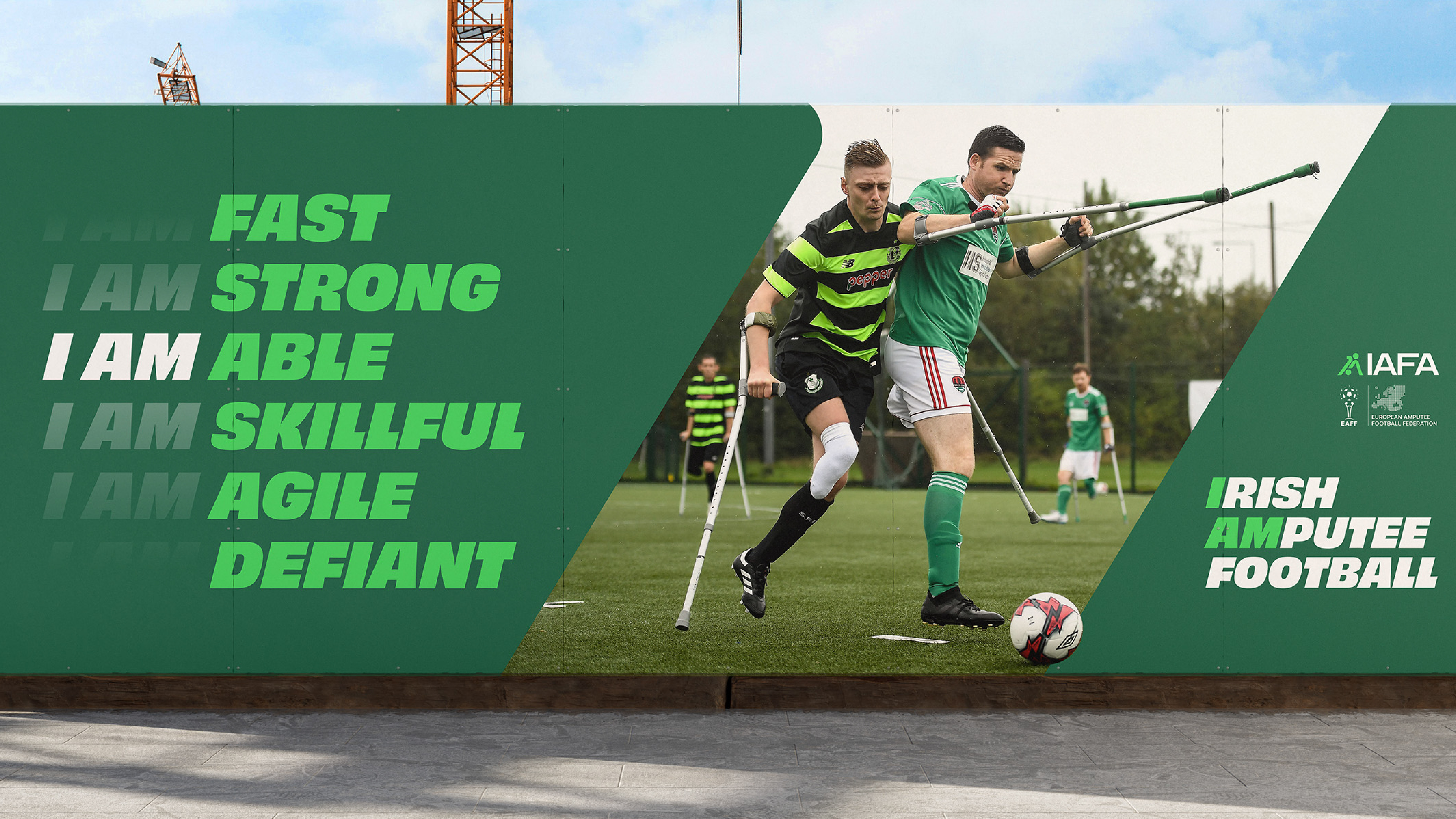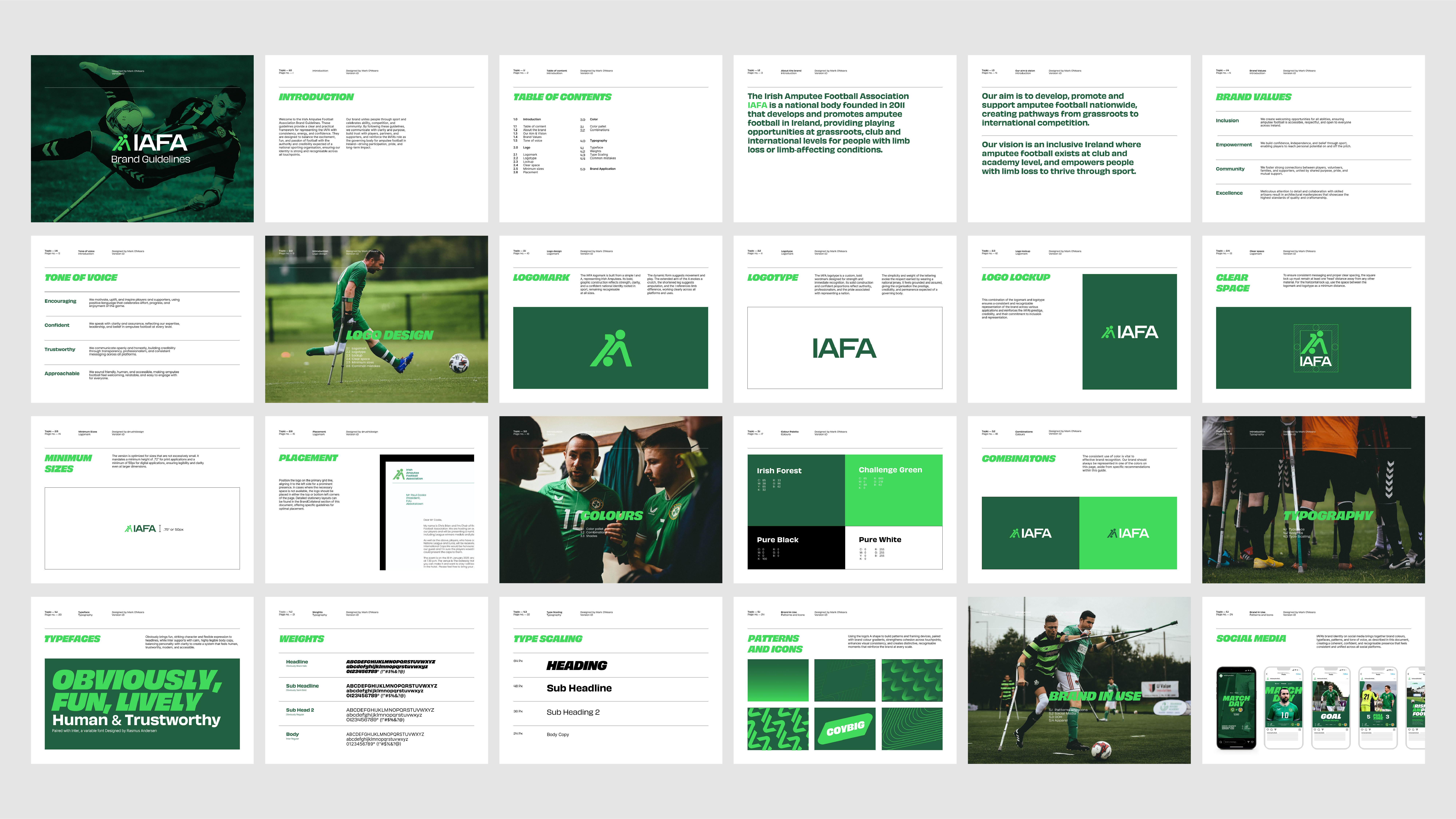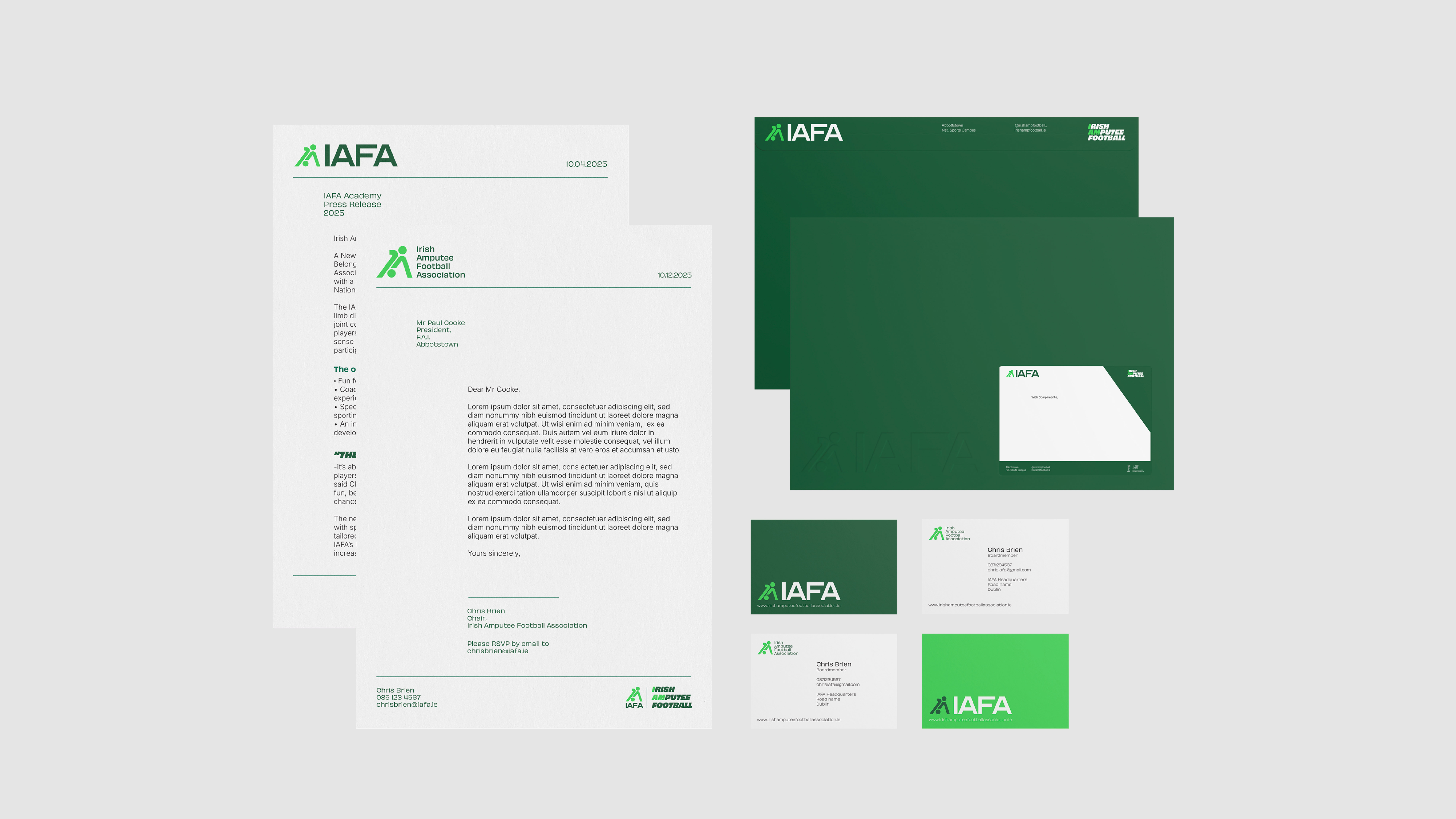 Following in-depth client research with players and volunteers, a new core mark was developed that brings together the letters I and A while also referencing an amputee footballer in motion. This dual meaning gives the mark both clarity and character, expressing movement, strength, and progress in a simple, recognisable form.