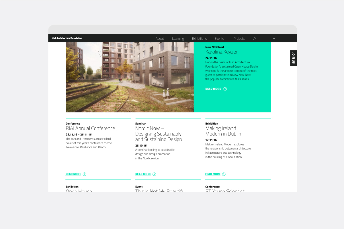 Over the years the Irish Architecture Foundation has grown into one of the country’s most prolific facilitators of architecture and culture in Ireland. With the overall goal of encouraging public engagement with the built environment, a suitable platform to act as a showcase for a wealth of existing and upcoming content was needed. This took the form of a fully responsive website.