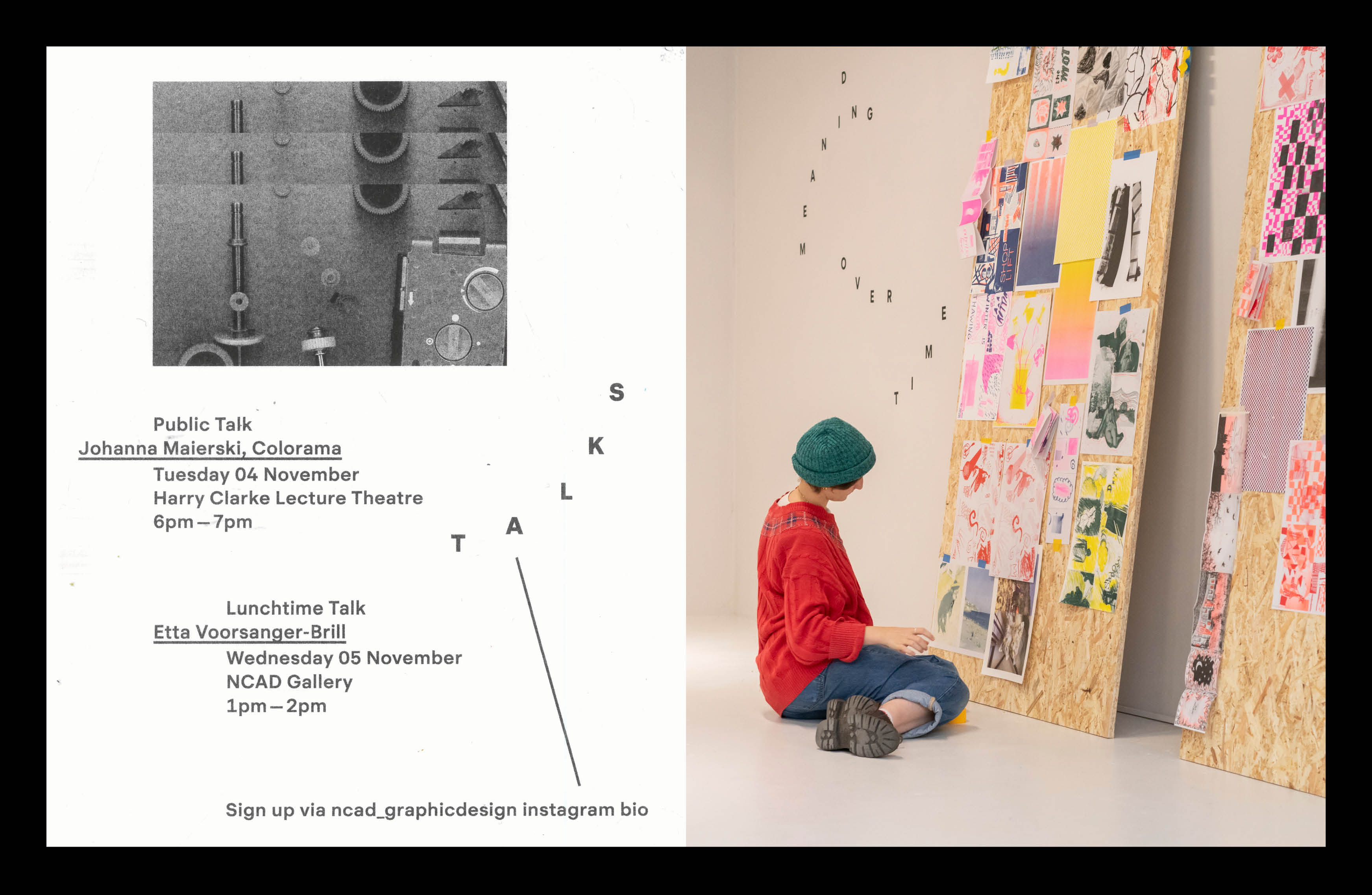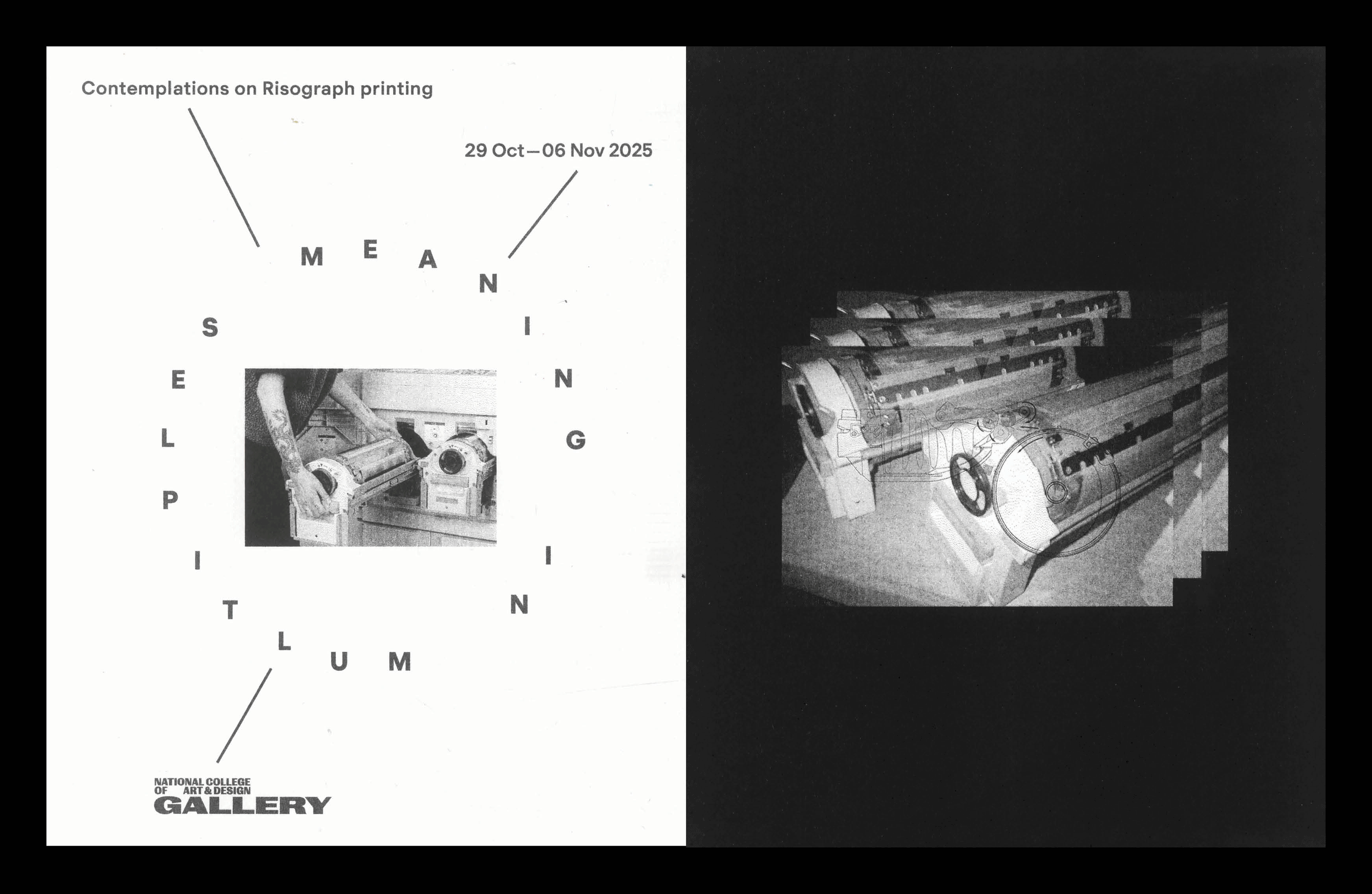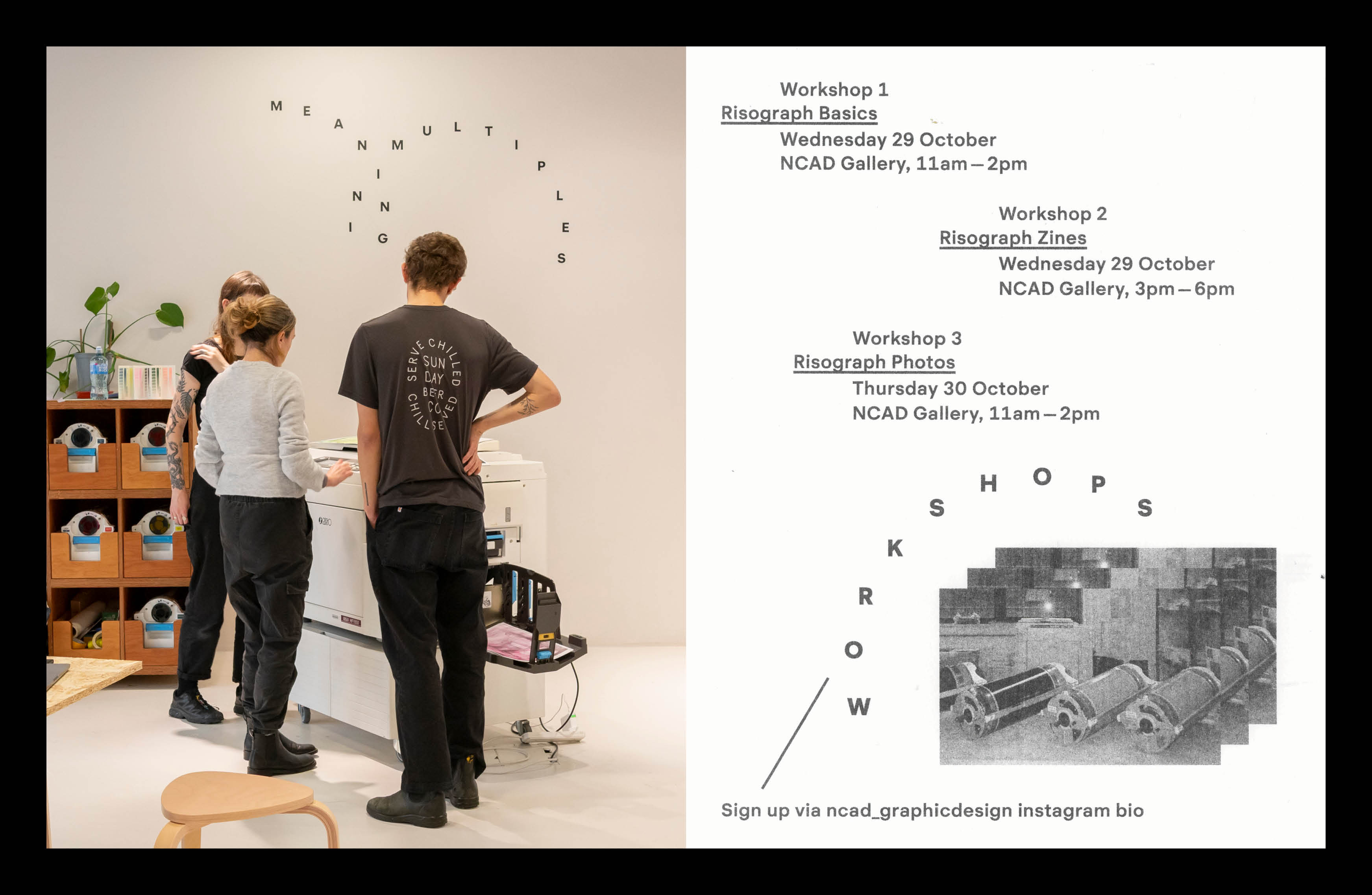 Meaning in Multiples: Contemplations on Risograph printing was a gathering event held in the NCAD Gallery, Dublin 8, across a two-week period in 2025. We designed a programme that included a series of workshops, public talks, and roundtable discussions, within a generative exhibition space. Through hosting this live, discursive gathering, the aim was to encourage contemplation of Risograph printing, to increase awareness around the capabilities of the machine, and to develop the conversation among a diverse group of participants and audiences within NCAD and beyond.