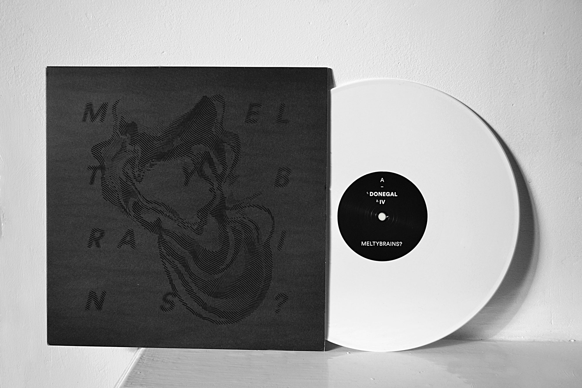 Artwork for a vinyl EP by Irish band Meltybrains? Printed black with spot varnish on black card.