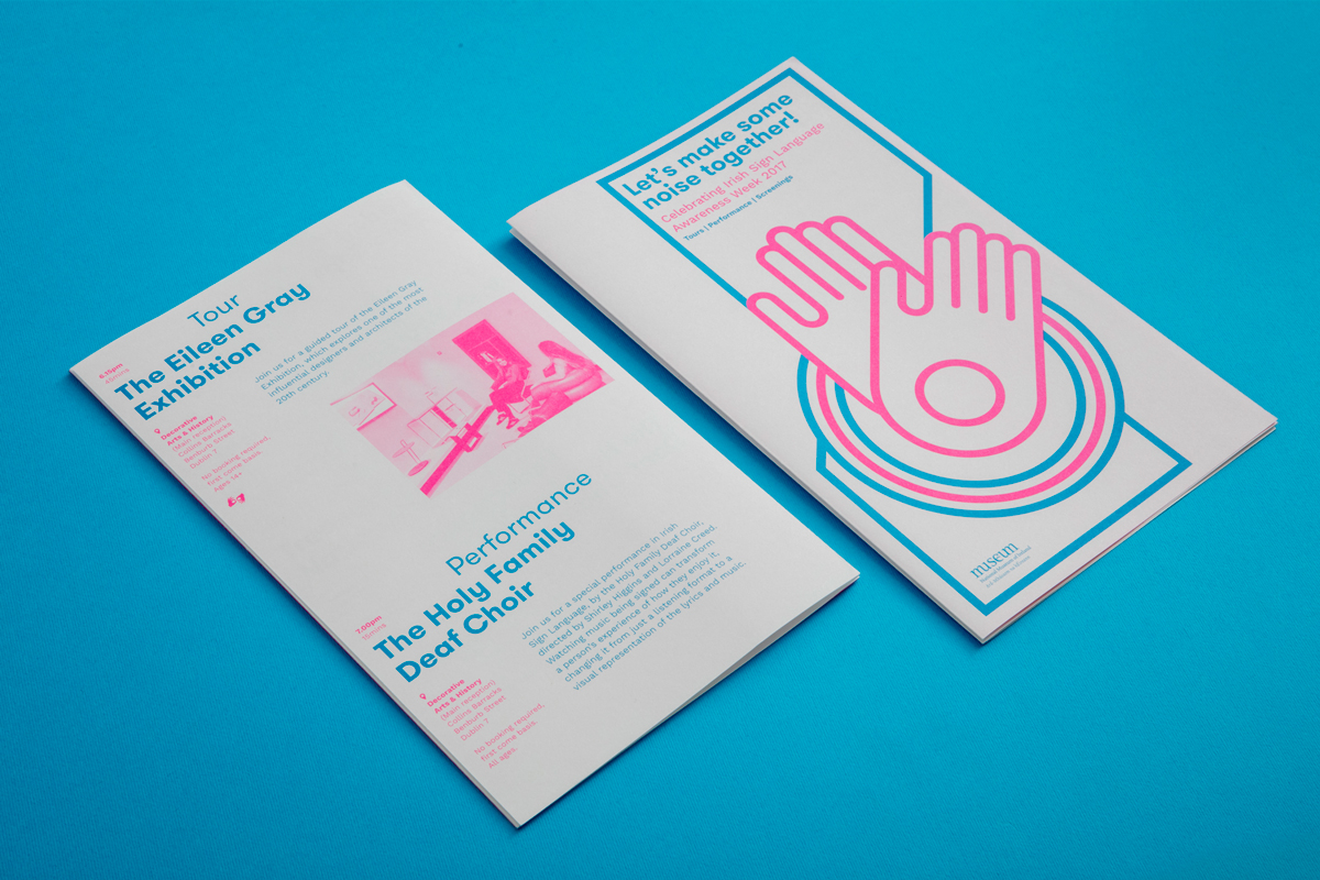 To celebrate the inaugural Irish Sign Language awareness week, the National Museum devised a programme of cultural and educational events. A tight budget encouraged us to explore two colour printing, resulting in a radiant colour palette which reflected the exciting and inclusive theme. The use of simple iconography and accessible typography ensured that readers of all abilities could explore the content.