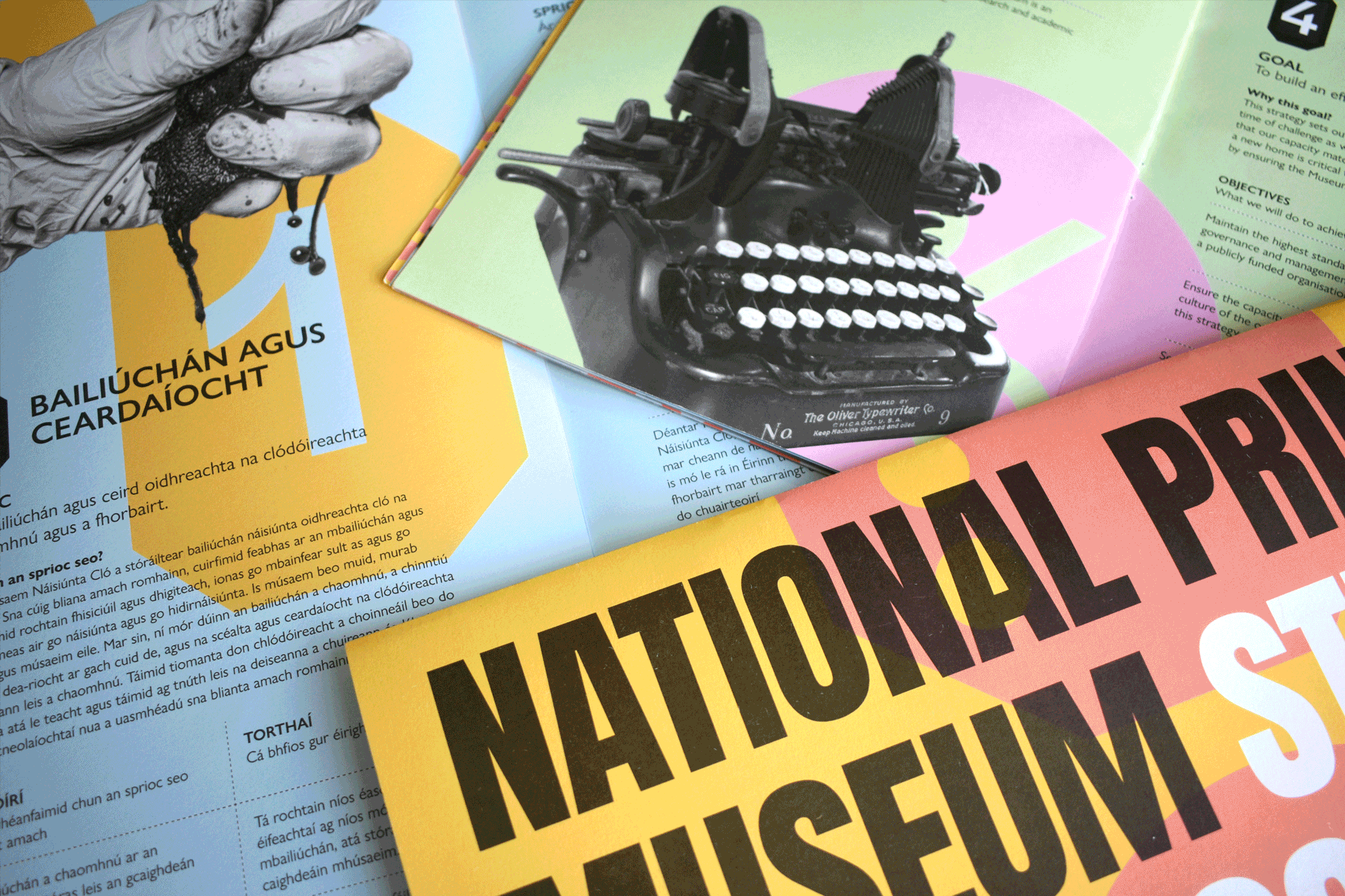 We approached the design of the Strategic Plan by utilising visual references that speak to the cultural and historical heritage the Museum protects, but interpreting them in a new way. A large format reminiscent of old fold-out maps hinted at the museum’s four year journey ahead. The graphic system was influenced by the unique typographic glyphs found on the keys of the Monotype keyboard housed in the museum. Using this vibrant Monotype graphic system and a mix of black and white photography showcasing the diverse ages of the people using the working museum we created a piece of printed material people would want to read, want to take home and hold on to, marking a new era for the National Print Museum.
