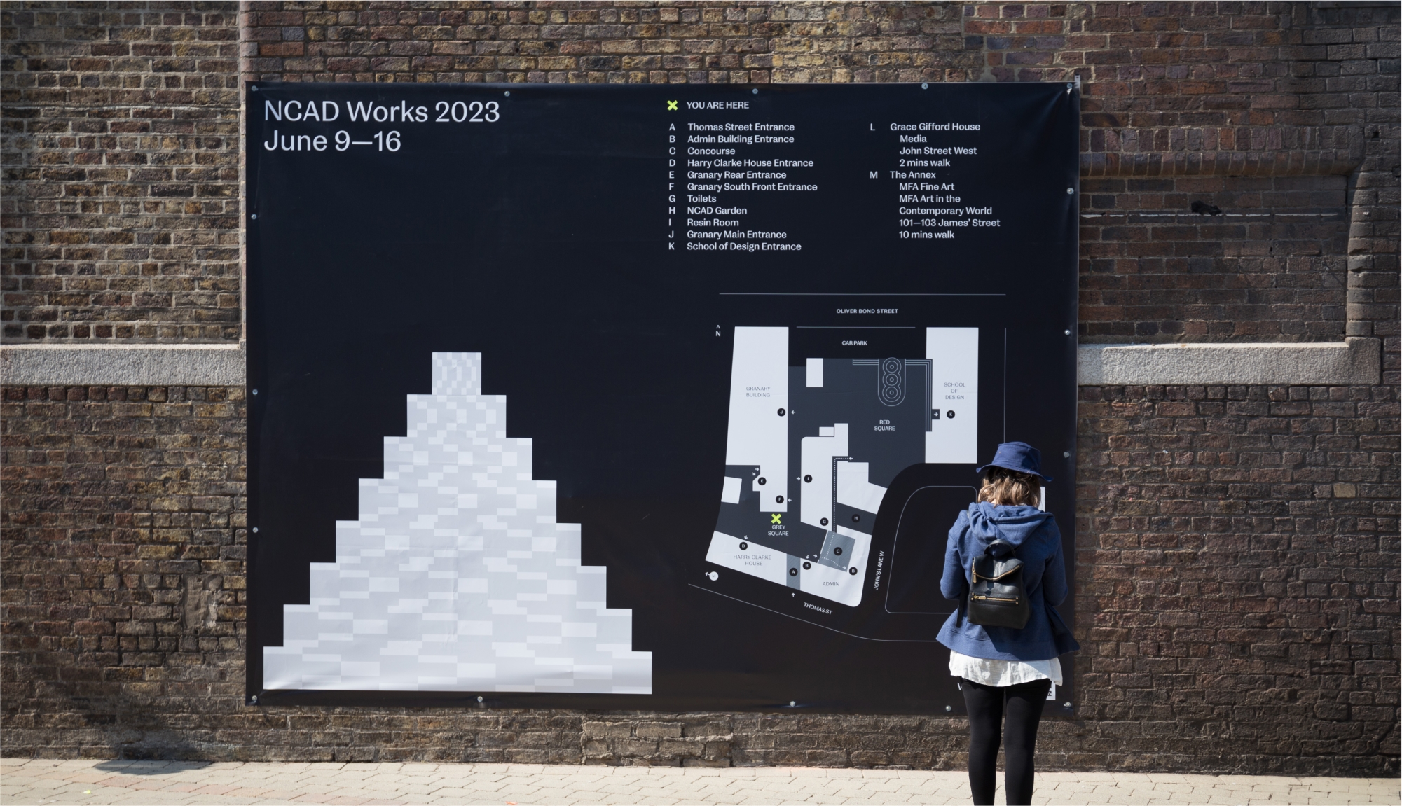 NCAD Works 2023's visual identity incorporates NCAD's bespoke Spenser typeface, a colour palette of black, white, grey, and an accent colour, all brought to life through the use of simple shapes. Initially, the four schools of NCAD served as inspiration for the shapes.