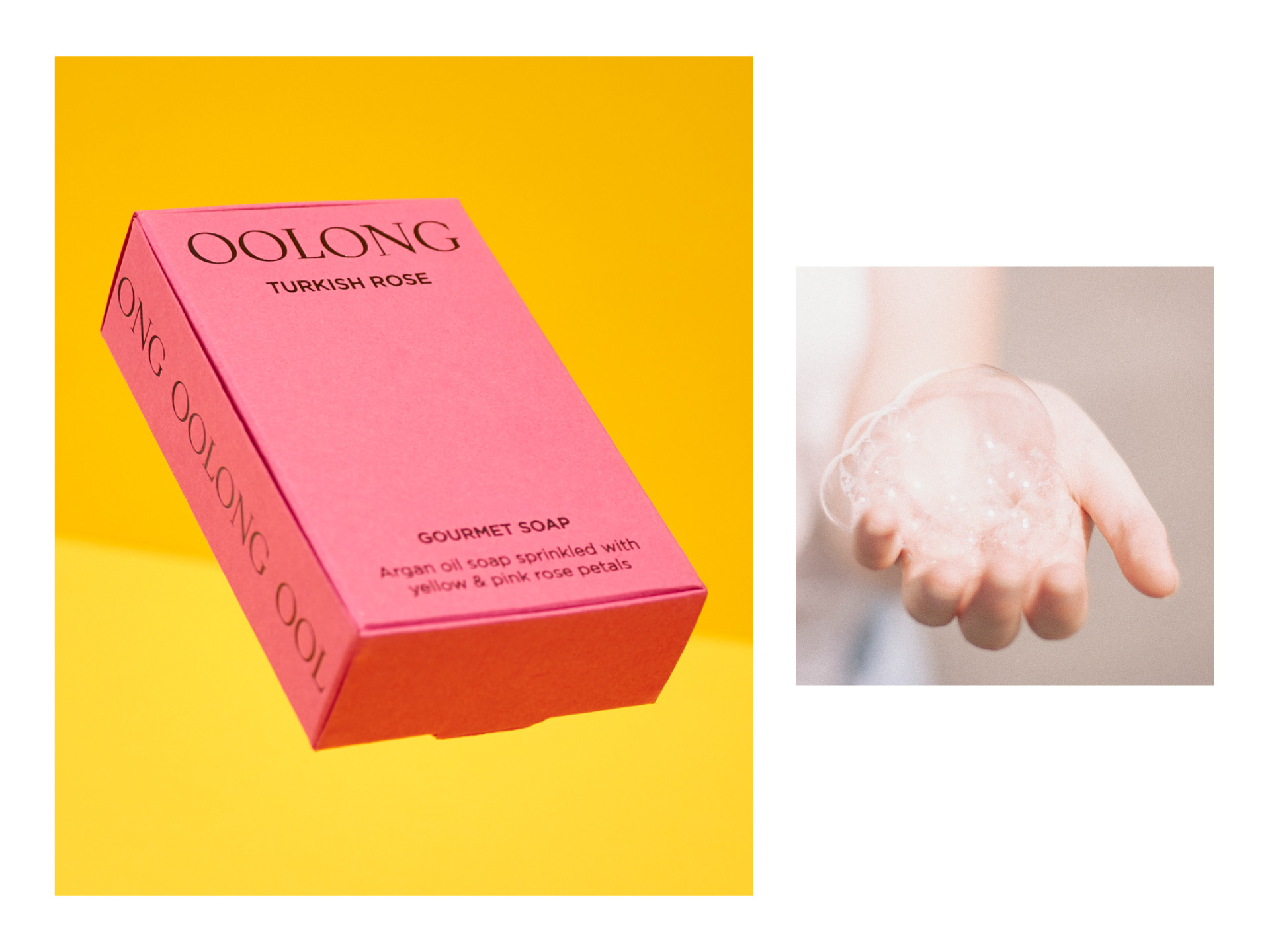 The new brand identity underlines the glamour and intrigue of Oolong. The mix of straight lines and curves brought a sense of calm to the brand. We brought this sense of clarity to all the brand communications – including tone of voice and photography. Using nature-inspired colors, we worked to communicate the true essence of the natural ingredients. The colors of the packaging are derived from the content of the soap’s ingredients (yellow and pink rose petals).
