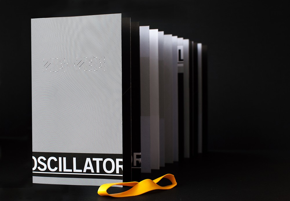 Science Gallery’s OSCILLATOR: EVERYTHING IN MOTION exhibition explores the vibrant vibratory world of motion, cycles and waves. The accompanying exhibition publication was created as an oscillation itself, to reflect and illustrate oscillations, which arise either by design, or by accident, and to show that they are often a critical component, essential for a system to function. The waves in the fold are used throughout to provide a constant feeling of movement, repetition and cycles. Oscillating page numbers provide a mathematical scheme that functions accurately within the system.