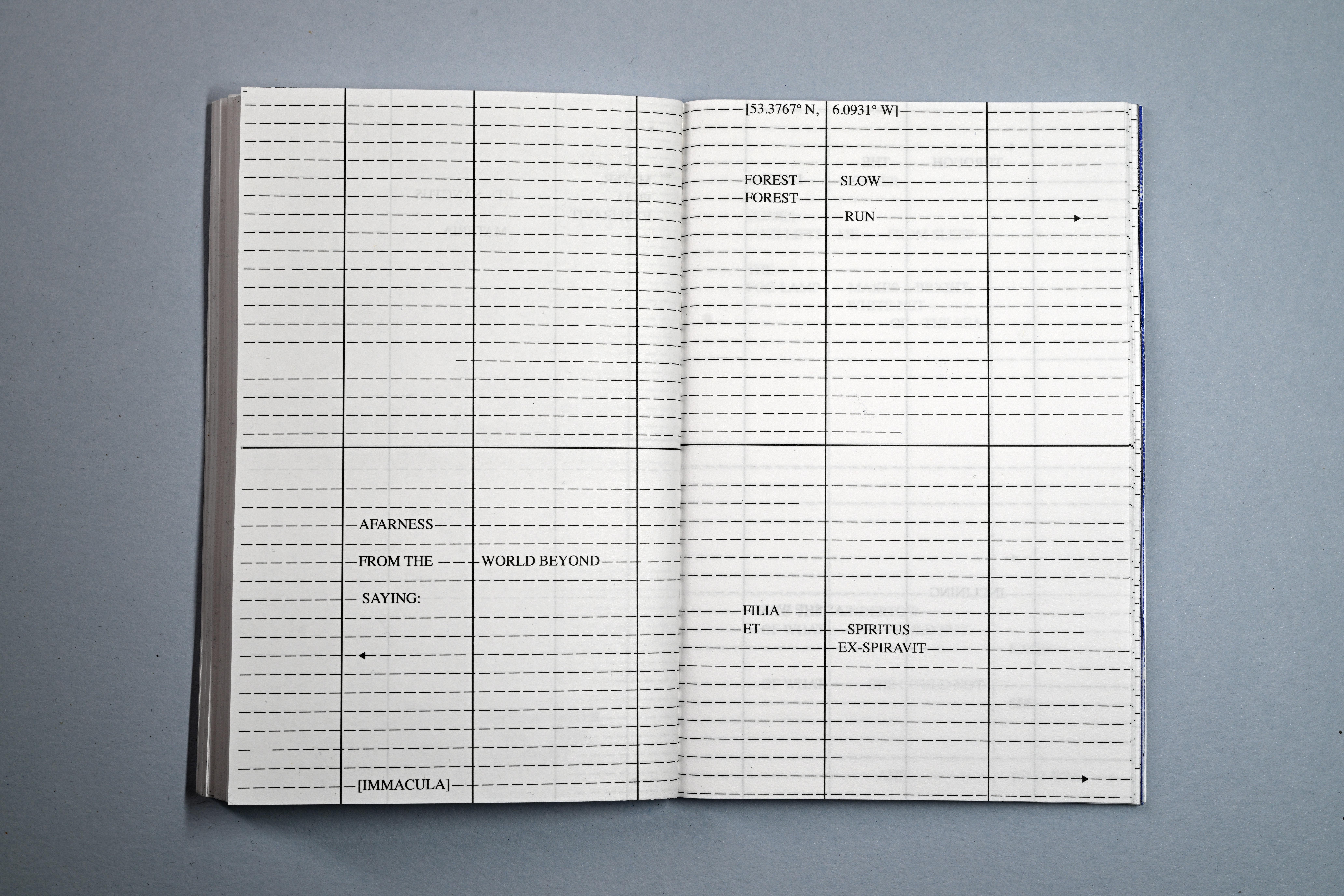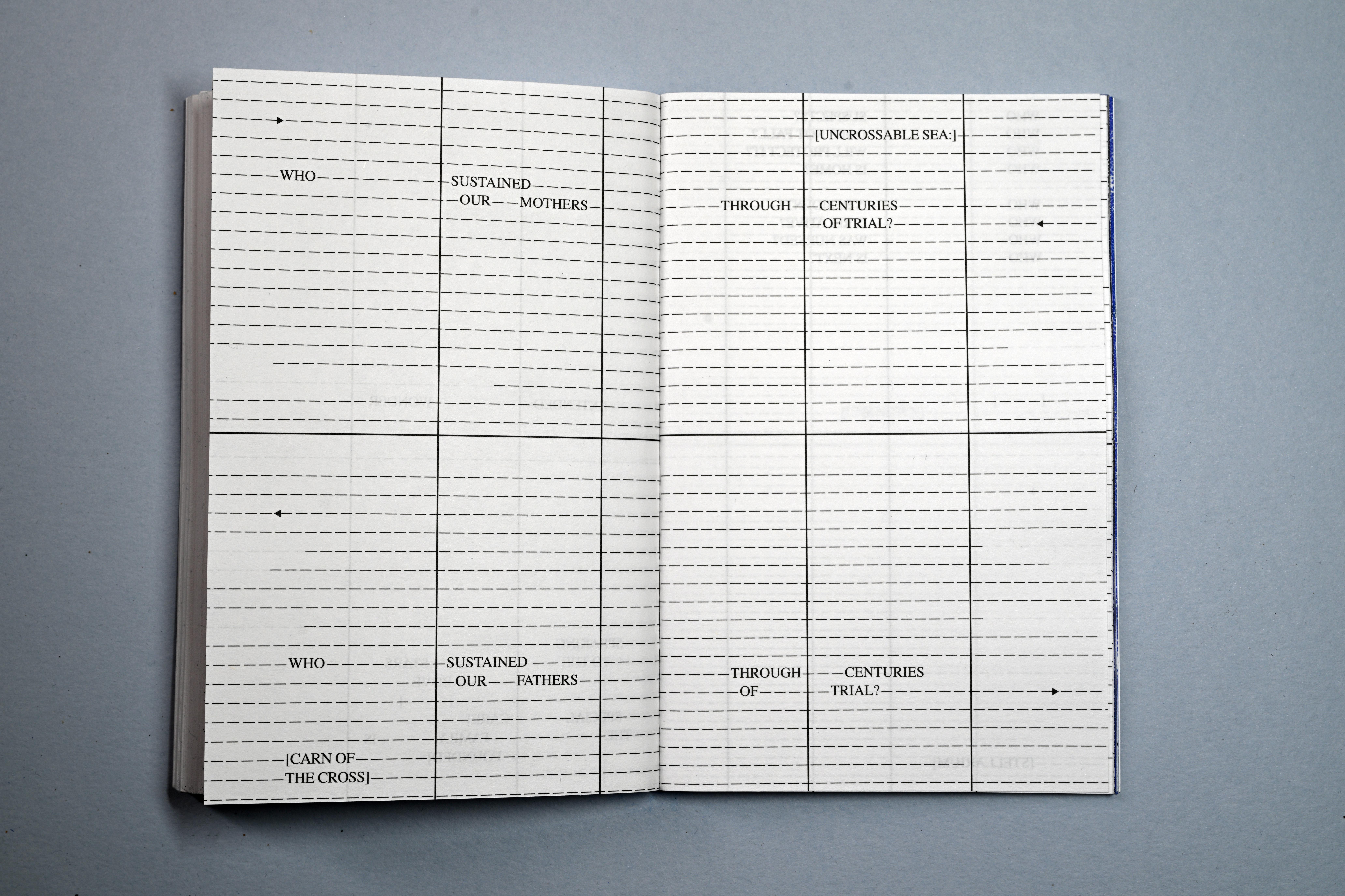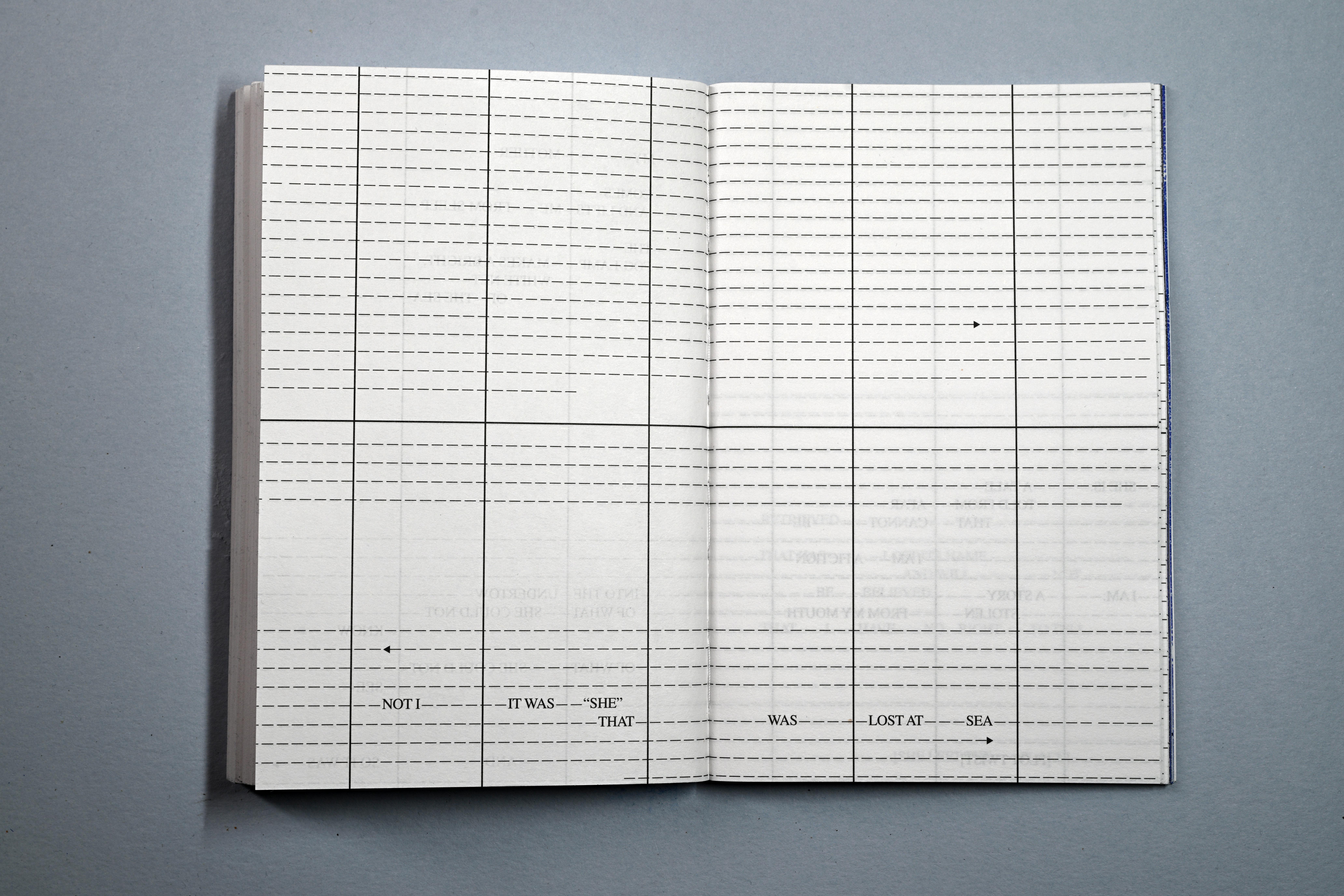 Persons Unknown is a piece of concrete poetry, (and slow writing) that was written and composed directly onto this series of pages, over a number of weeks, drawing from personal notebooks, kept over the course of time. It attempts to verbally, visually and typographically occupy and subvert the formal administration and paperwork required to avail of services offered by the Irish government in relation to the Birth Information and Tracing Act. Incorporating language taken directly from the official Birth Information and Tracing Application Form, and drawing on the de-personalised and alienating vernacular (both literal and visual) and typography of official bureaucracy, every line is written and designed to be read, as though on a voyage, across each double page spread, evocative of a maritime charts and musical scores—more hopeful and creative forms.