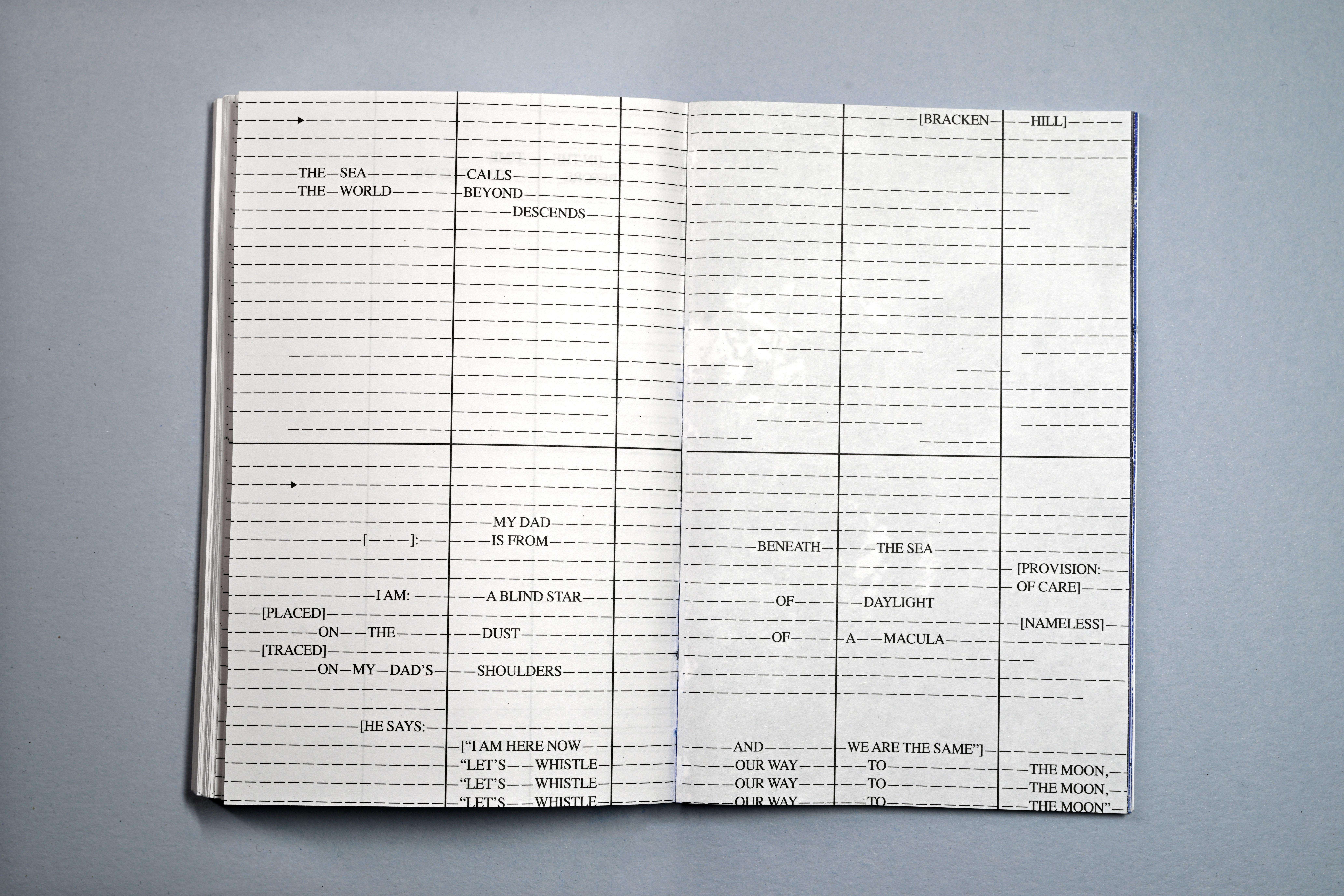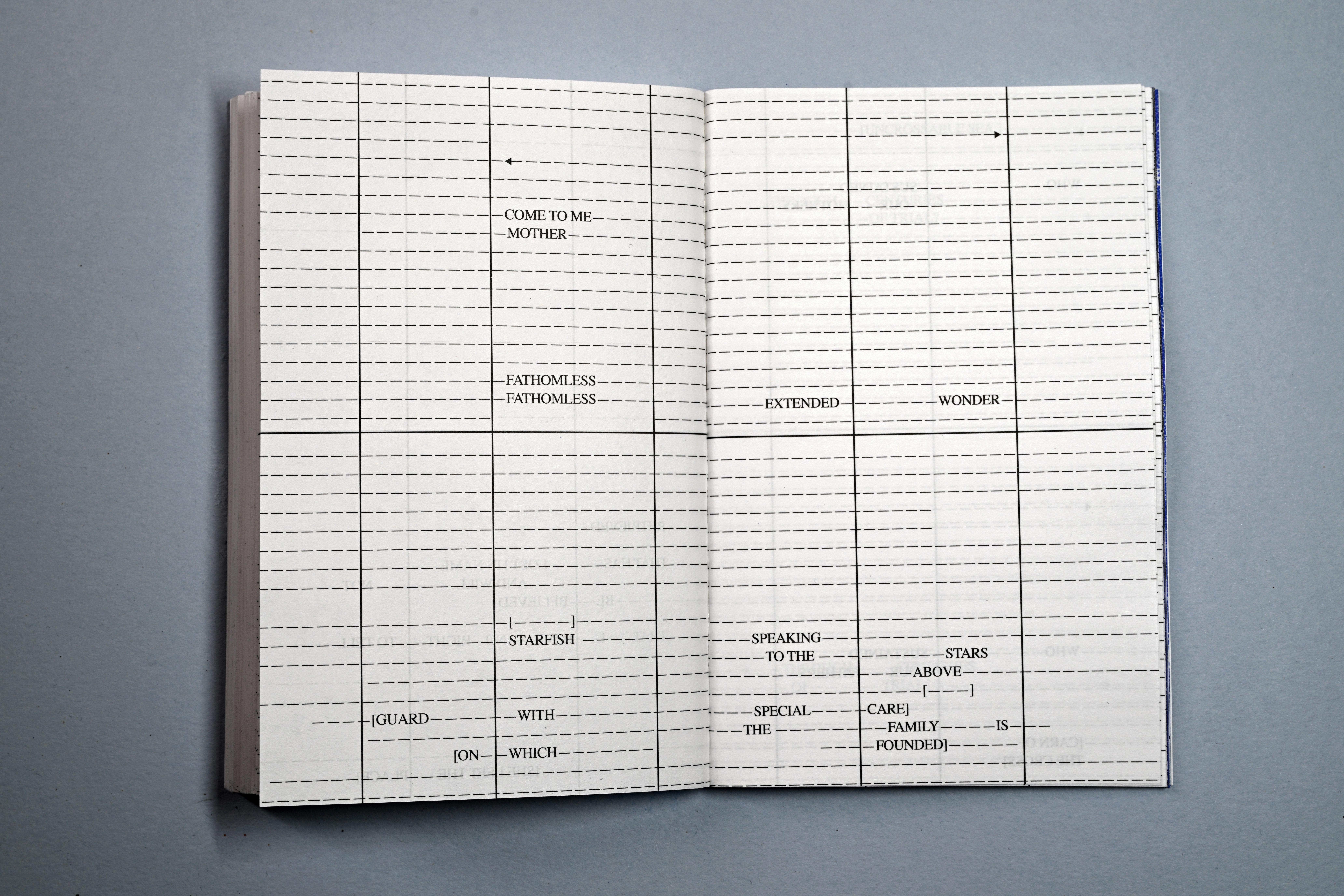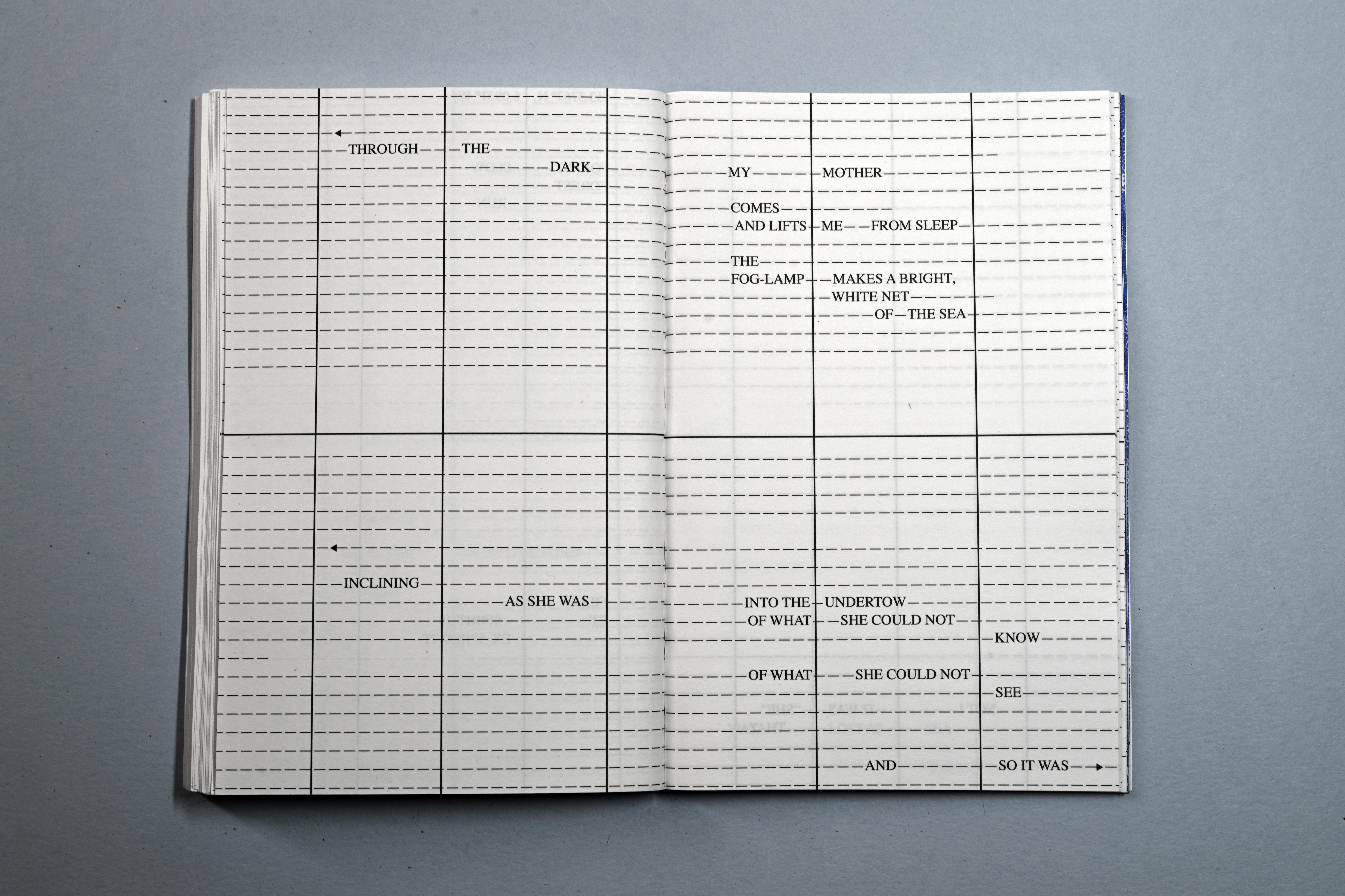 Persons Unknown is a piece of concrete poetry, (and slow writing) that was written and composed directly onto this series of pages, over a number of weeks, drawing from personal notebooks, kept over the course of time. It attempts to verbally, visually and typographically occupy and subvert the formal administration and paperwork required to avail of services offered by the Irish government in relation to the Birth Information and Tracing Act. Incorporating language taken directly from the official Birth Information and Tracing Application Form, and drawing on the de-personalised and alienating vernacular (both literal and visual) and typography of official bureaucracy, every line is written and designed to be read, as though on a voyage, across each double page spread, evocative of a maritime charts and musical scores—more hopeful and creative forms.