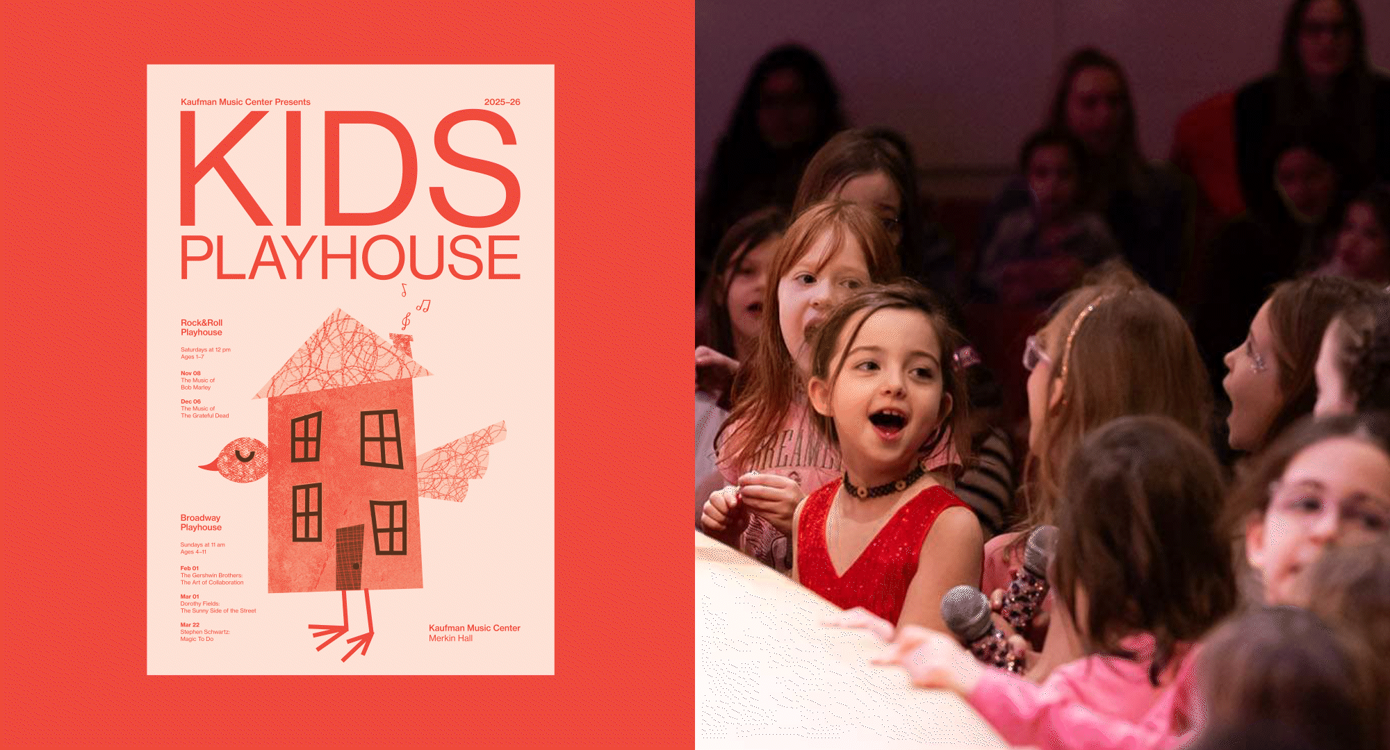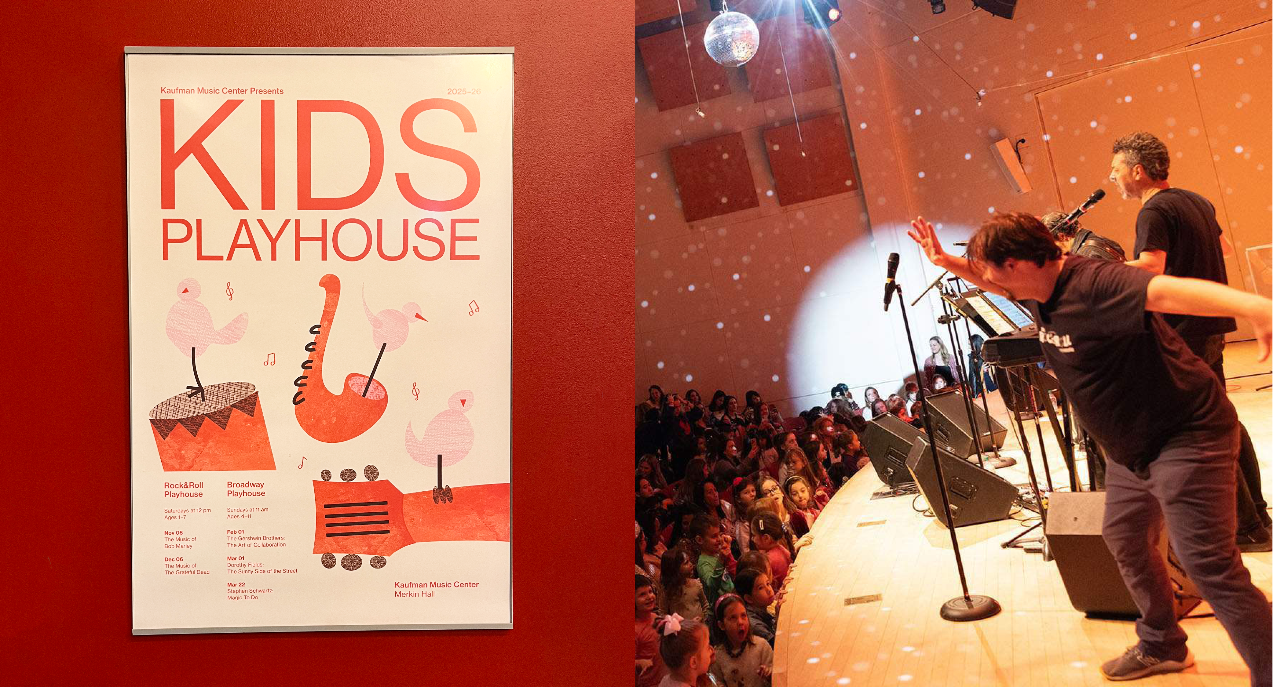 Rock and Roll Playhouse is an interactive concert series at Kaufman Music Center which aims to introduce young children to iconic rock music. This programme operates alongside Broadway Playhouse, which introduces children to the work of celebrated Broadway composers. These two initiatives, together known as Kids Playhouse, are designed to allow parents to enjoy the music they love while making live performance accessible for children aged 1-7.