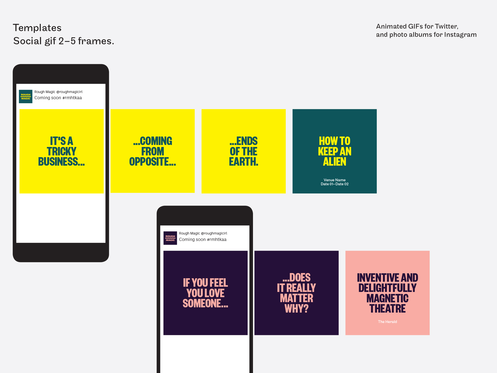 Using existing Rough Magic imagery, we built a system that uses colour and layout to create flexibility, and cropped-in imagery and bold typography to create consistency and create impact. To further push flexibility and consistency we created an animated 'stage' logo, that is used to promote a show or represent Rough Magic online.