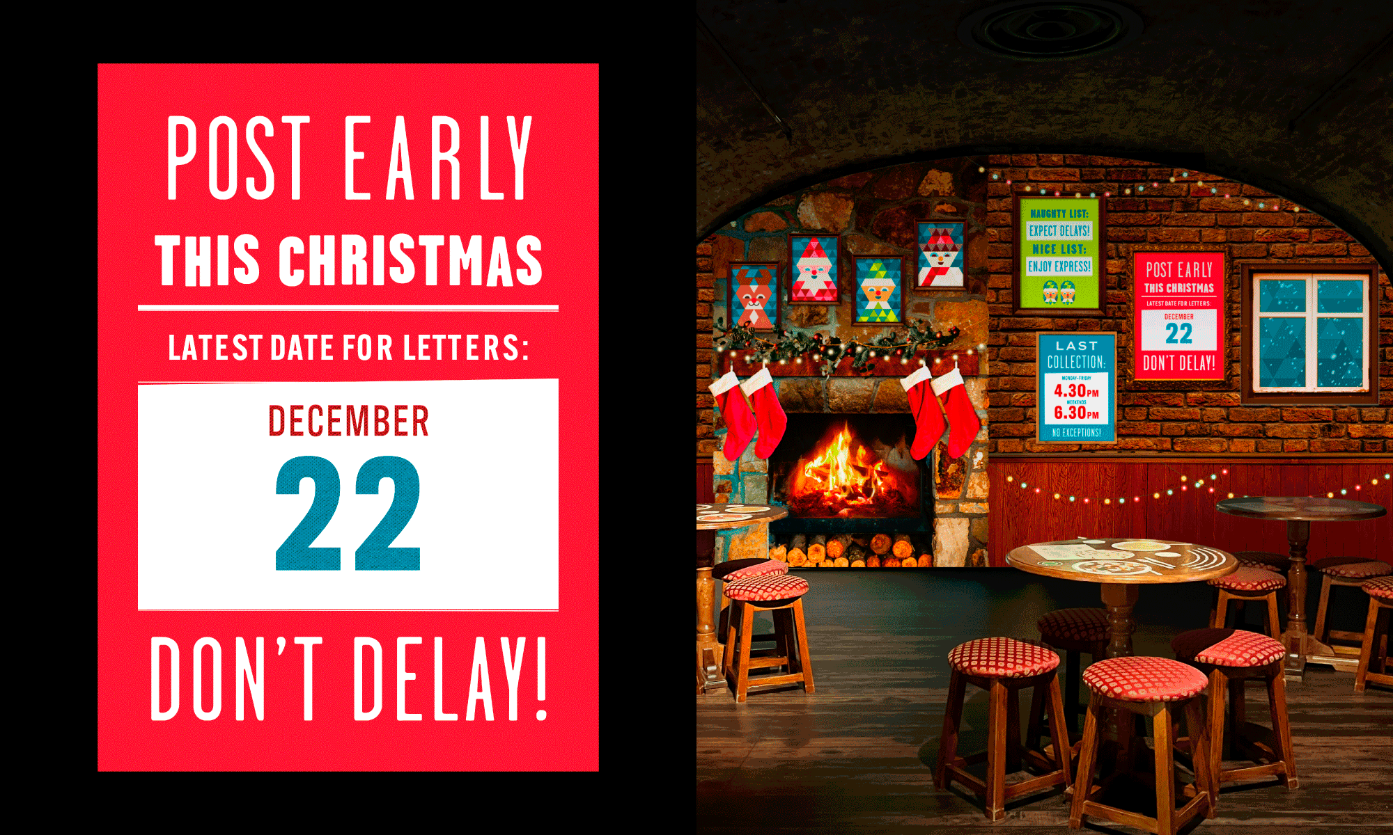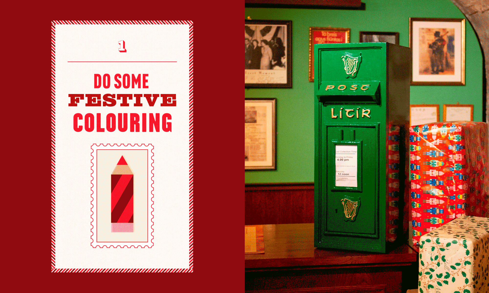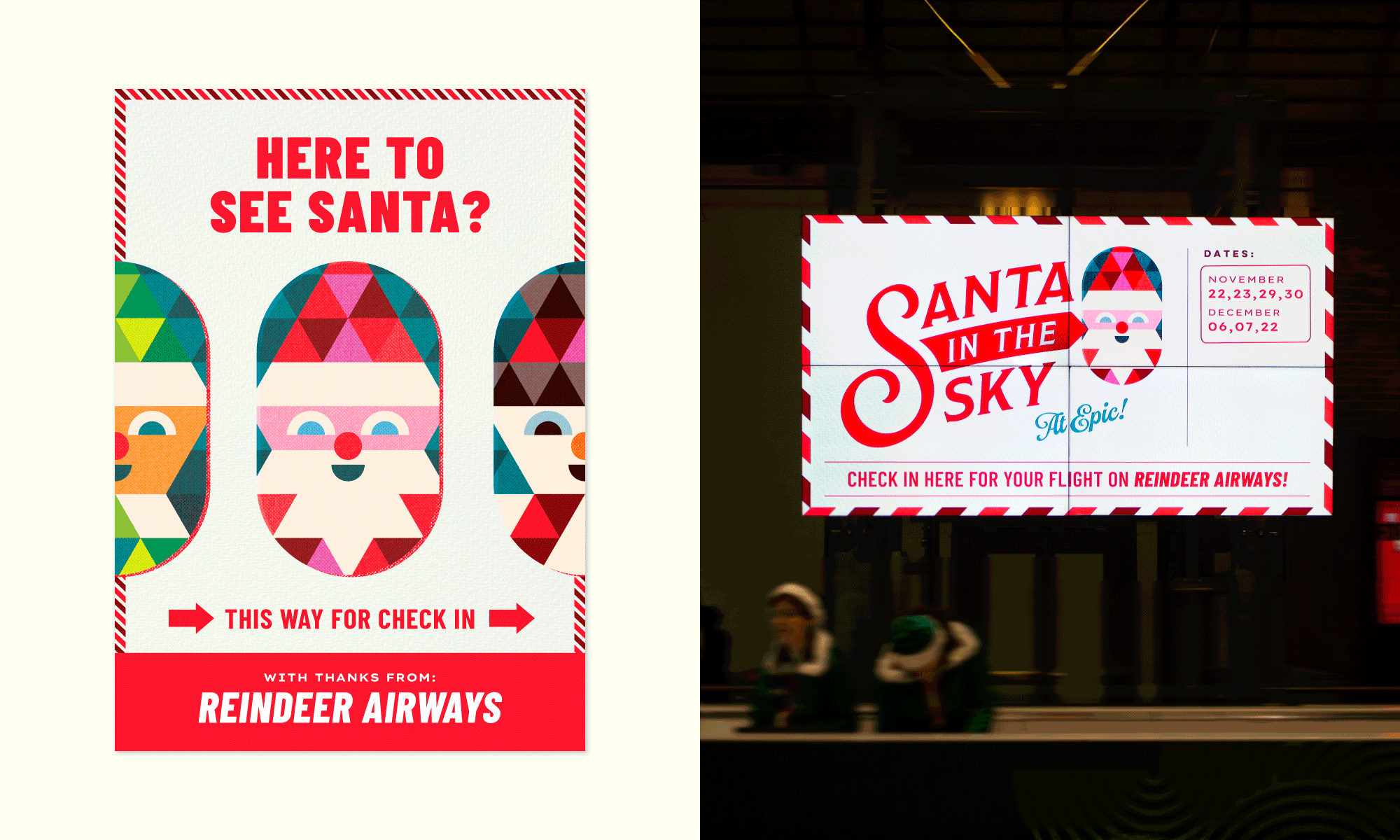 Every year, EPIC The Irish Emigration Museum offers children a unique Christmas experience. In 2025, this experience was Santa in the Sky, where kids got to meet Santa on his magical plane in the vaults at EPIC and take part in an array of festive activities, like letter-writing and Christmas storytelling, in EPIC’s own Irish pub-turned-post office. The experience needed its own unique visual identity which would be fun and engaging for both children and their adults, and would work across marketing materials, museum way-finding, digital displays and printed materials to bring the experience to life.