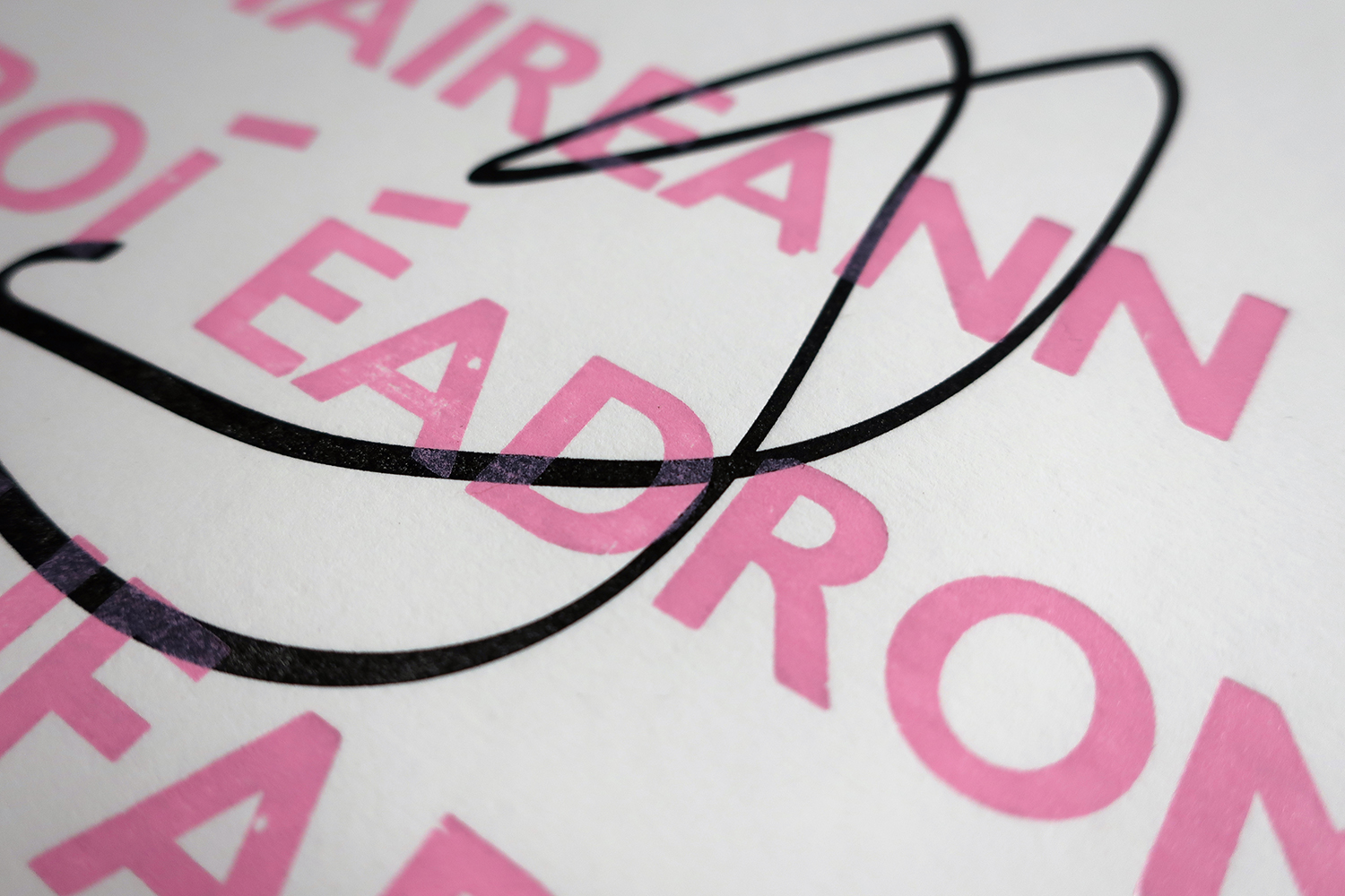 Maireann Croí Éadrom i Bhfad — A Light Heart Lives Long. Created by OSA as part of Seanfhocail, curated by Hen's Teeth for St. Patrick's Festival. Letterpress printed in 5 colours using a combination of metal type, wood type, rules, ornaments and plates.