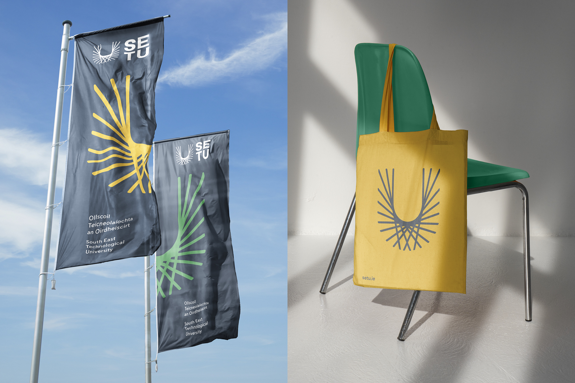 The SETU ‘U’ features as a key graphic element, flexing in size and crop. Used as a shape to hold imagery, text or colour, individual strands can also be used to frame and highlight.