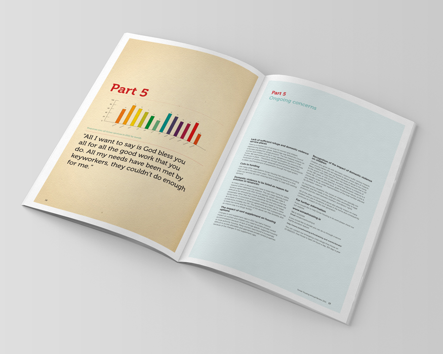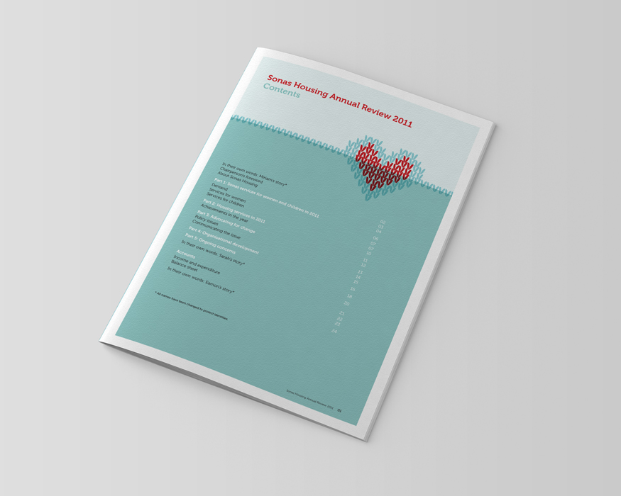 We were approached by Sonas to design their 2011 annual report, after an initial meeting we decided that the working title for the publication should be 'A Positive Space' to reflect the supportive ethos of the organisation, we then set about creating a graphic illustration to reflect this and to set the tone for the rest of the publication. Each section is delineated with a positive statistic outlining the importance of Sonas' role in giving refuge and support to women and children experiencing domestic violence. There is also a quote from women and children who have experienced this positive support in their lives throughout the years.